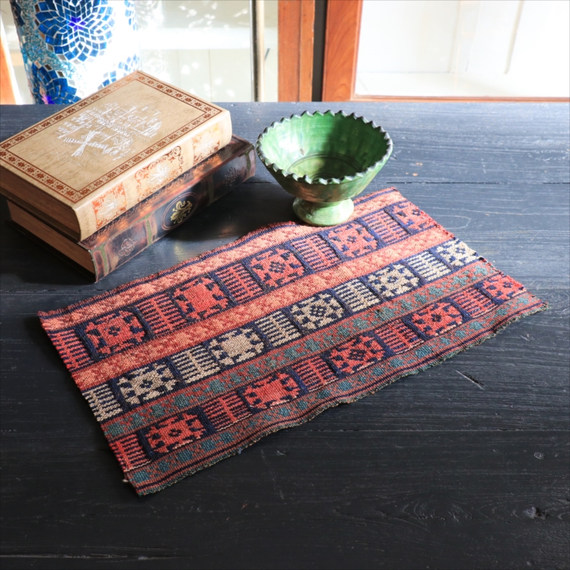 イラン北部のテント飾りに使われていたキリム。幅30~40cmのベルト状に長く長く織られたキリムをカットして、8~10枚ほどはぎ合わせて、一枚の大きな布にして使っていたものです。このピースは、実際に家庭で使われていた古い時代のキリムを、小さなピースにカットしたものです。