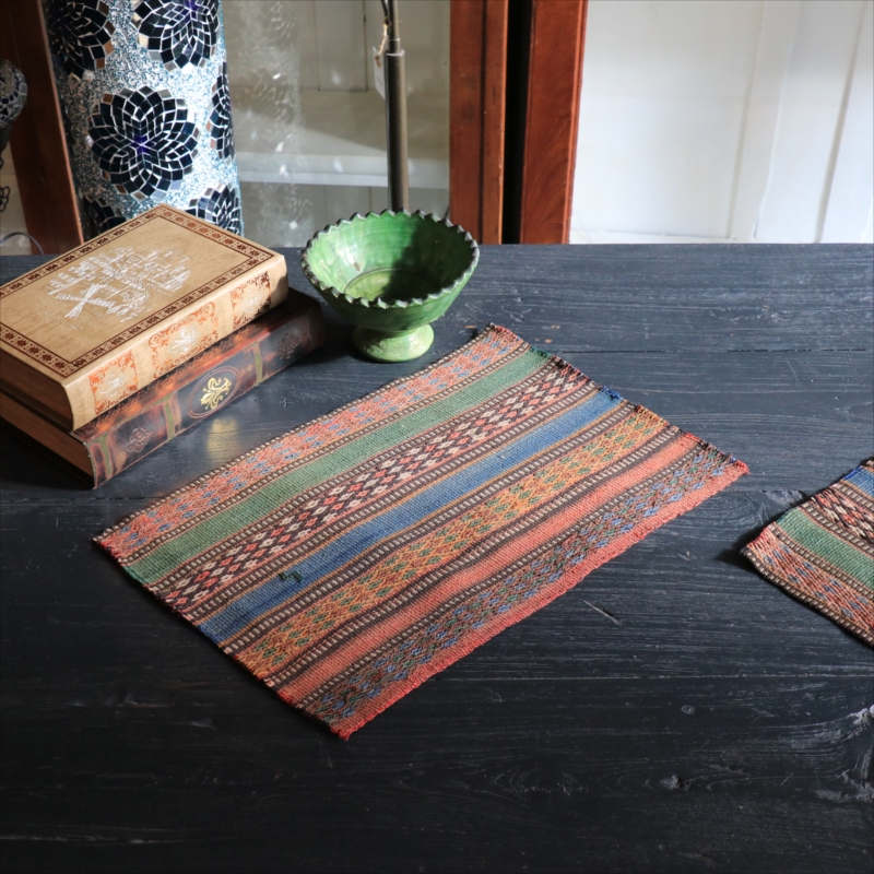 イラン北部のテント飾りに使われていたキリム。幅30~40cmのベルト状に長く長く織られたキリムをカットして、8~10枚ほどはぎ合わせて、一枚の大きな布にして使っていたものです。このピースは、実際に家庭で使われていた古い時代のキリムを、小さなピースにカットしたものです。