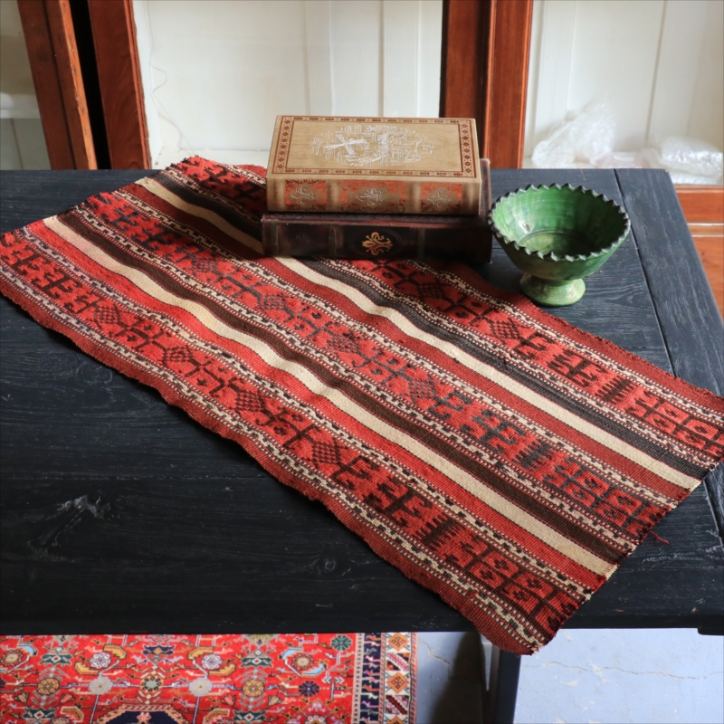 イラン北部のテント飾りに使われていたキリム。幅30~40cmのベルト状に長く長く織られたキリムをカットして、8~10枚ほどはぎ合わせて、一枚の大きな布にして使っていたものです。このピースは、実際に家庭で使われていた古い時代のキリムを、小さなピースにカットしたものです。