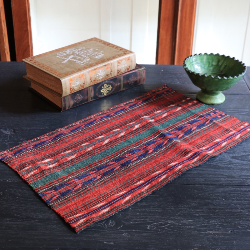 イラン北部のテント飾りに使われていたキリム。幅30~40cmのベルト状に長く長く織られたキリムをカットして、8~10枚ほどはぎ合わせて、一枚の大きな布にして使っていたものです。このピースは、実際に家庭で使われていた古い時代のキリムを、小さなピースにカットしたものです。