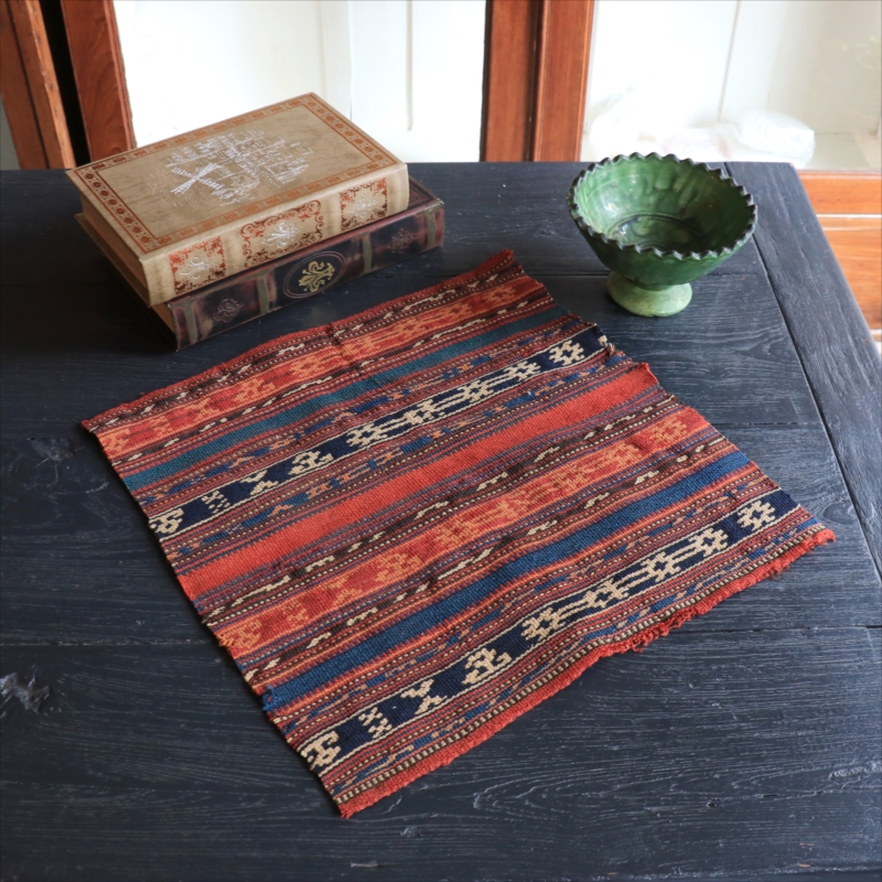 イラン北部のテント飾りに使われていたキリム。幅30~40cmのベルト状に長く長く織られたキリムをカットして、8~10枚ほどはぎ合わせて、一枚の大きな布にして使っていたものです。このピースは、実際に家庭で使われていた古い時代のキリムを、小さなピースにカットしたものです。
