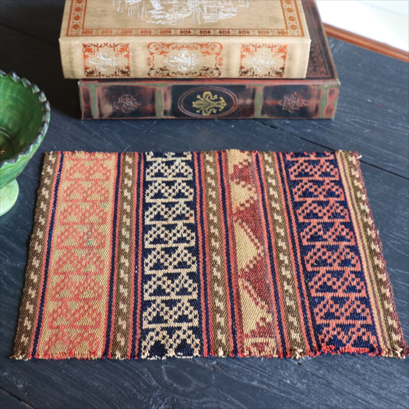 イラン北部のテント飾りに使われていたキリム。幅30~40cmのベルト状に長く長く織られたキリムをカットして、8~10枚ほどはぎ合わせて、一枚の大きな布にして使っていたものです。このピースは、実際に家庭で使われていた古い時代のキリムを、小さなピースにカットしたものです。