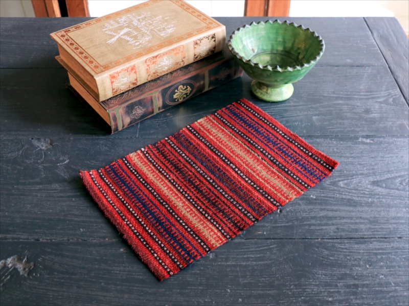 イラン北部のテント飾りに使われていたキリム。幅30~40cmのベルト状に長く長く織られたキリムをカットして、8~10枚ほどはぎ合わせて、一枚の大きな布にして使っていたものです。このピースは、実際に家庭で使われていた古い時代のキリムを、小さなピースにカットしたものです。