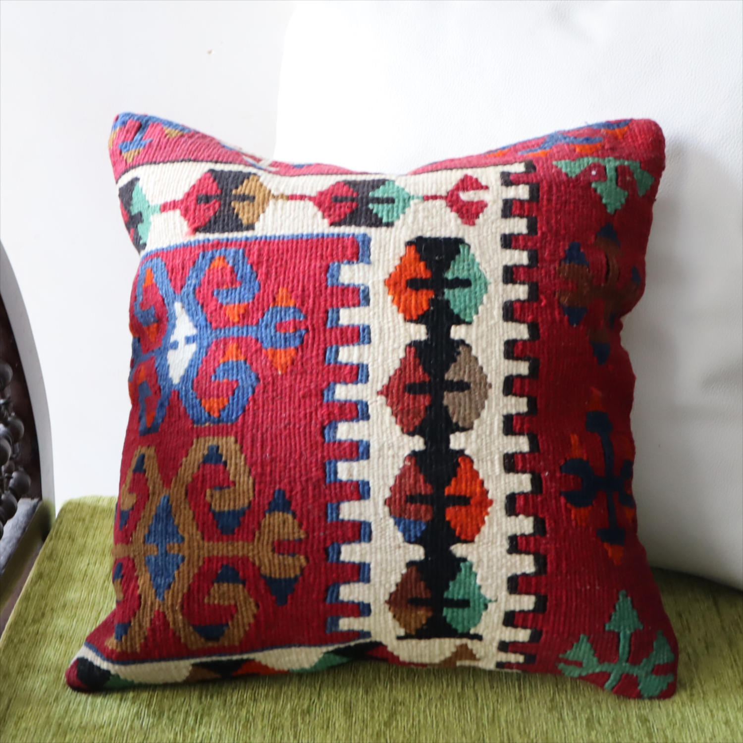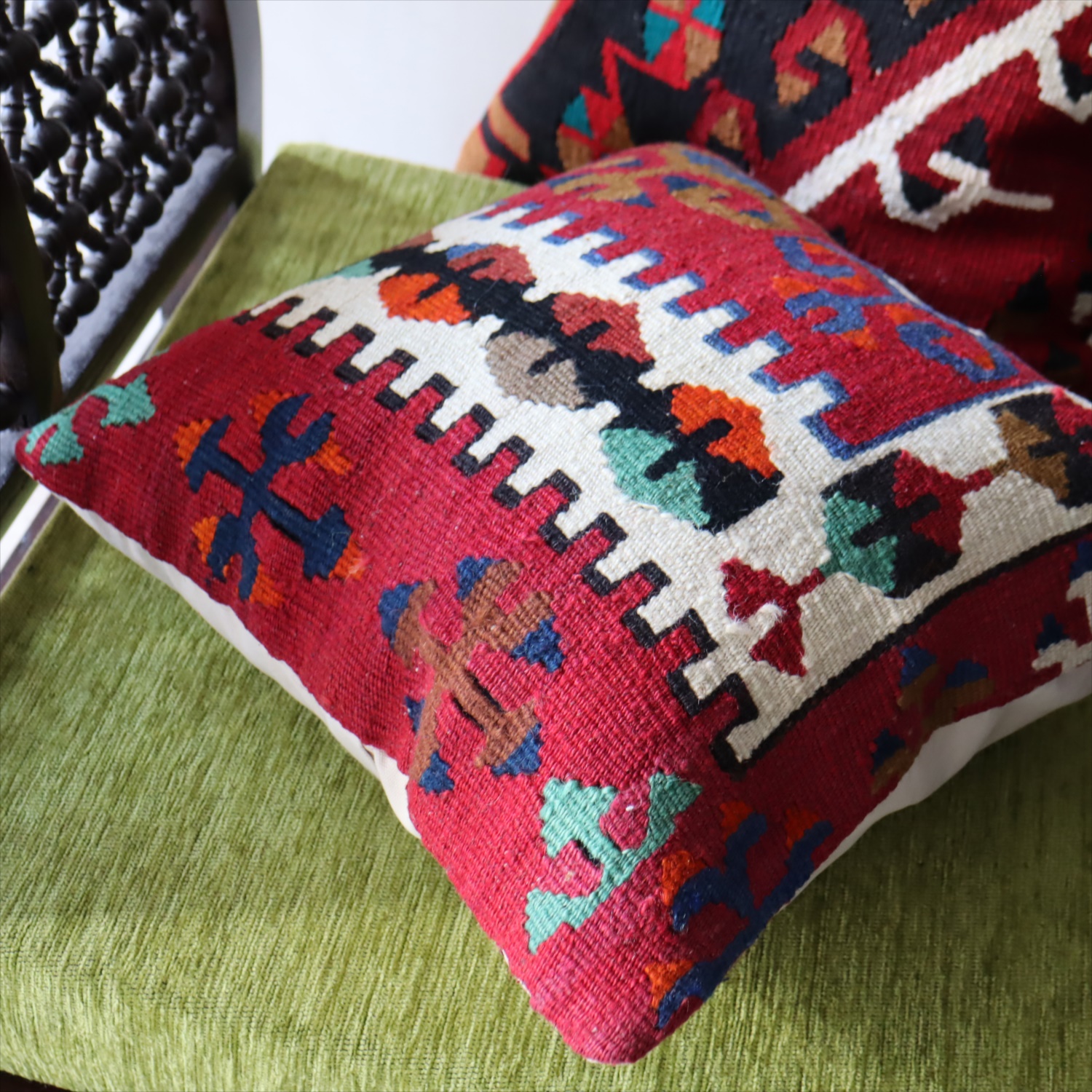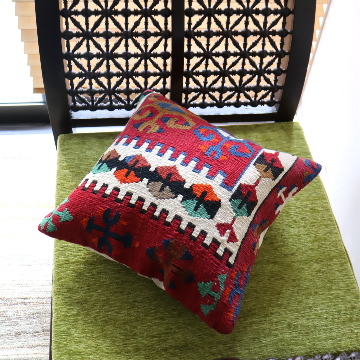 細い糸を使って織られた大型の平織りキリムをカットして作ったクッションカバーです。表面はウールのヴィンテージキリム、裏面は無地のコットン地です。