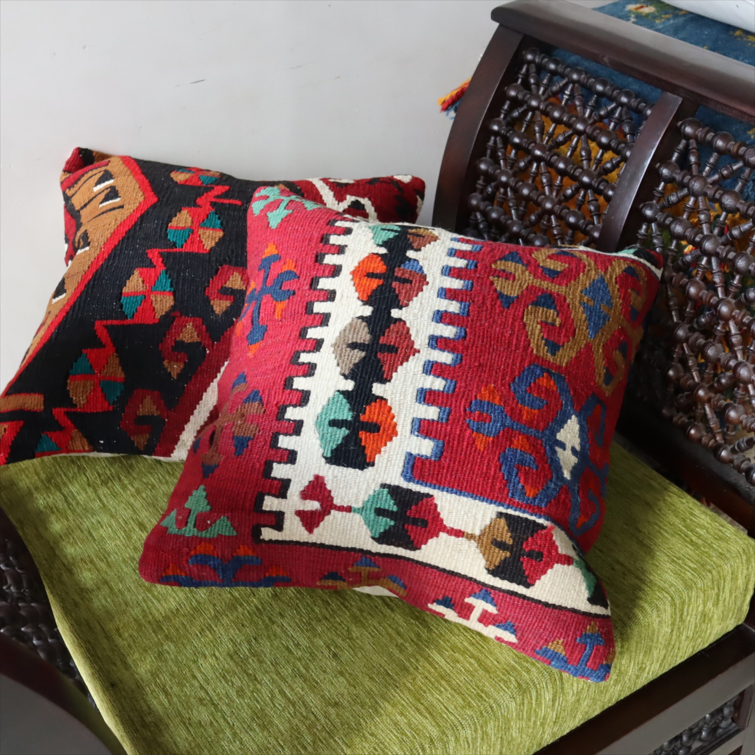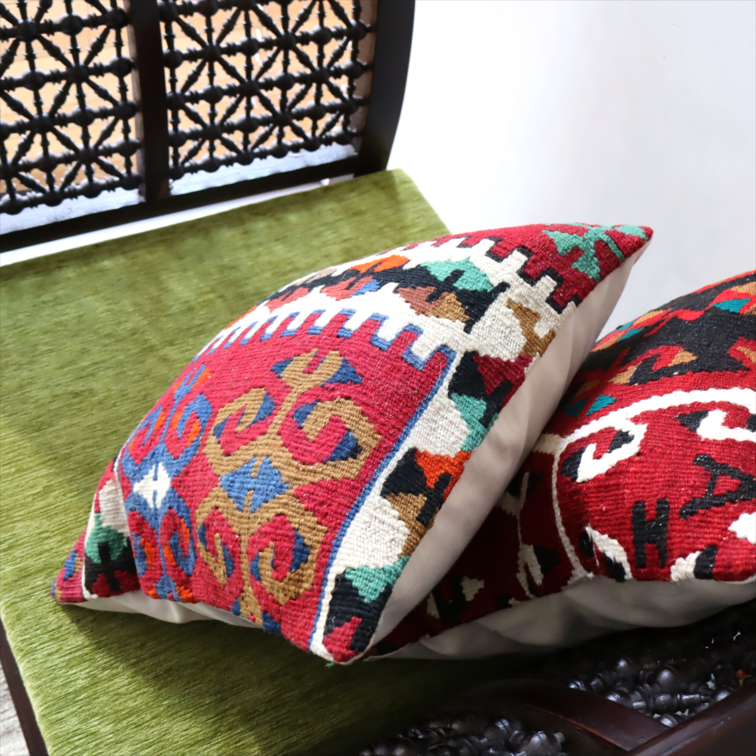 クッションカバーにすると、一枚のキリムから50枚以上に切り分けられるものもあり、配色が似ていてモチーフのバランスが違うクッションができあがります。