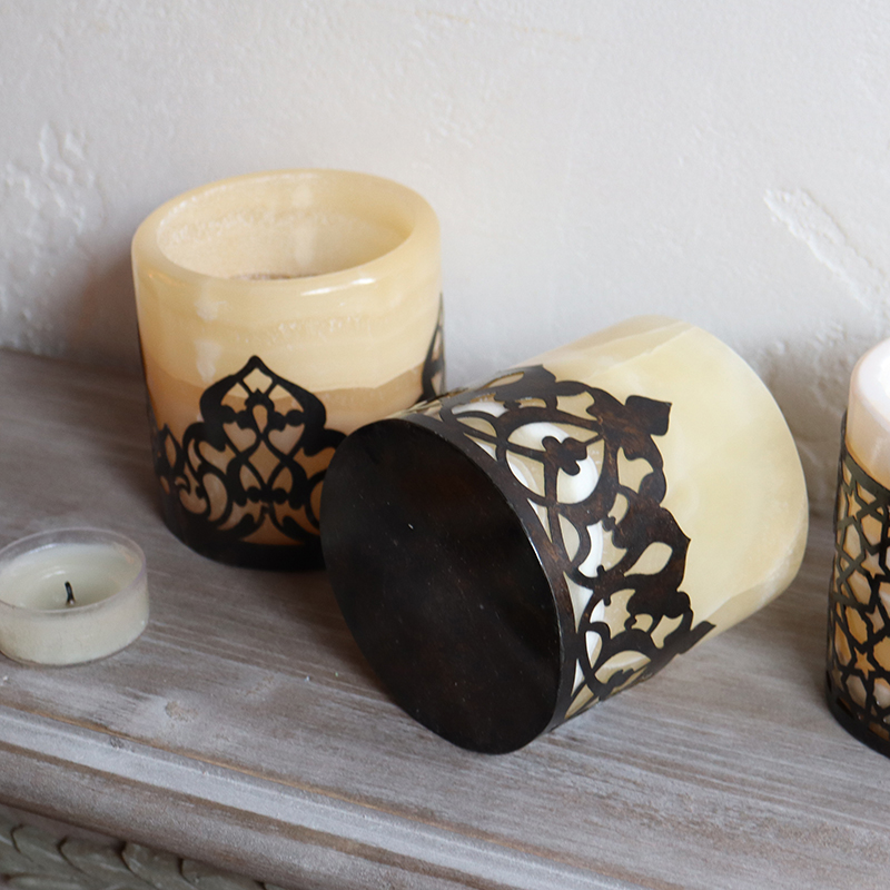 エジプト産のアラバスターという白い鉱石を使用したキャンドルホルダー。アラベスク模様のアイアンにアラバスターが収まるように作られています。キャンドルを灯し、ぼんやりとした幻想的な灯りをお楽しみ下さい。