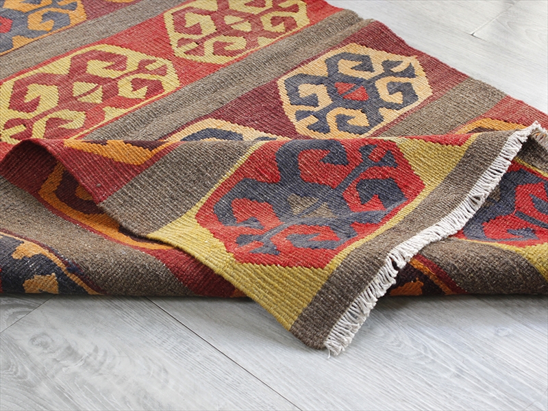 細長いキリムからカットされたため、縦方向のサイズはオリジナルではありません。織り地は目が詰まってやや薄手。縦糸にコットンが使われていますので、しっかりとしています。