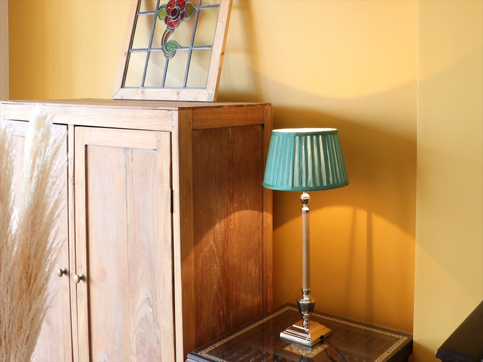 ランプベースは、ビーチウッドとメタルのコンビネーションで、クラシカルなイメージ。グリーンのシェードは、シャンタンのようなテクスチャがあり上品です。