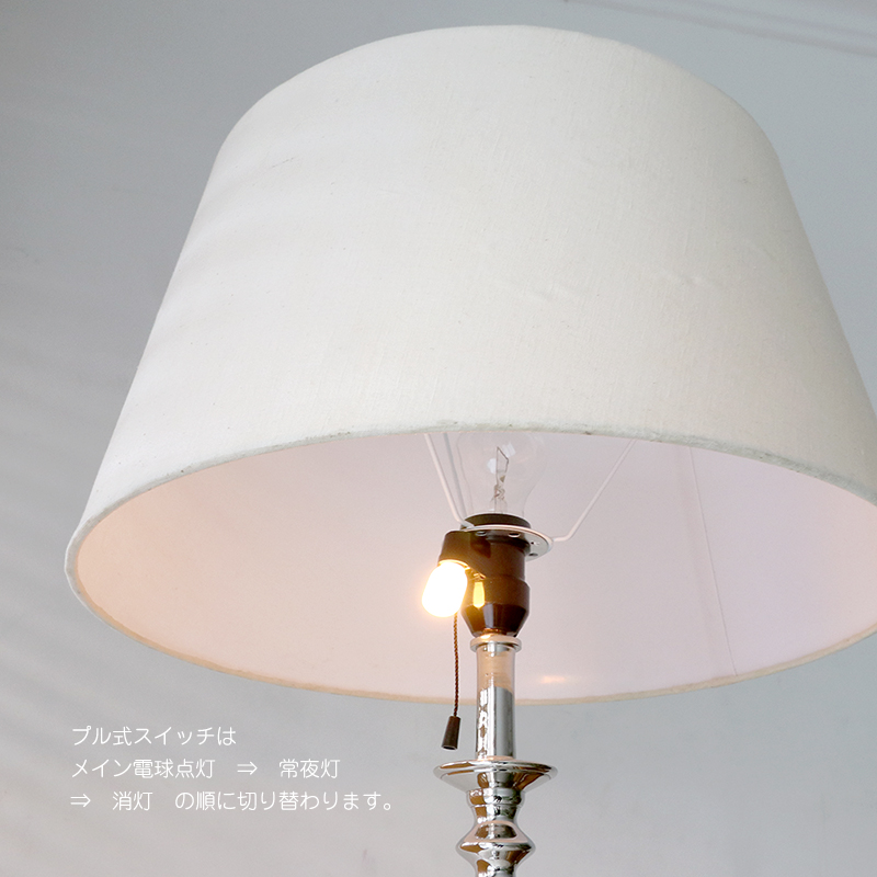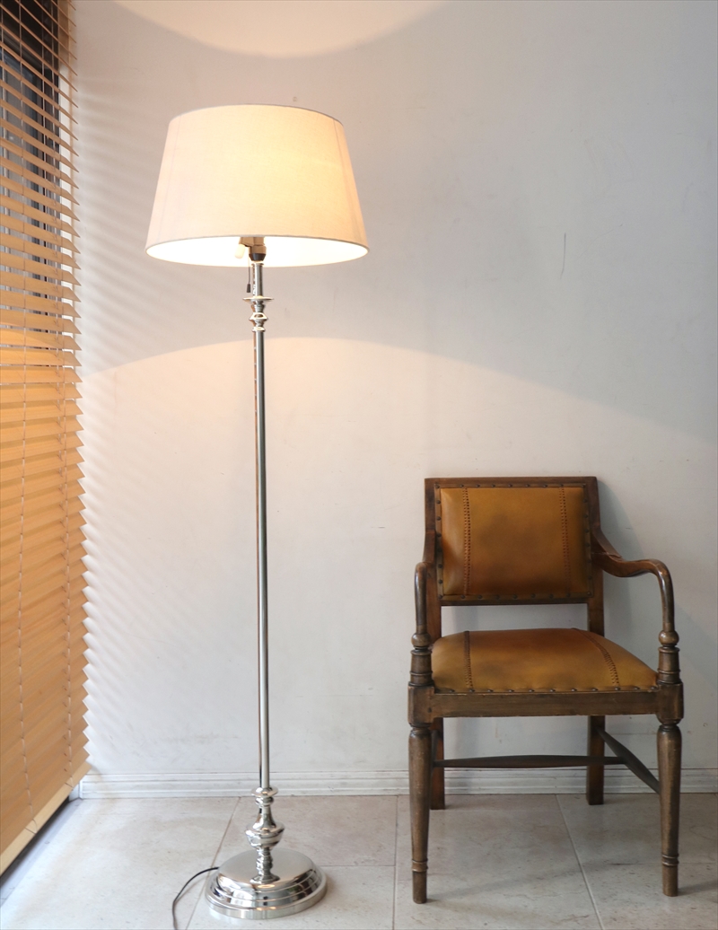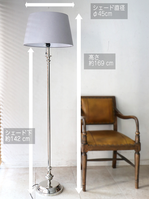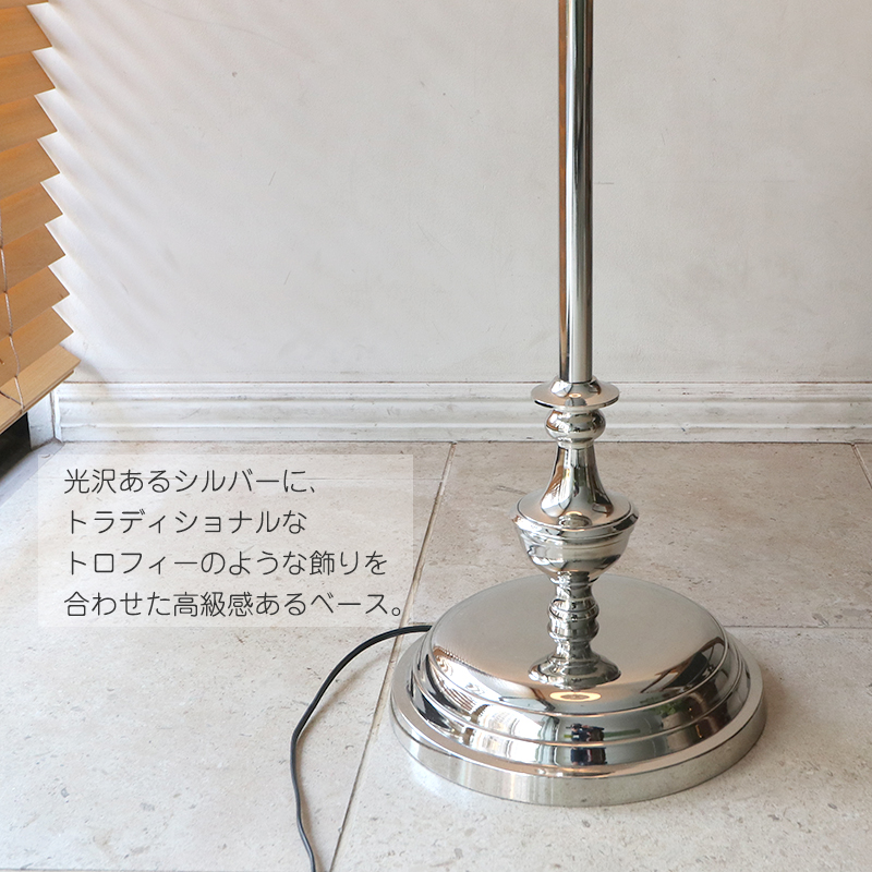 光沢のあるシルバーにトロフィーのような飾りを合わせた高級感あるフロアランプです。シェードを含めた高さは169cmと、高さのあるデザインで存在感のあるホテルライクな仕様です。天井照明を使わずにこのフロアランプ一灯だけでも、ムードあるライティングになります。もちろん、ダウンライト等と合わせて間接照明としても活躍してくれます。