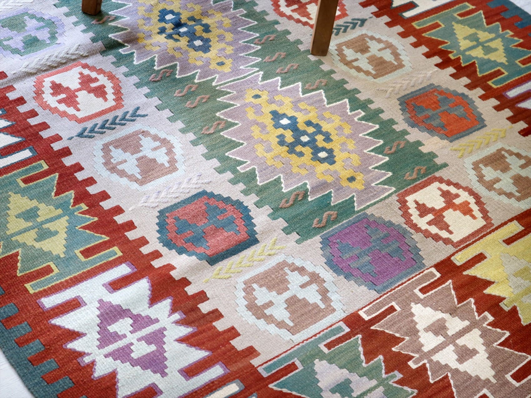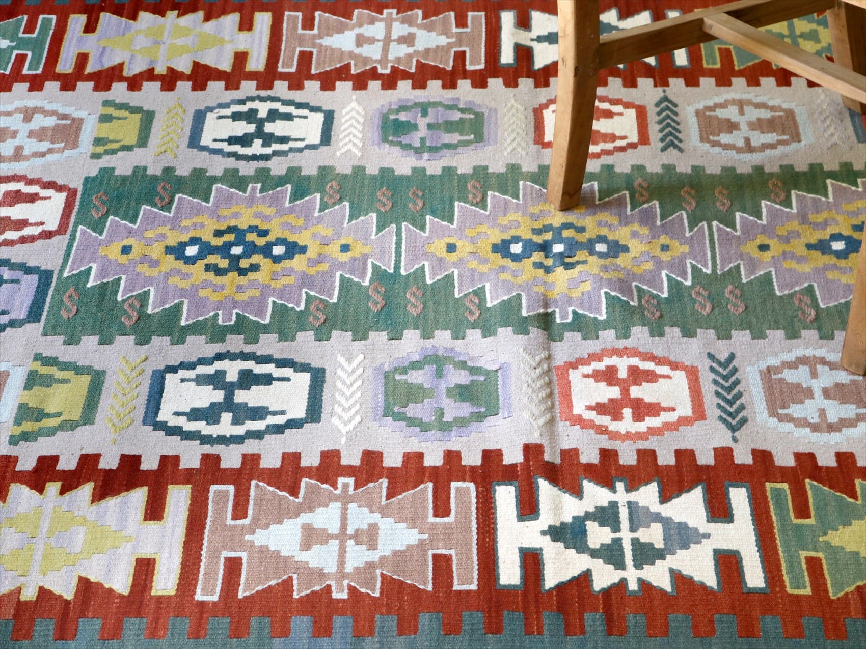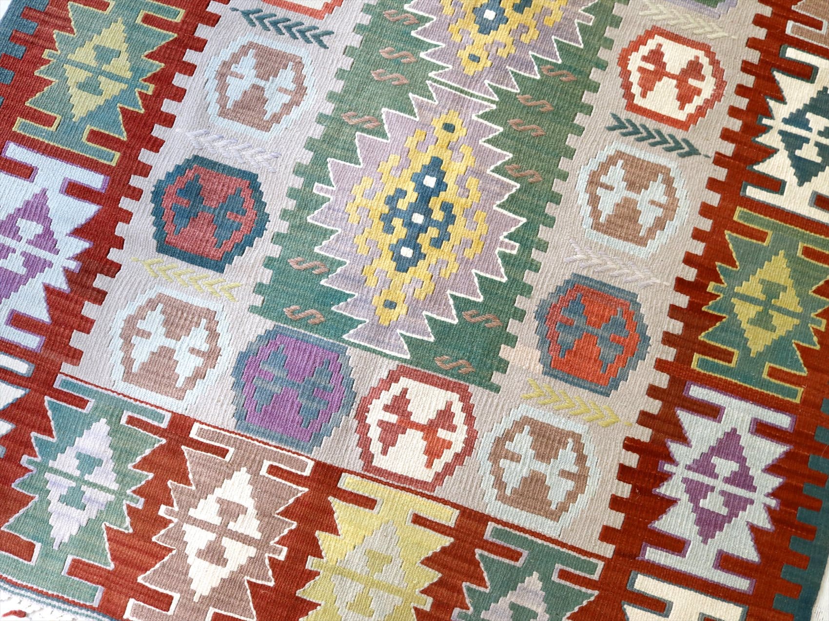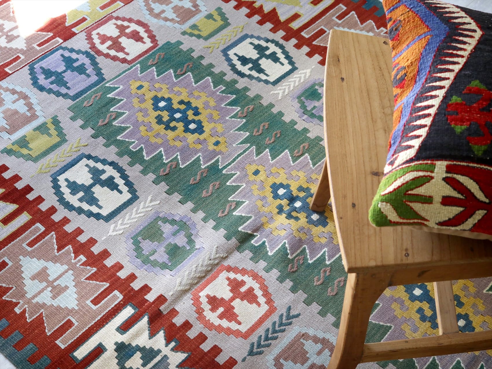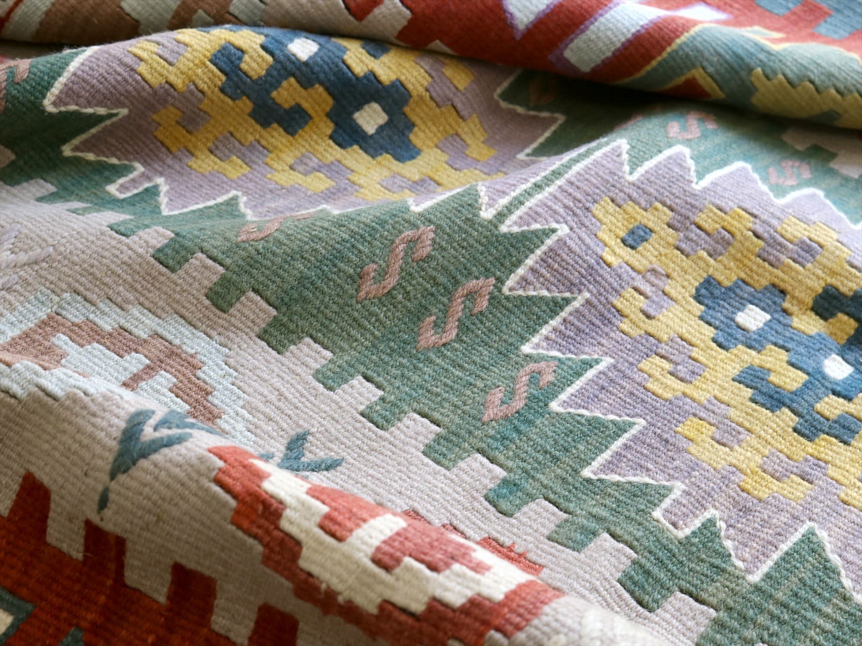織り地がしなやかでやわらかいのがカイセリキリムの特徴です。やや厚みがあり、やさしい肌触り。色の切り替え部分には、キリムの織りの特徴で、縦に隙間が開いています(スリットと呼んでいます)。