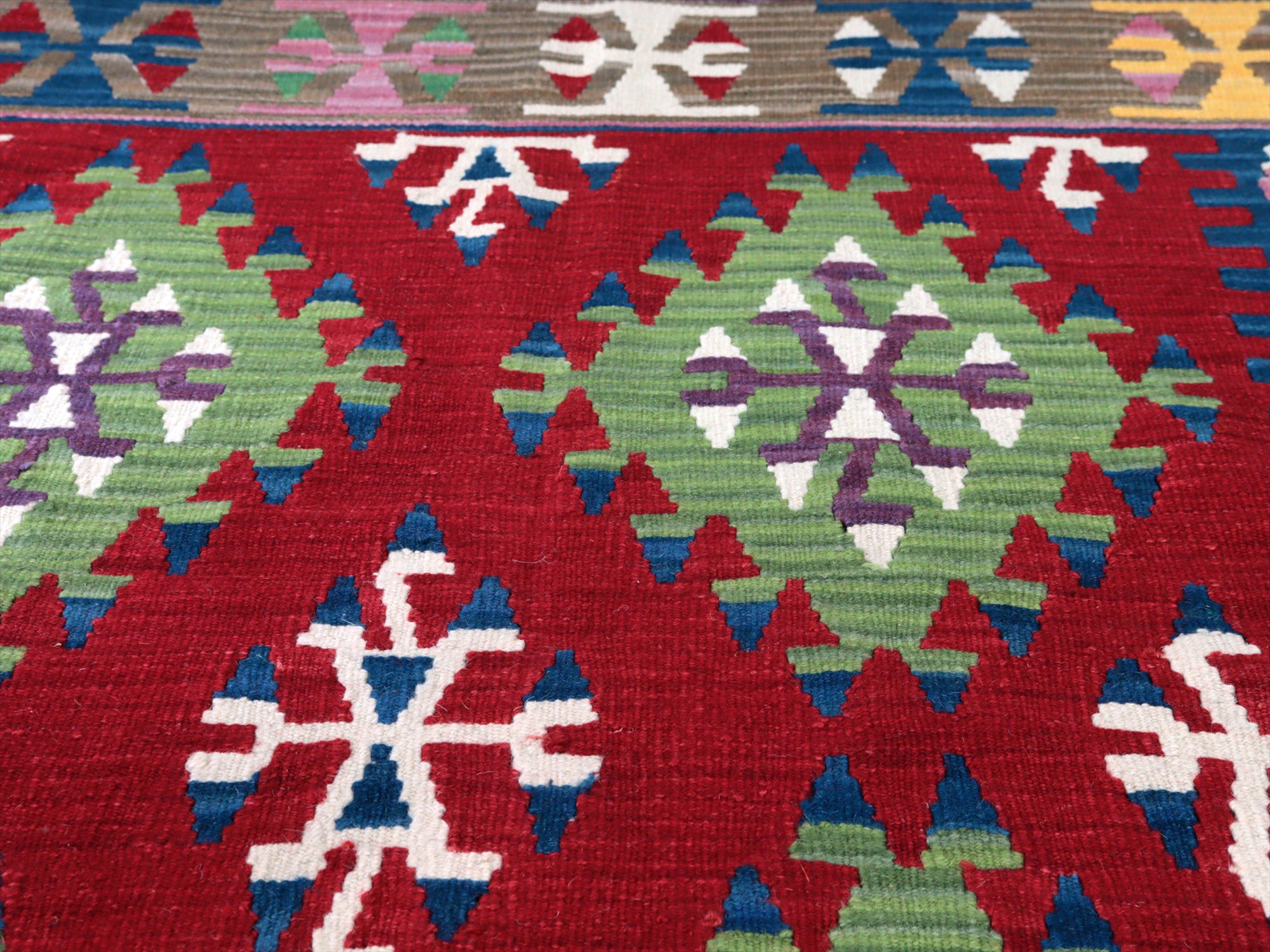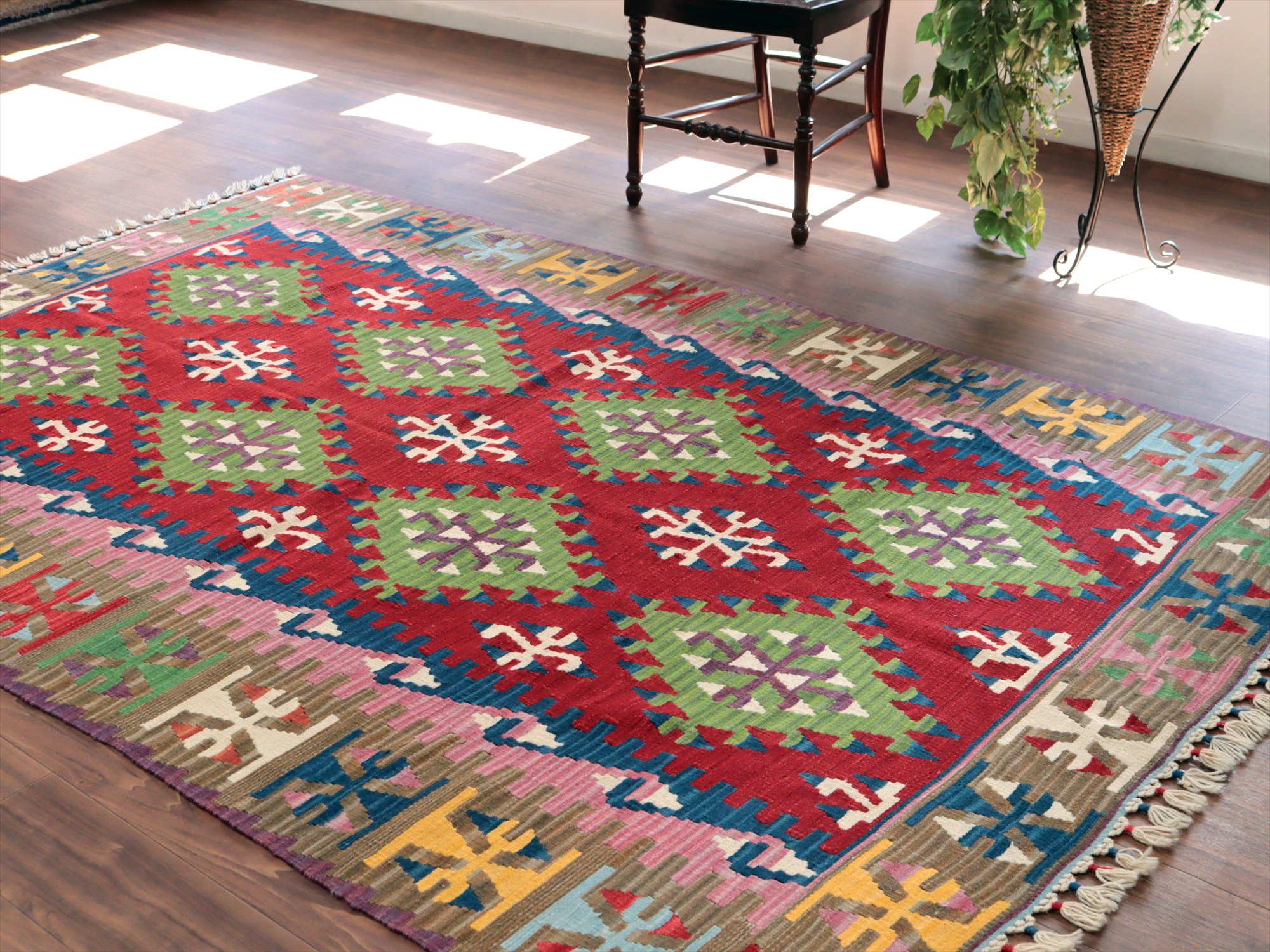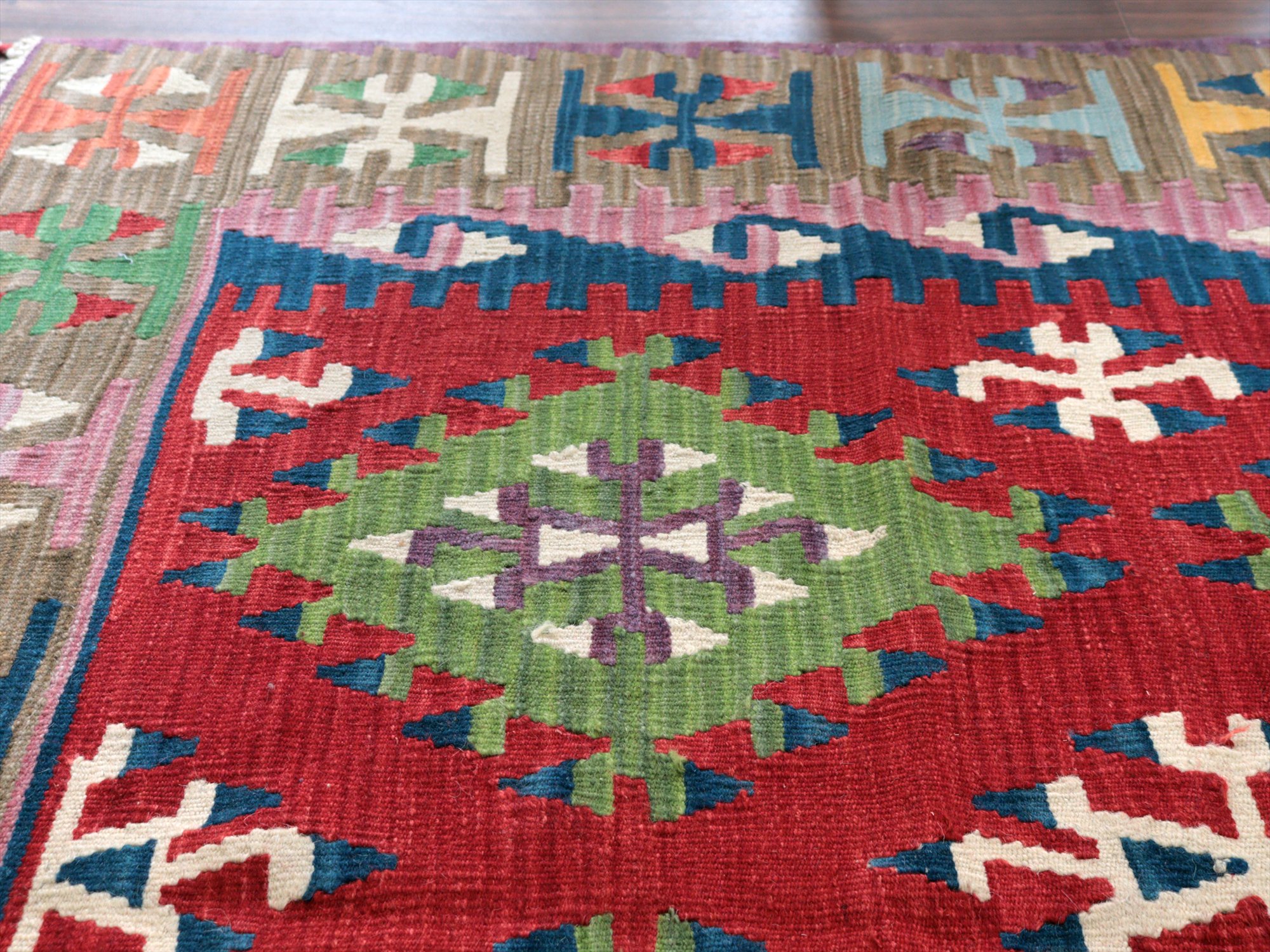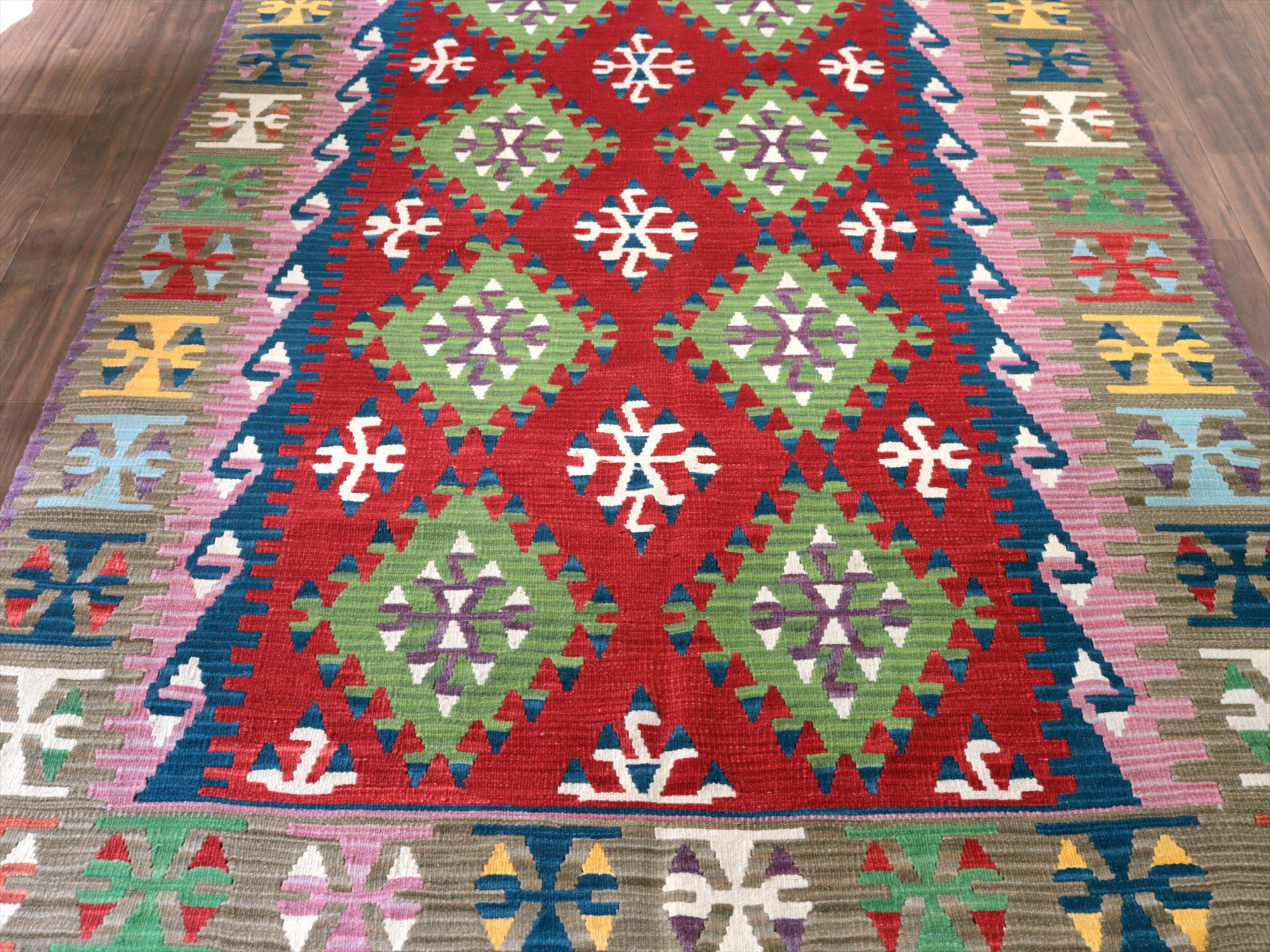 伝統的なスタイルで織られたカイセリ地方の大型キリム。やわらかくしなやかな織り地で、色の切り替え部分にはスリット(縦の隙間)がやや広めにあいています。