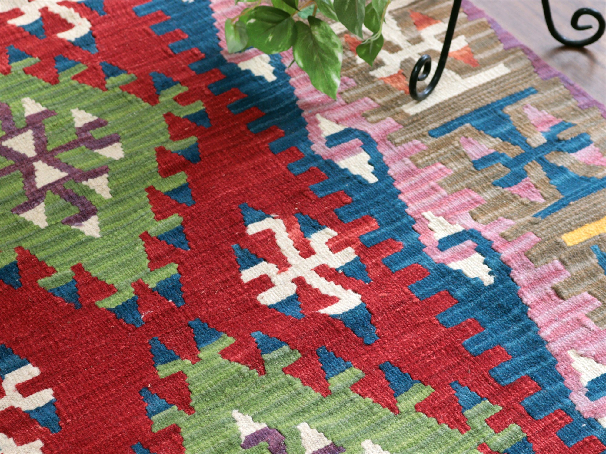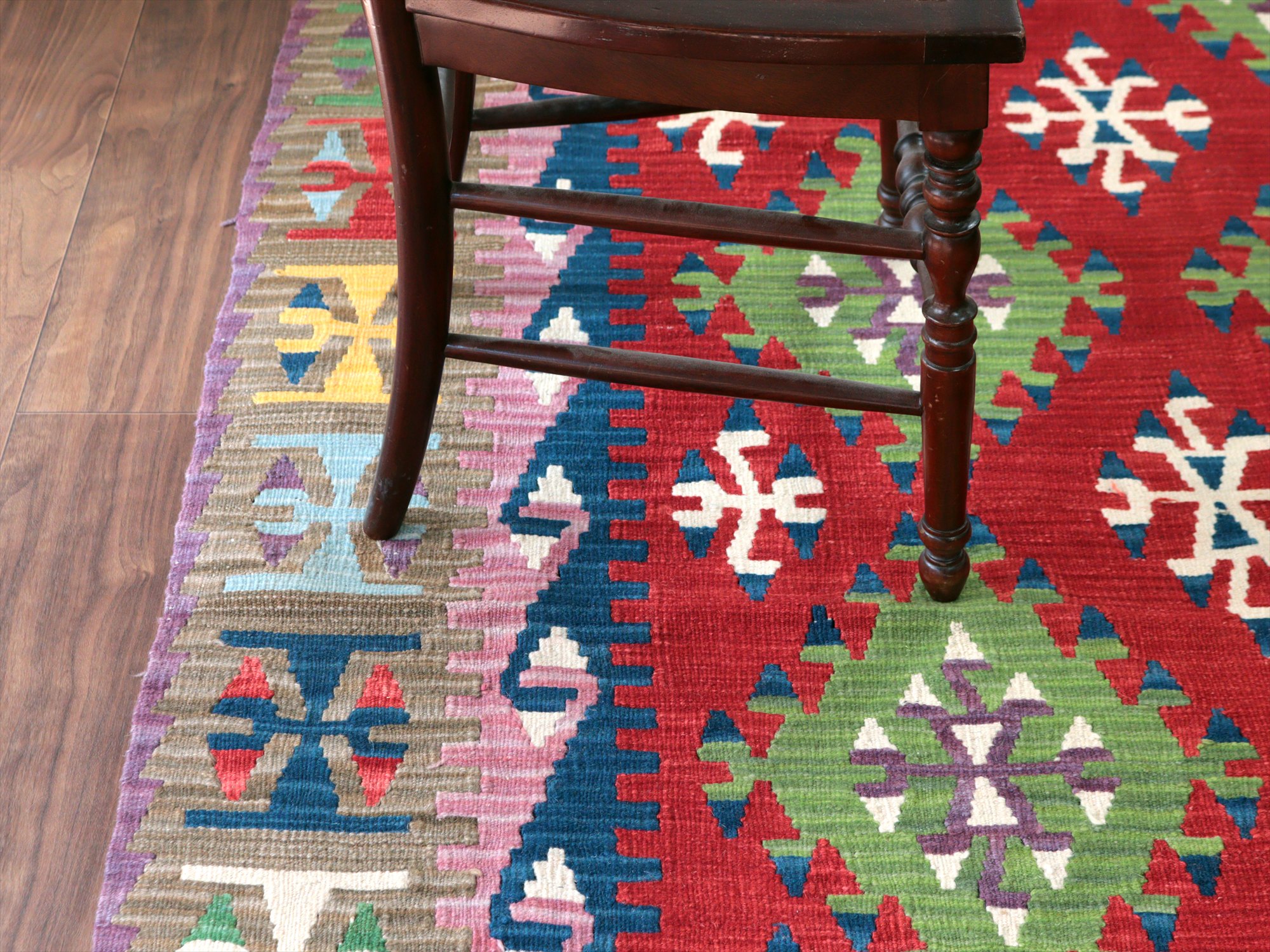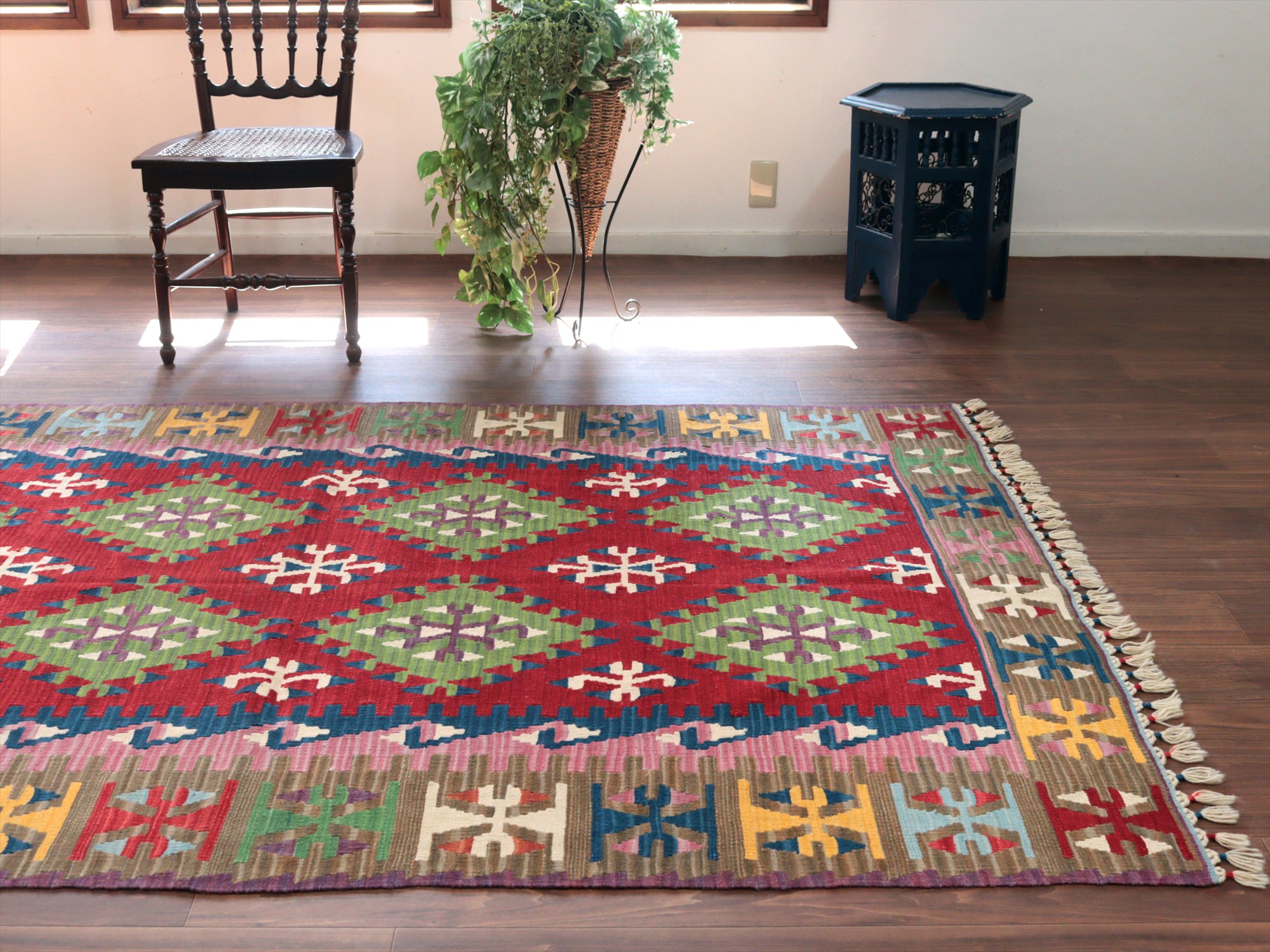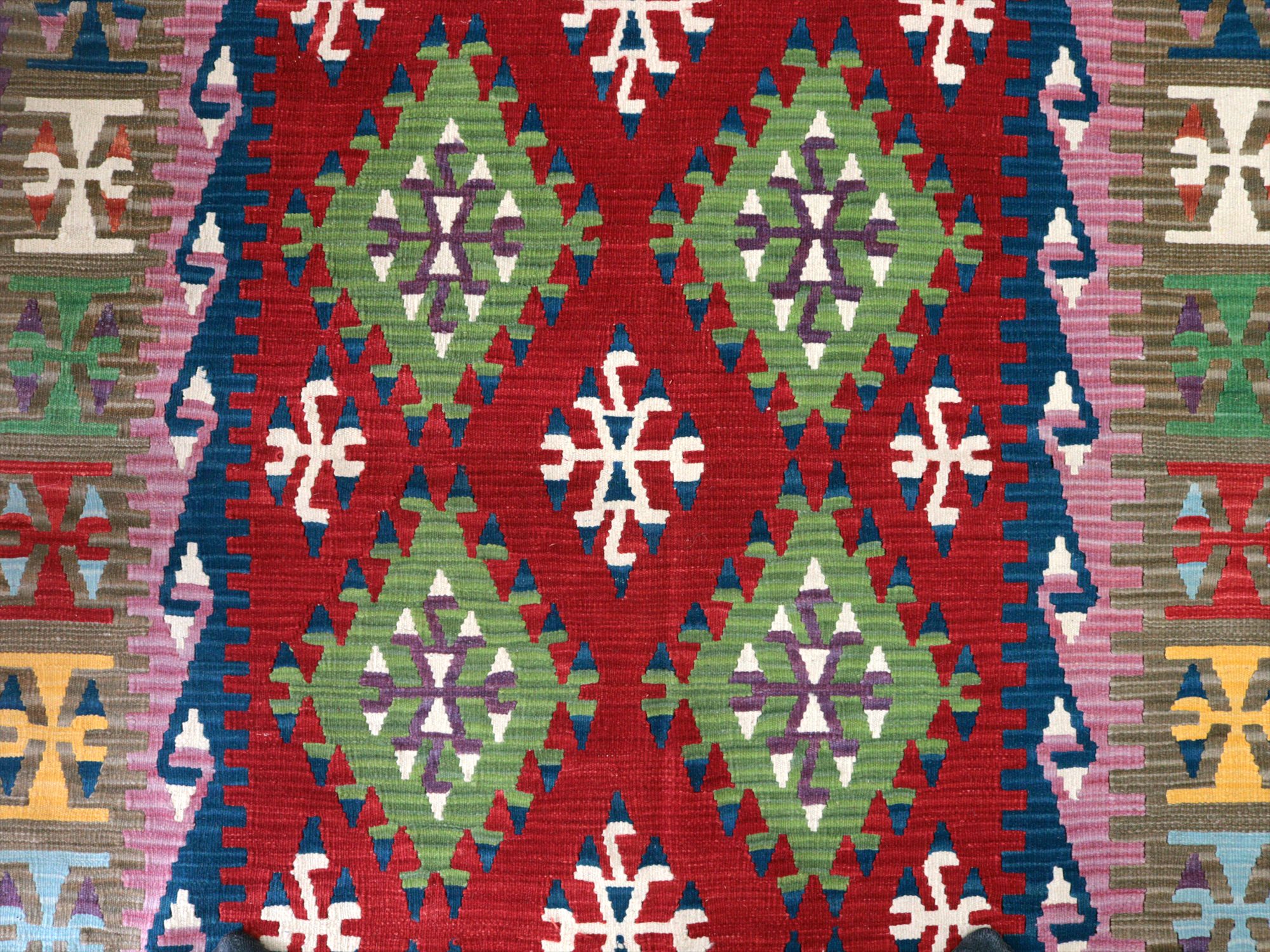 伝統的なスタイルで織られたカイセリ地方の大型キリム。やわらかくしなやかな織り地で、色の切り替え部分にはスリット(縦の隙間)がやや広めにあいています。