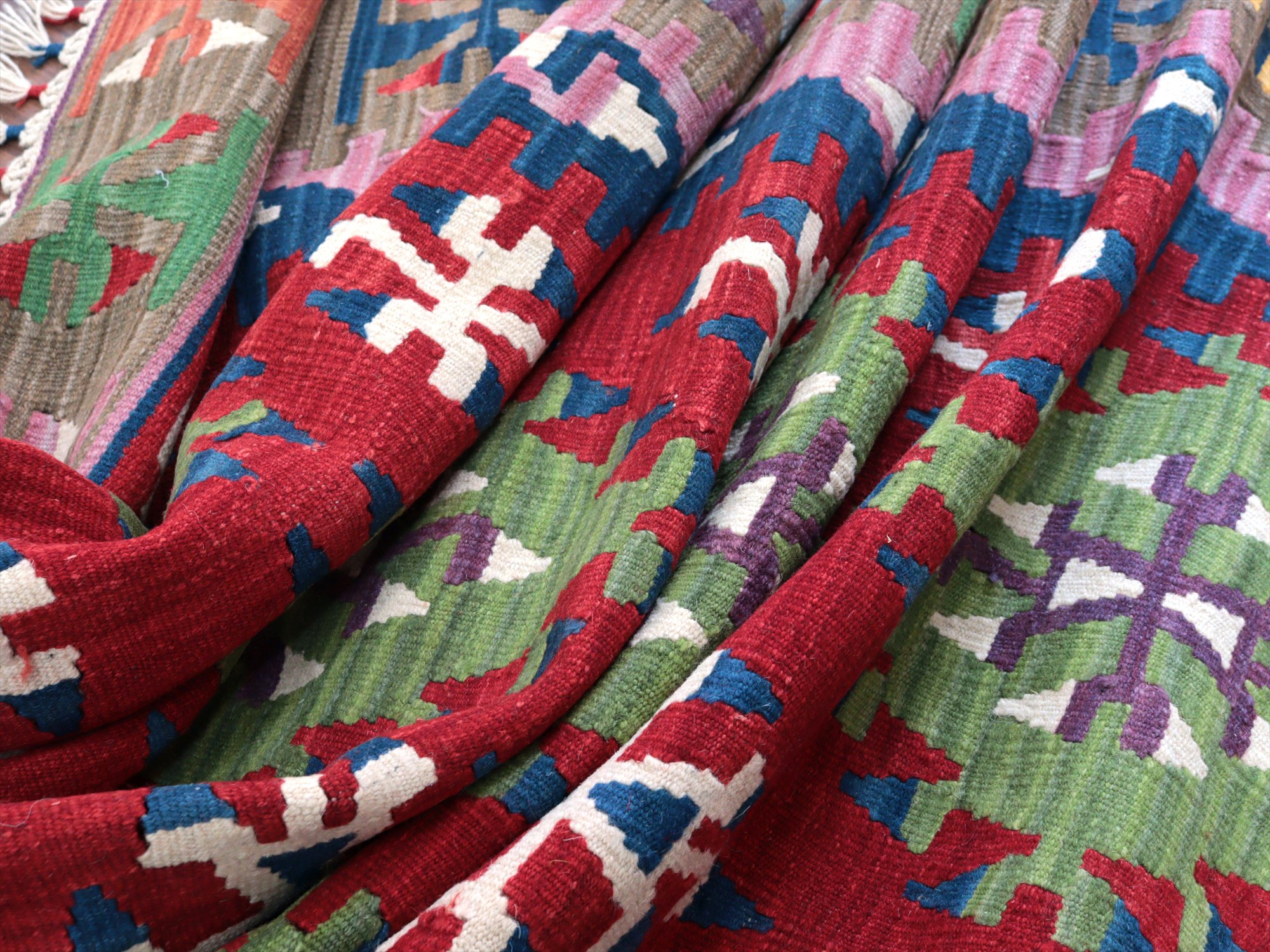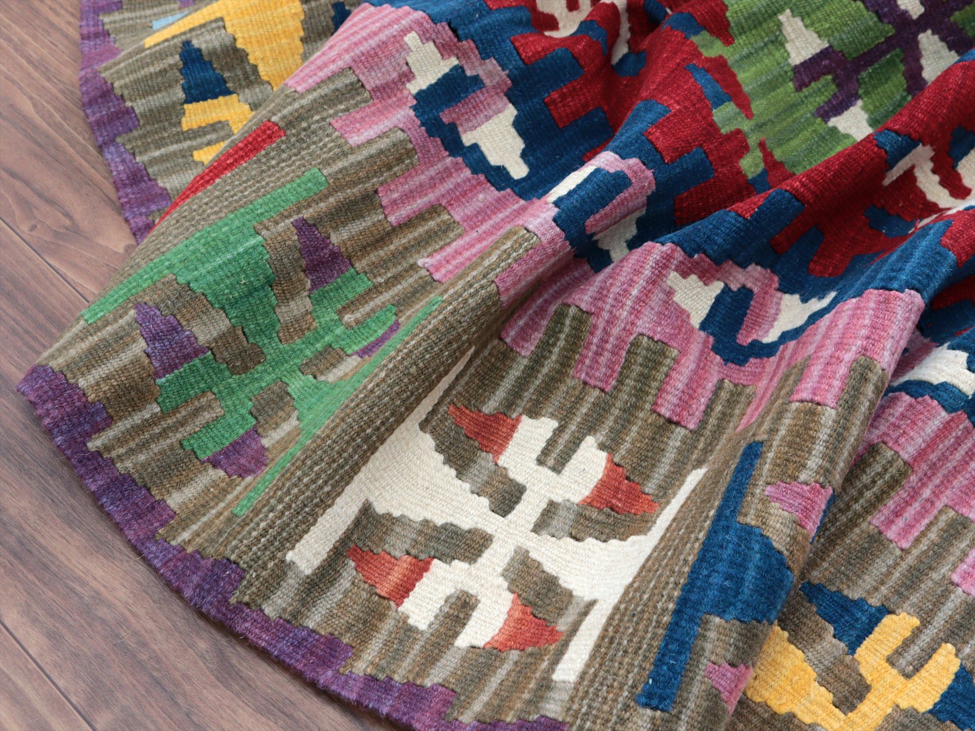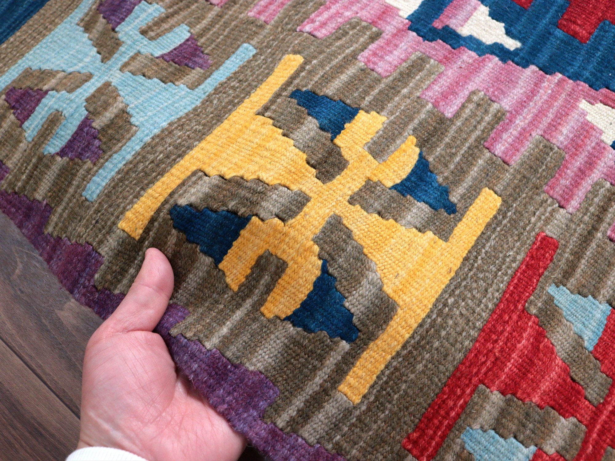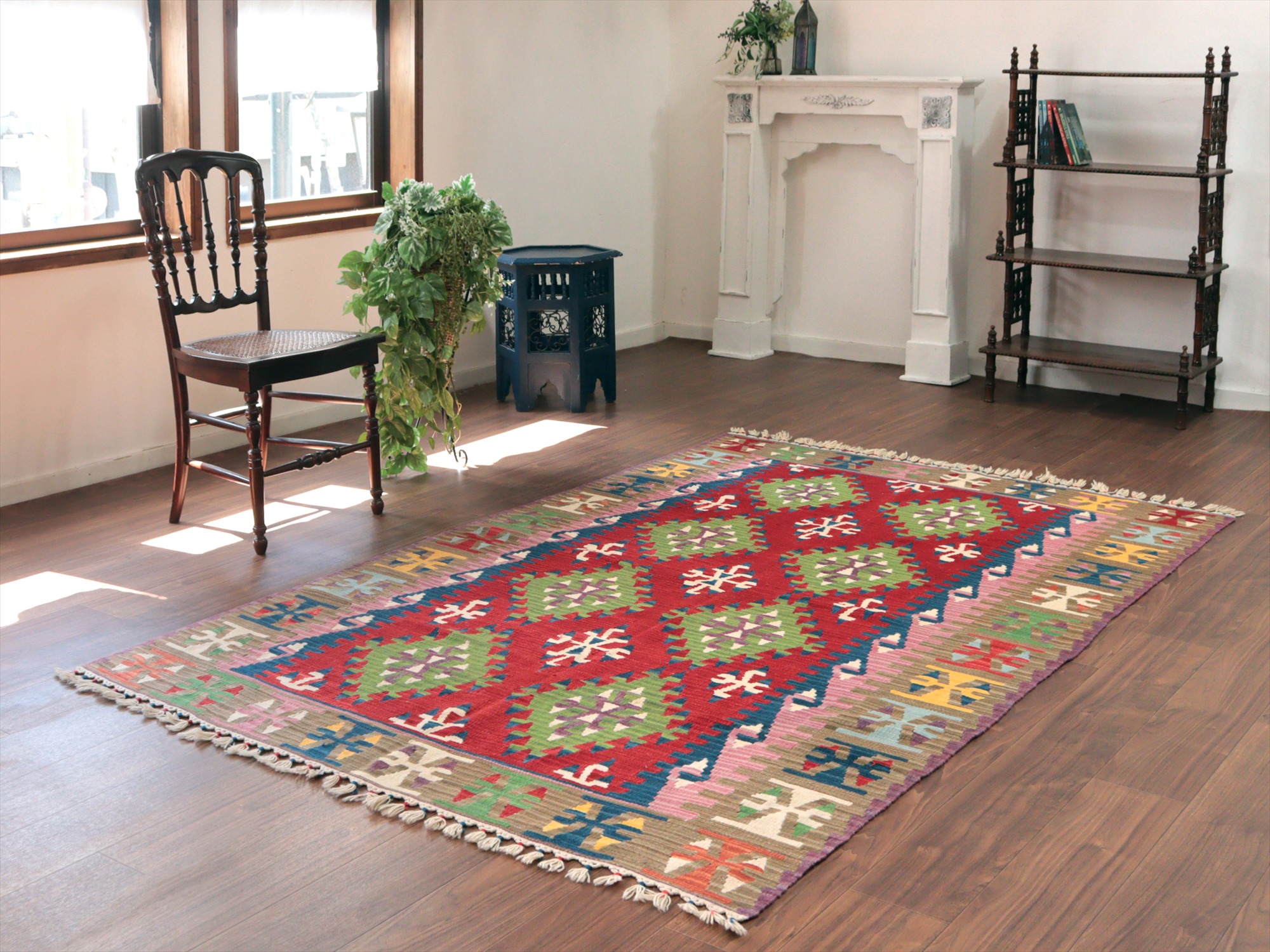 伝統的なスタイルで織られたカイセリ地方の大型キリム。やわらかくしなやかな織り地で、色の切り替え部分にはスリット(縦の隙間)がやや広めにあいています。