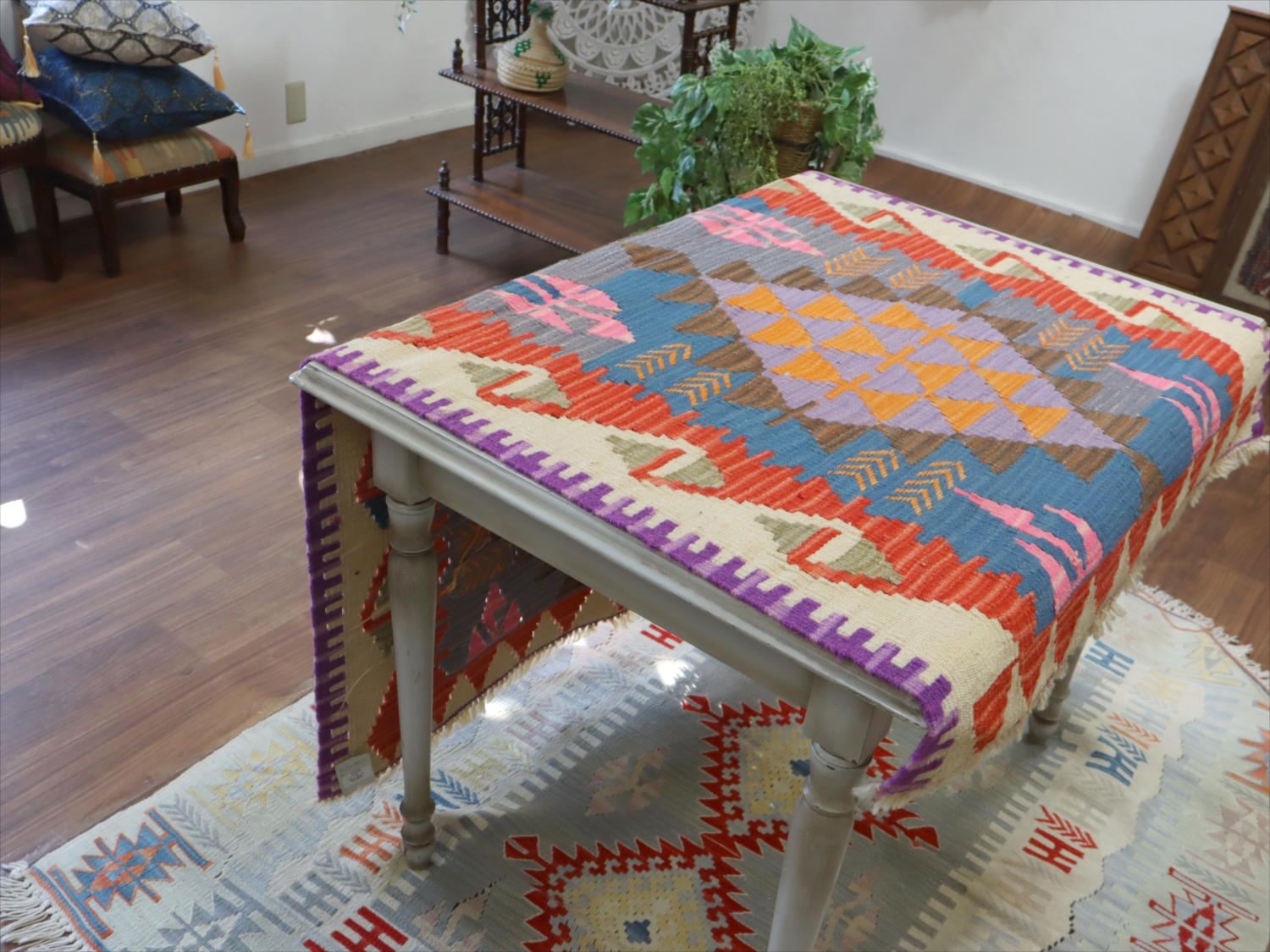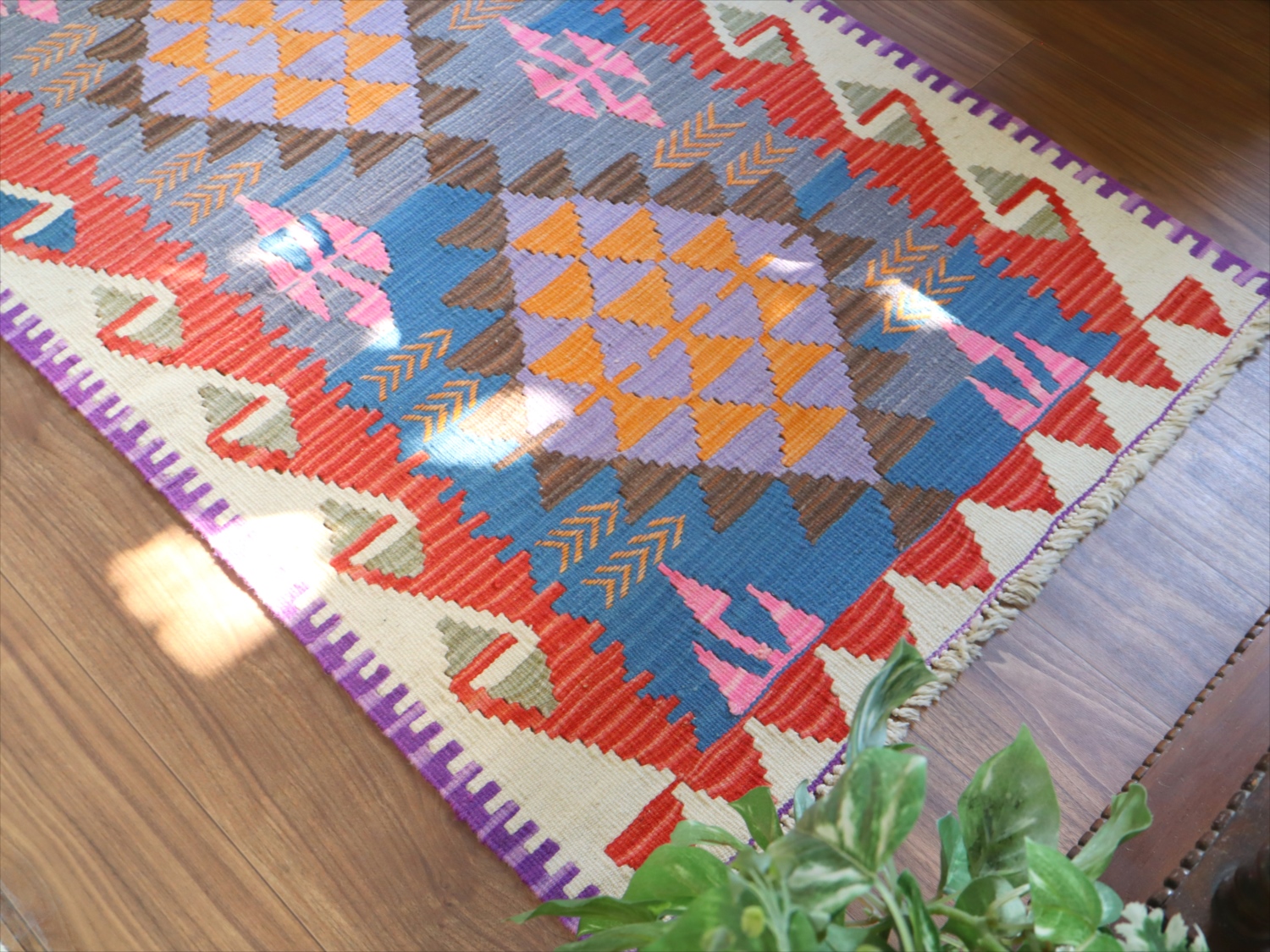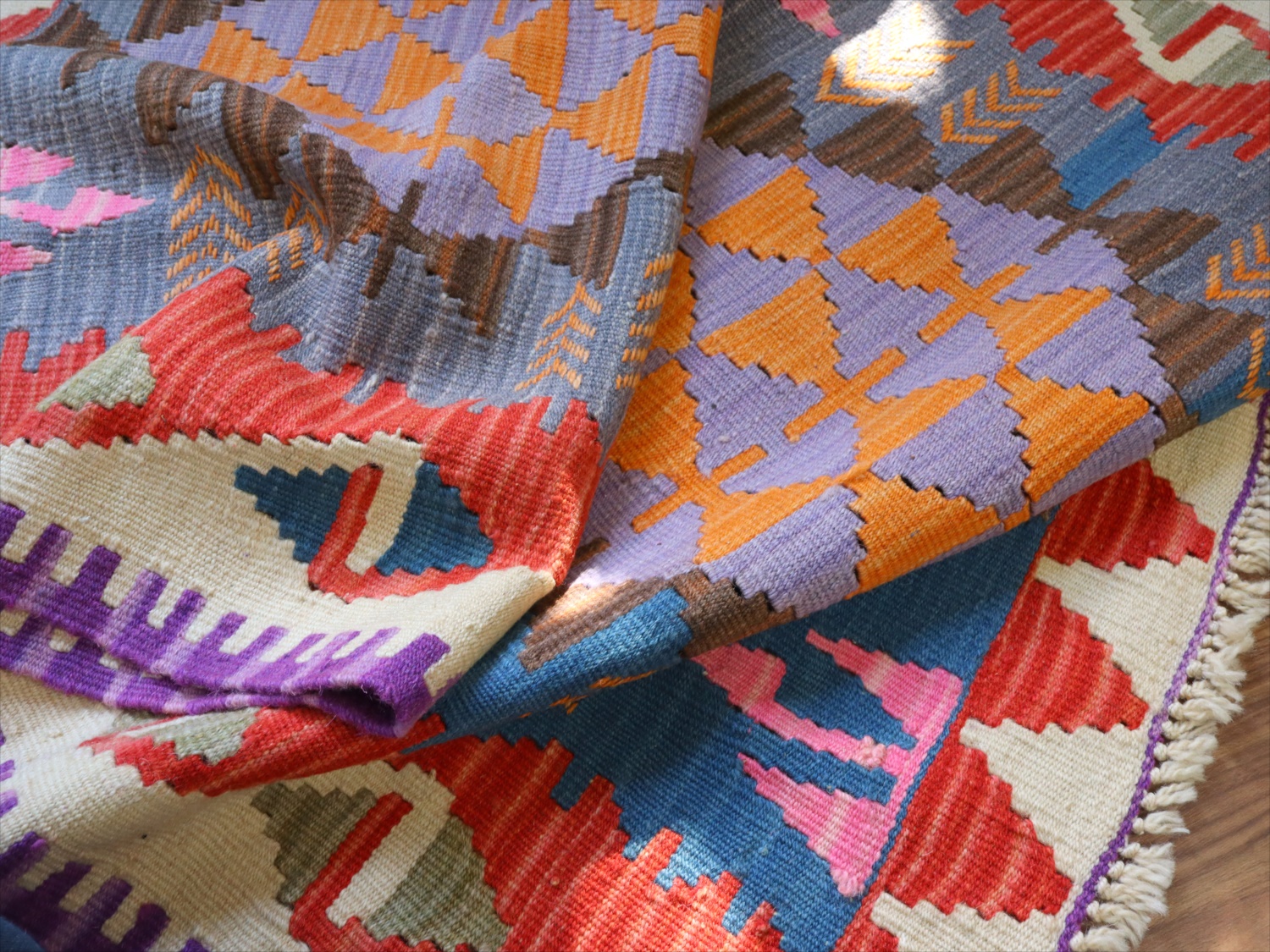 21世紀に入ってからも伝統的なキリム織りの技法を受け継ぎ、織り継がれているカイセリ地方のキリムです。明るい色使いと、大胆な幾何学柄のデザインで、トルコキリムといえばこんな感じ!とイメージされる方も多いのでは?