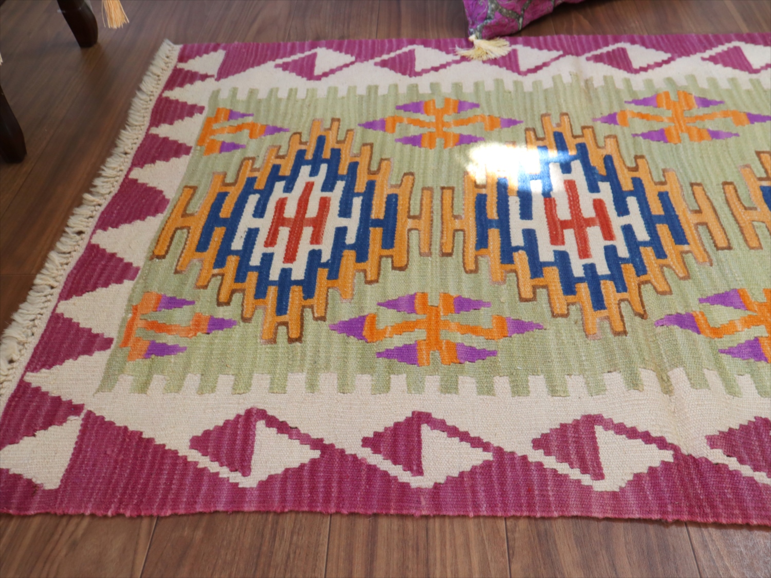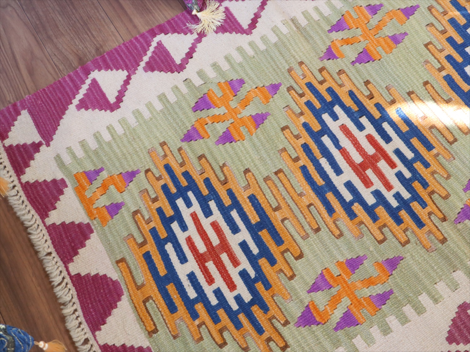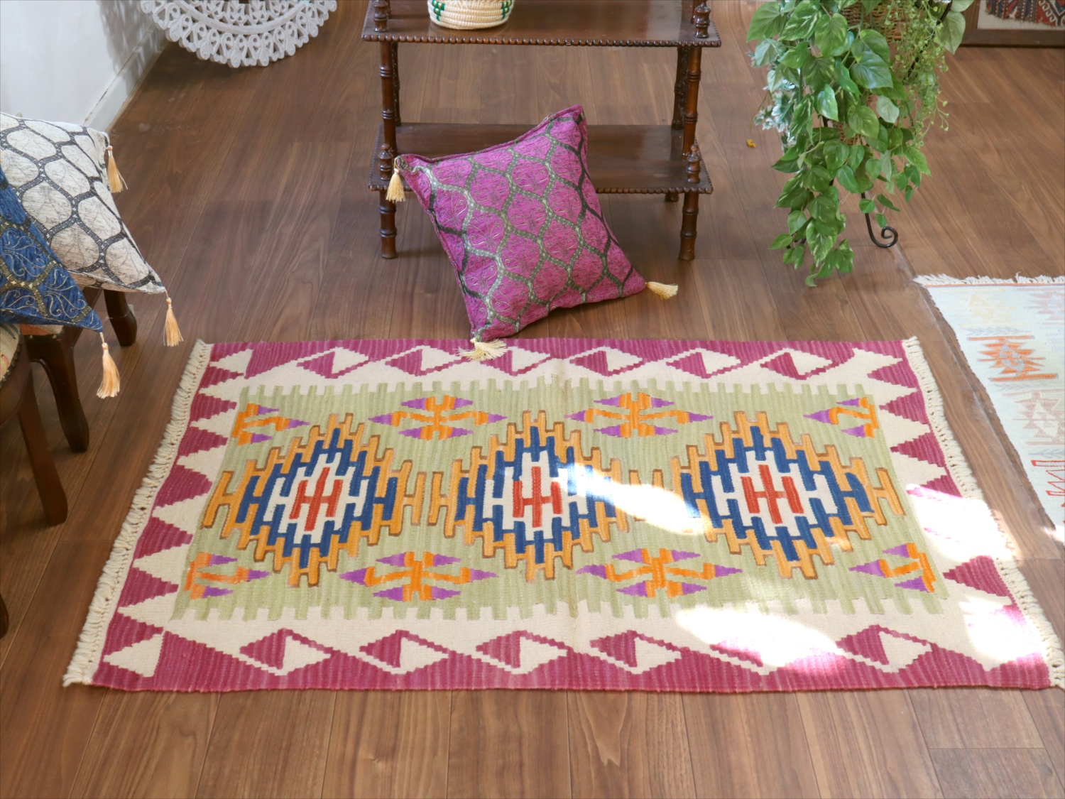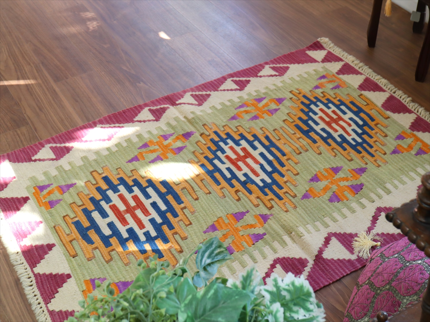 21世紀に入ってからも伝統的なキリム織りの技法を受け継ぎ、織り継がれているカイセリ地方のキリムです。明るい色使いと、大胆な幾何学柄のデザインで、トルコキリムといえばこんな感じ!とイメージされる方も多いのでは?