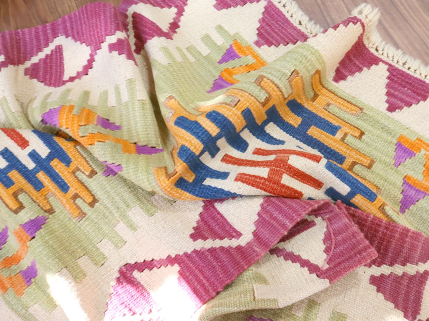織り地がしなやかでやわらかいのがカイセリキリムの特徴です。やや厚みがあり(6mm前後)、しっかりとしたウールの重みが感じられます。モチーフの色の切り替え部分には、キリムの織りの特徴で、縦に隙間が開いています(スリットと呼んでいます)。