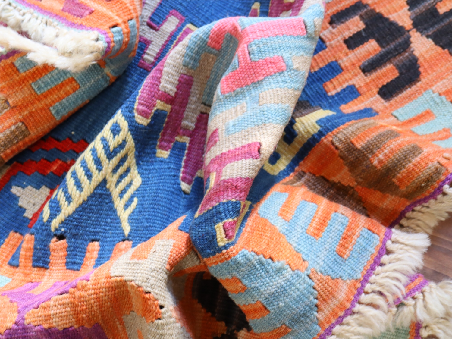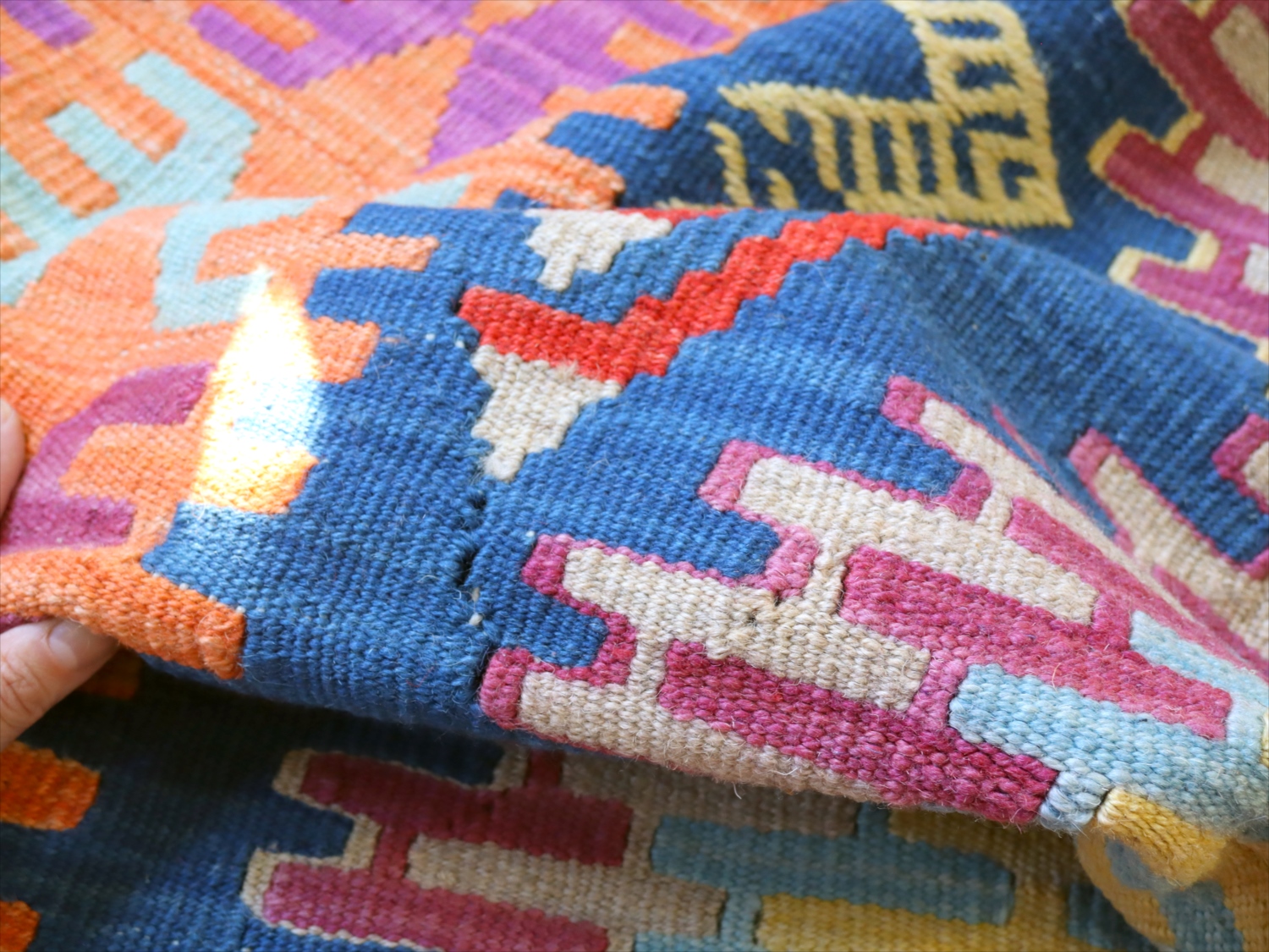 織り地がしなやかでやわらかいのがカイセリキリムの特徴です。やや厚みがあり(6mm前後)、しっかりとしたウールの重みが感じられます。モチーフの色の切り替え部分には、キリムの織りの特徴で、縦に隙間が開いています(スリットと呼んでいます)。