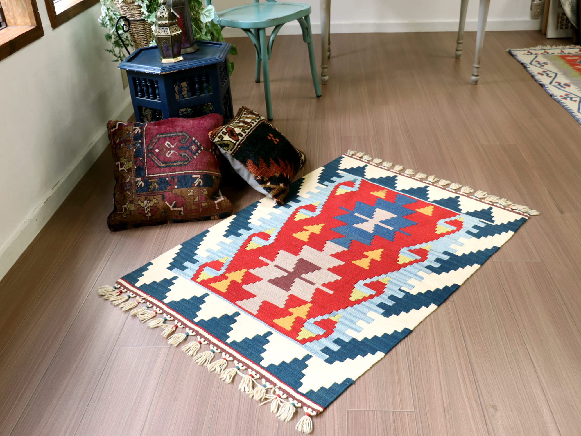 トルコキリムらしい伝統的なスタイルで織られているカイセリ産のキリムです。カイセリ地方は、トルコの中央部、カッパドキアに近く、古い時代から多くの諸品が集まり、現在でも絨毯やキリム産業の中心となっています。工業製品にはないあたたかさがあり、我が家のキリムとして愛着の持てる一枚になってくれます。