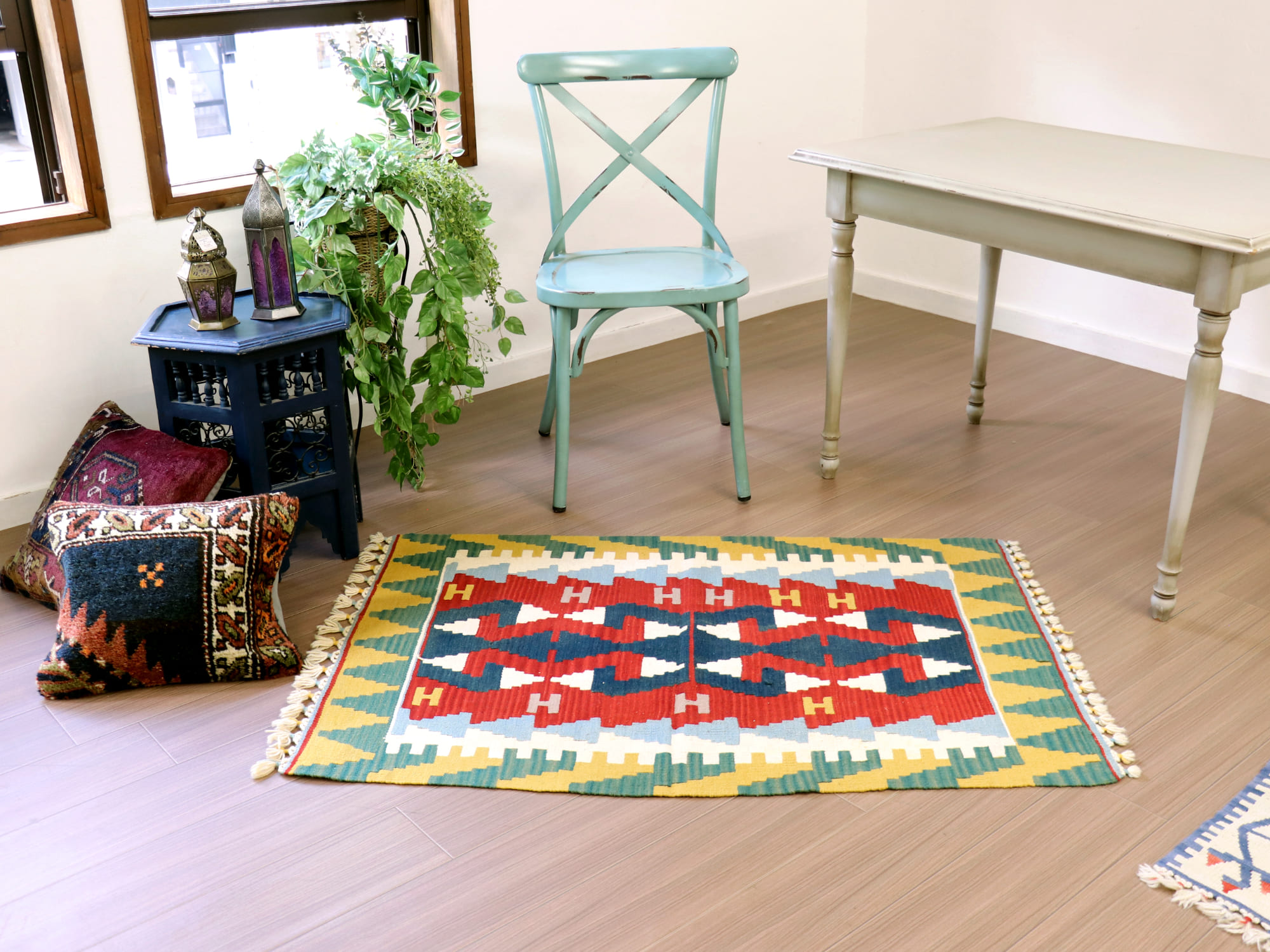 トルコキリムらしい伝統的なスタイルで織られているカイセリ産のキリムです。カイセリ地方は、トルコの中央部、カッパドキアに近く、古い時代から多くの諸品が集まり、現在でも絨毯やキリム産業の中心となっています。工業製品にはないあたたかさがあり、我が家のキリムとして愛着の持てる一枚になってくれます。