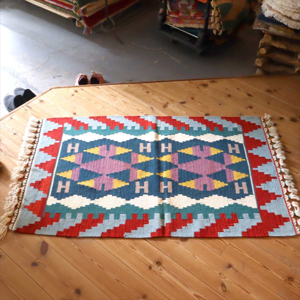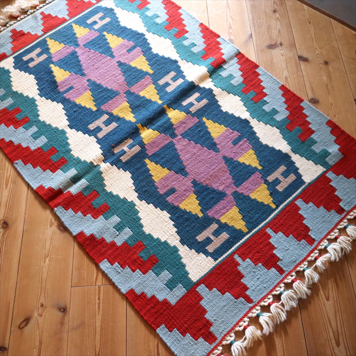 トルコキリムらしい伝統的なスタイルで織られているカイセリ産のキリムです。カイセリ地方は、トルコの中央部、カッパドキアに近く、古い時代から多くの諸品が集まり、現在でも絨毯やキリム産業の中心となっています。工業製品にはないあたたかさがあり、我が家のキリムとして愛着の持てる一枚になってくれます。