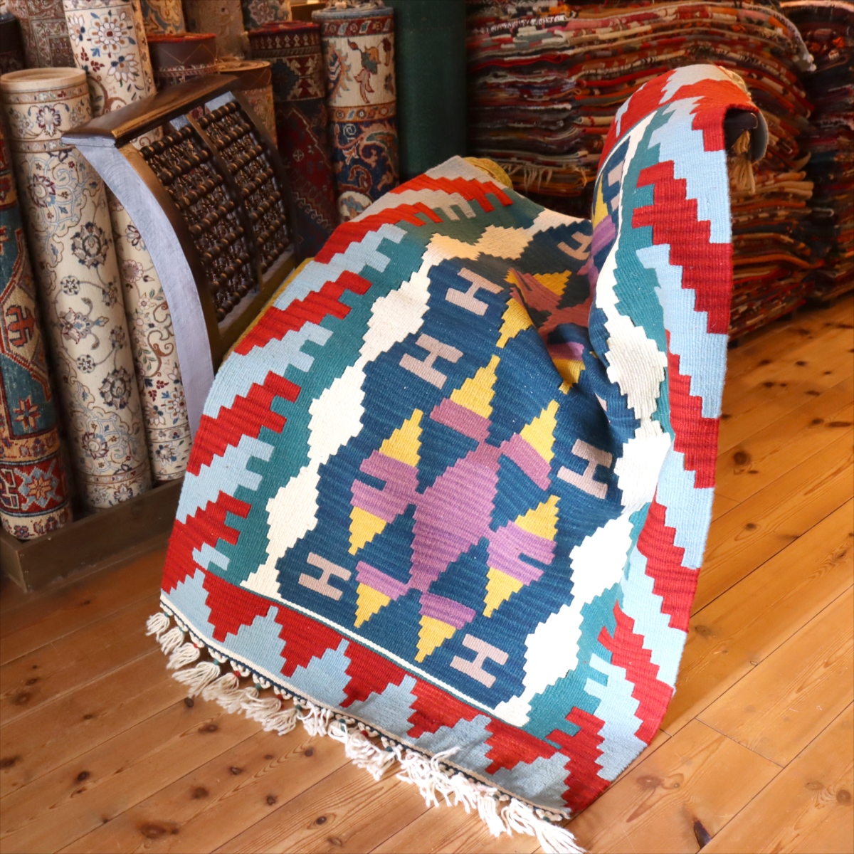 織り地がしなやかでやわらかいのがカイセリキリムの特徴です。やや厚みがあり、やさしい肌触り。色の切り替え部分には、キリムの織りの特徴で、縦に隙間が開いています(スリットと呼んでいます)。