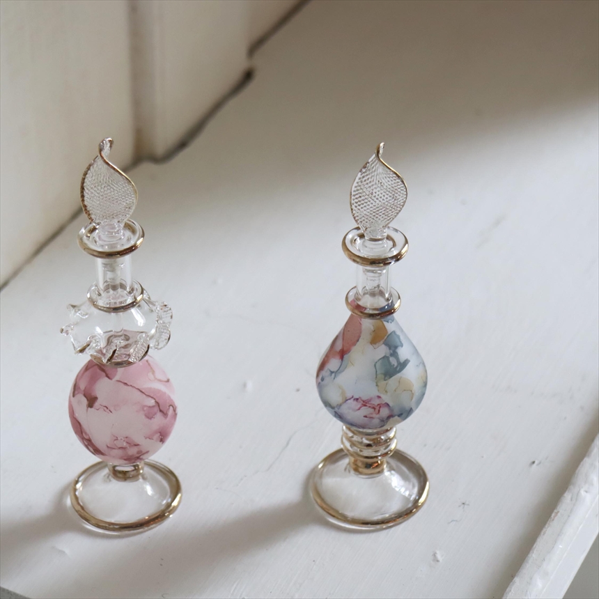 絵の具をにじませたようなマーブル模様が魅力的な香水瓶。エジプトのカイロにて、職人さんが一つ一つ手作りしたもので、水彩絵の具をにじませたようなランダムなペイントが施されています。