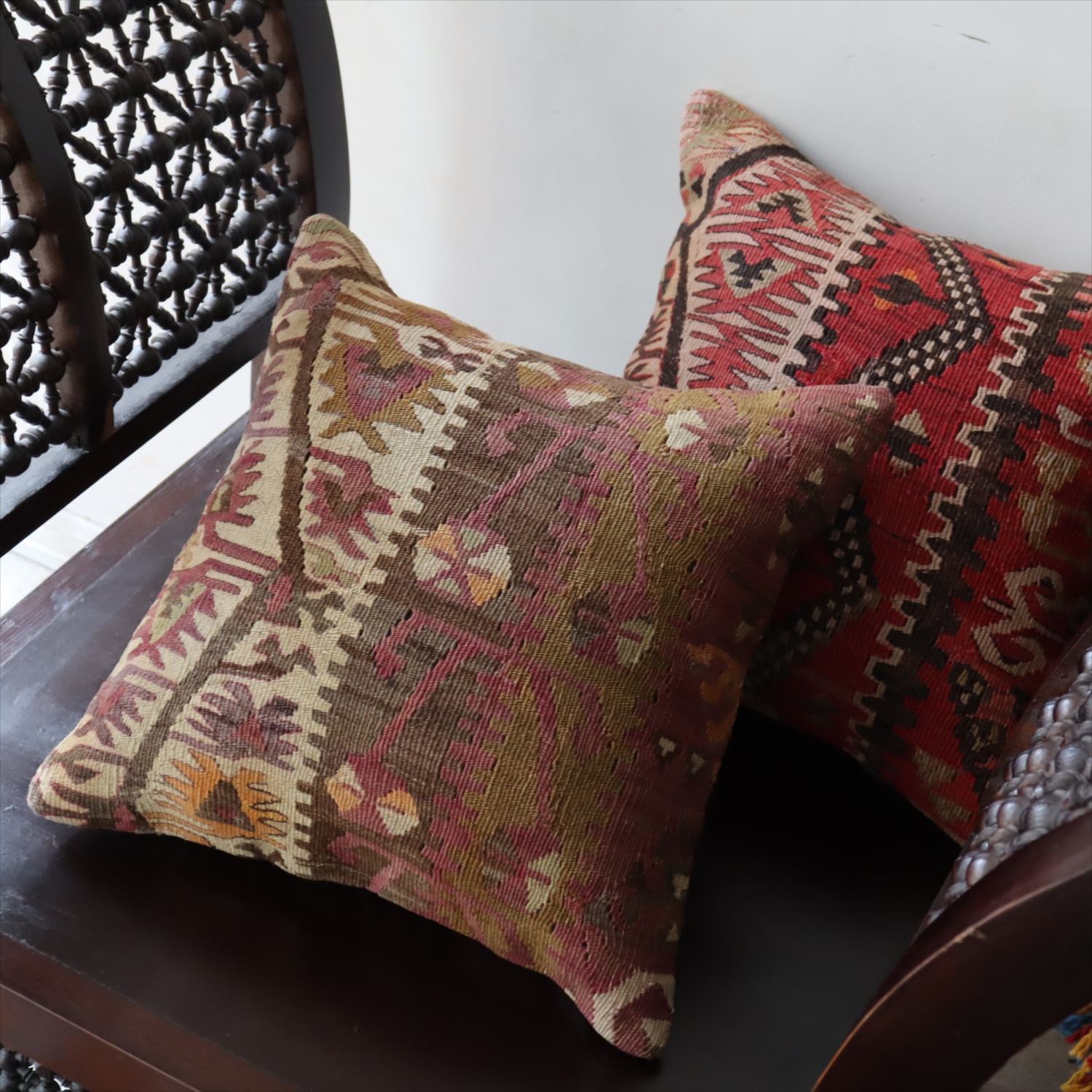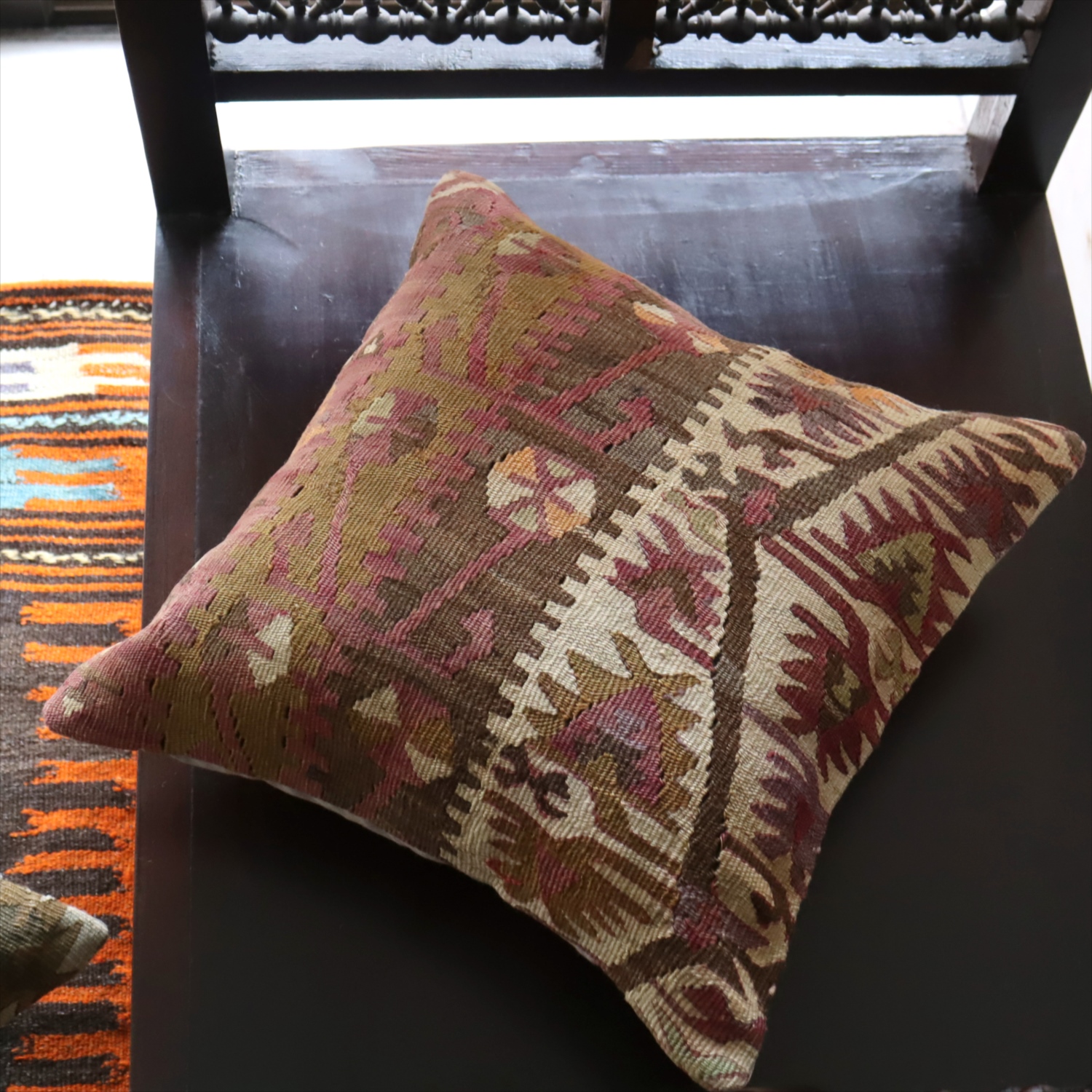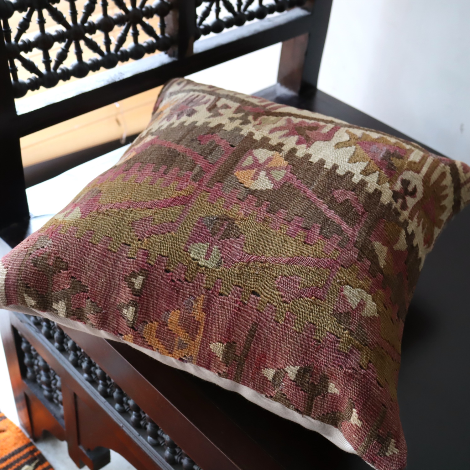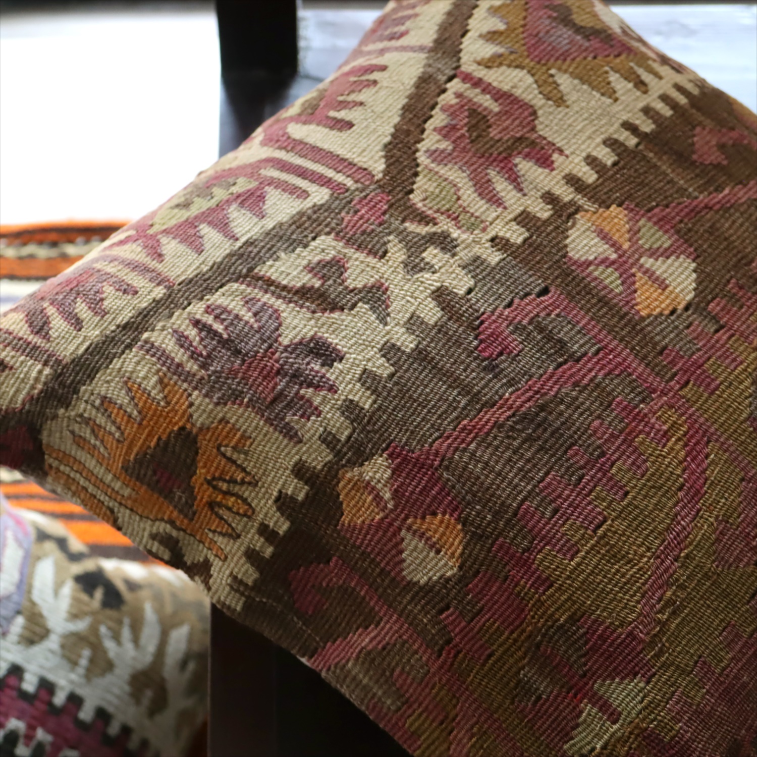 細い糸を使って織られた大型の平織りキリムをカットして作ったクッションカバーです。表面はウールのヴィンテージキリム、裏面は無地のコットン地です。
