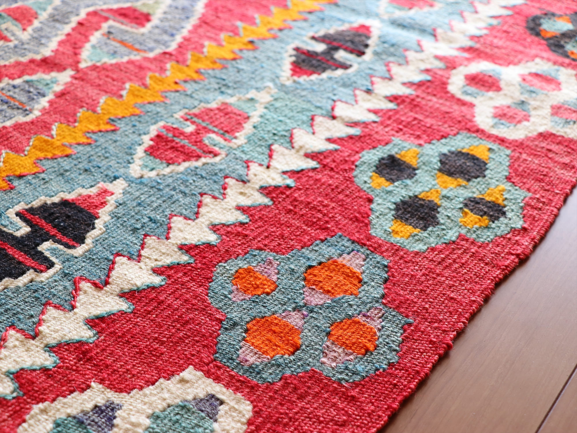 経糸にコットンが使われていて、しっかりとした織り地でやや厚みがあります。わずかにゆがみがありますが、フロアに敷くと目立たない程度です。