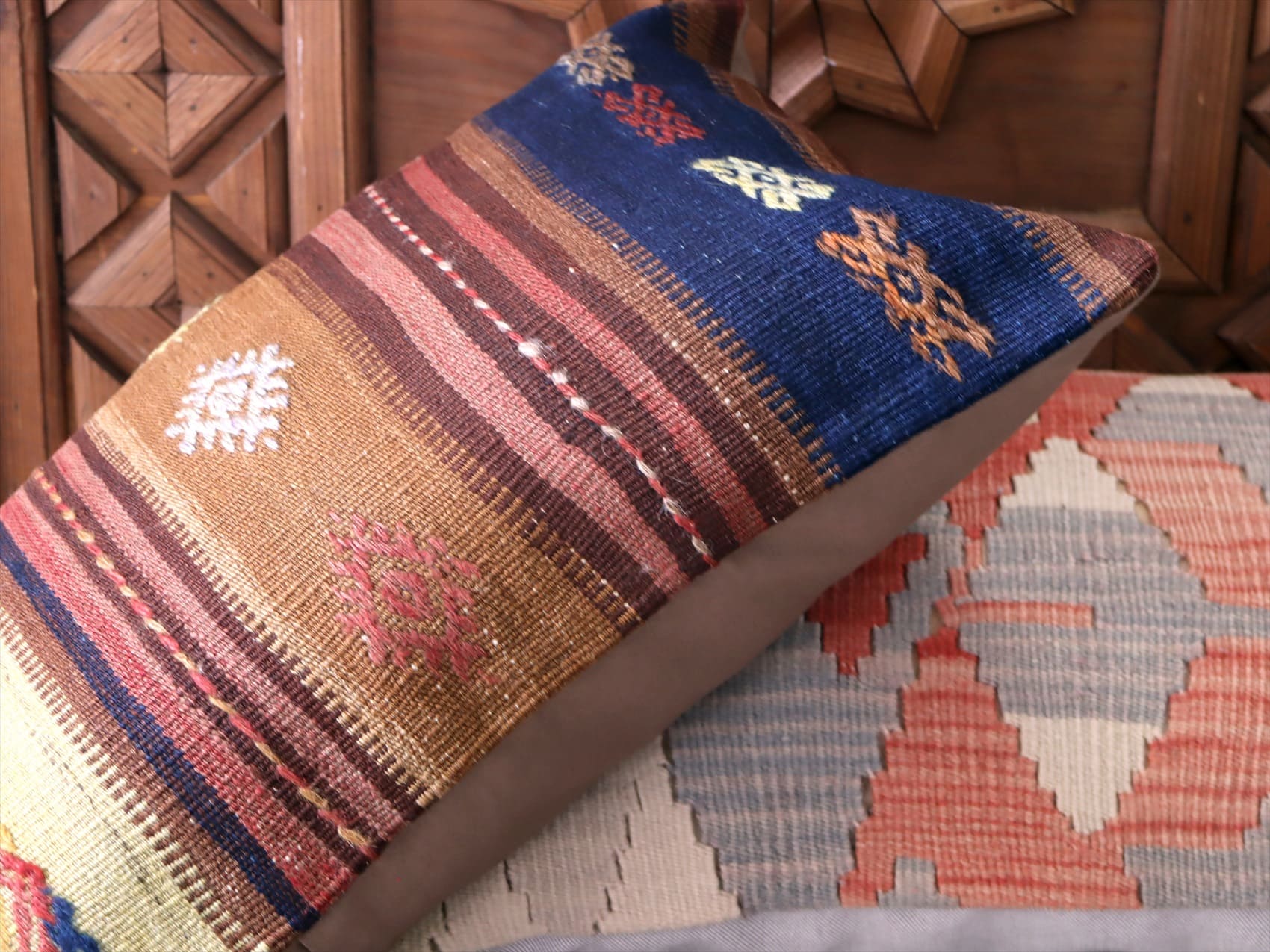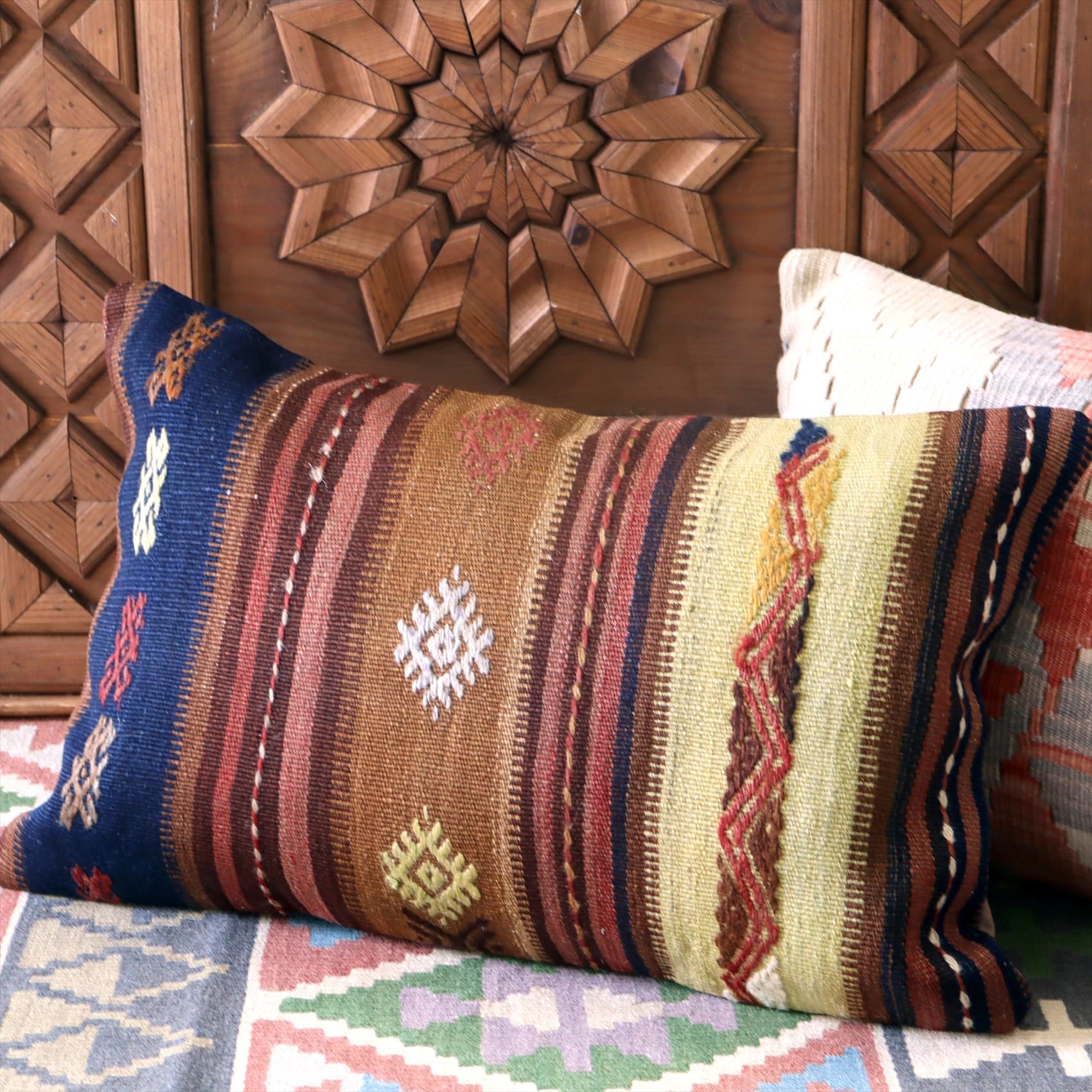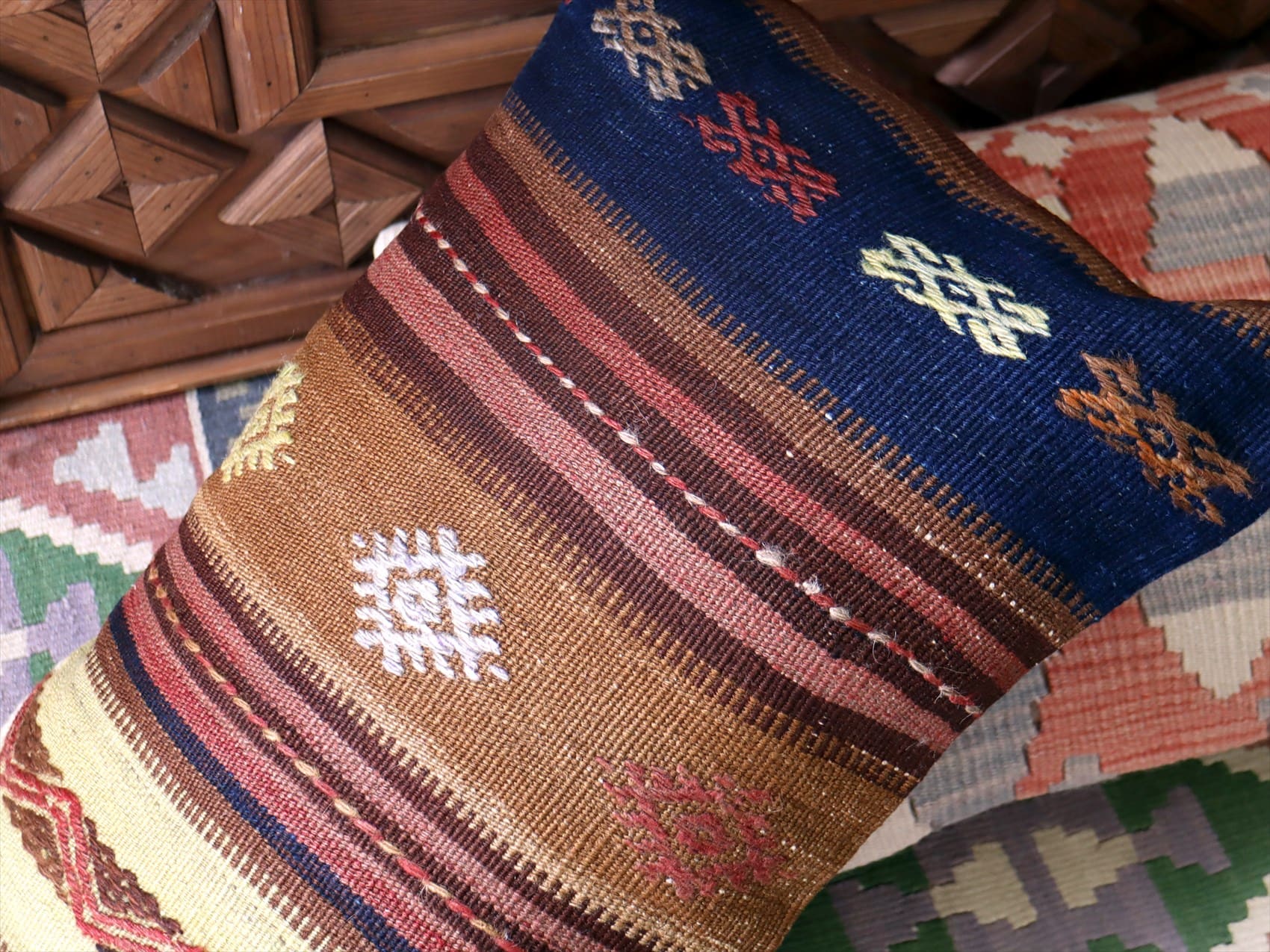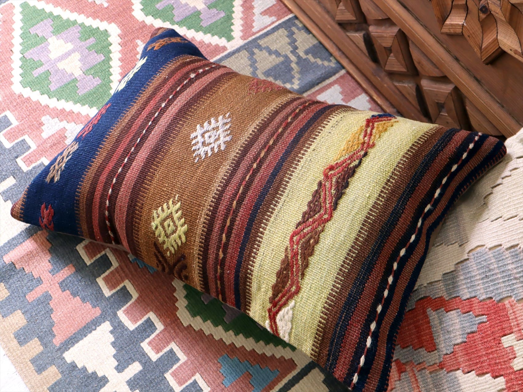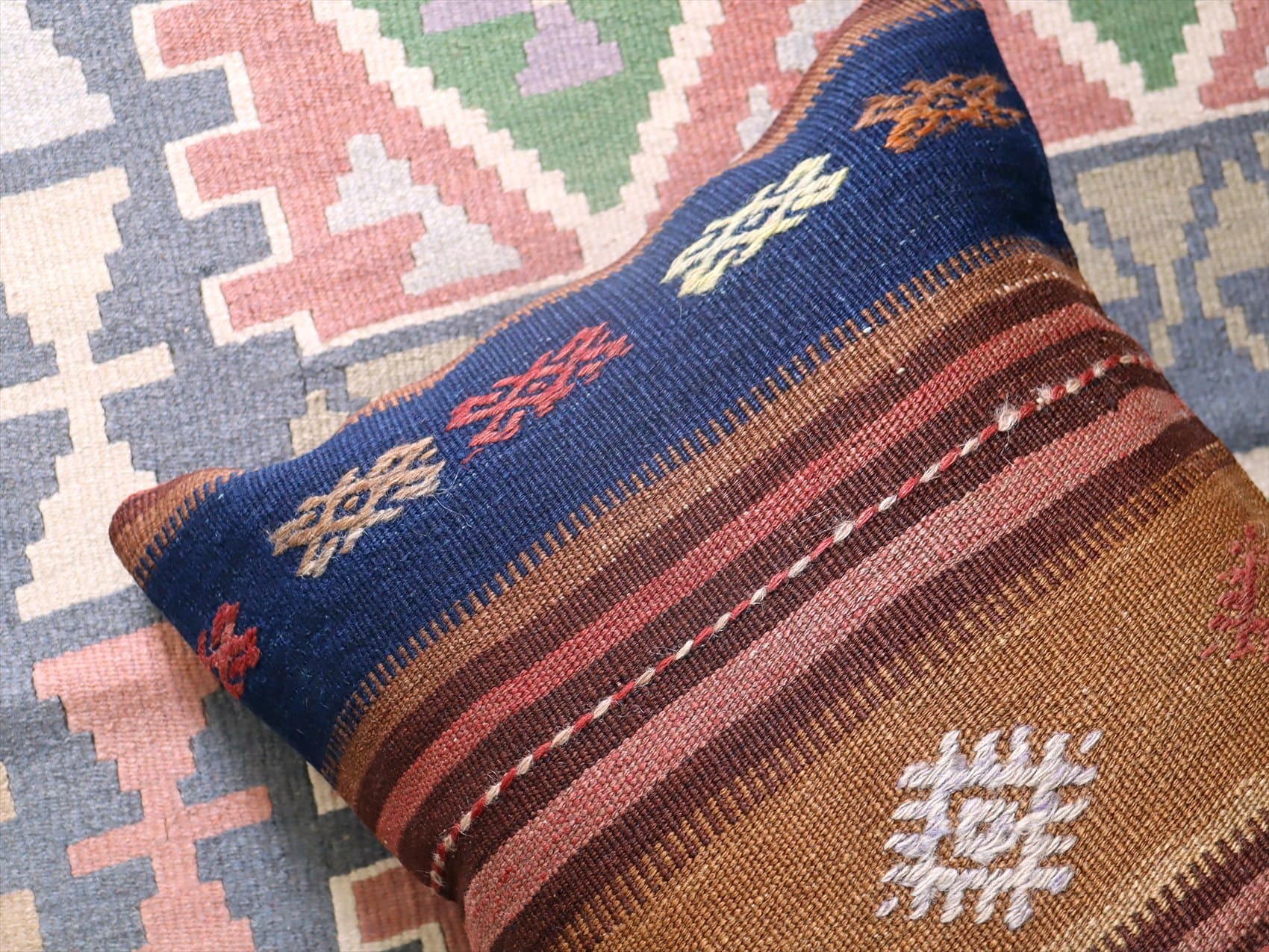 シックな色使いで存在感あるストライプデザインのクッション。あまり日焼けした様子がなく、織られた当時の色を残しています。