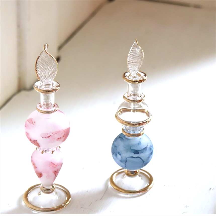 絵の具をにじませたようなマーブル模様が魅力的な香水瓶。エジプトのカイロにて、職人さんが一つ一つ手作りしたもので、水彩絵の具をにじませたようなランダムなペイントが施されています。