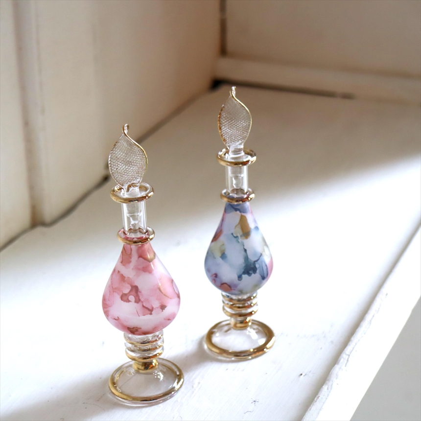 絵の具をにじませたようなマーブル模様が魅力的な香水瓶。エジプトのカイロにて、職人さんが一つ一つ手作りしたもので、水彩絵の具をにじませたようなランダムなペイントが施されています。