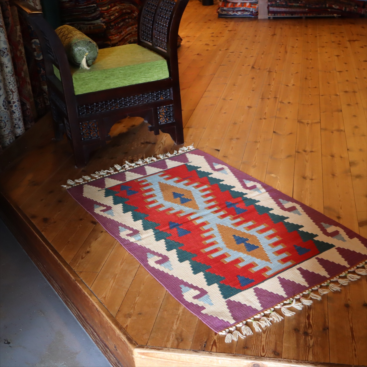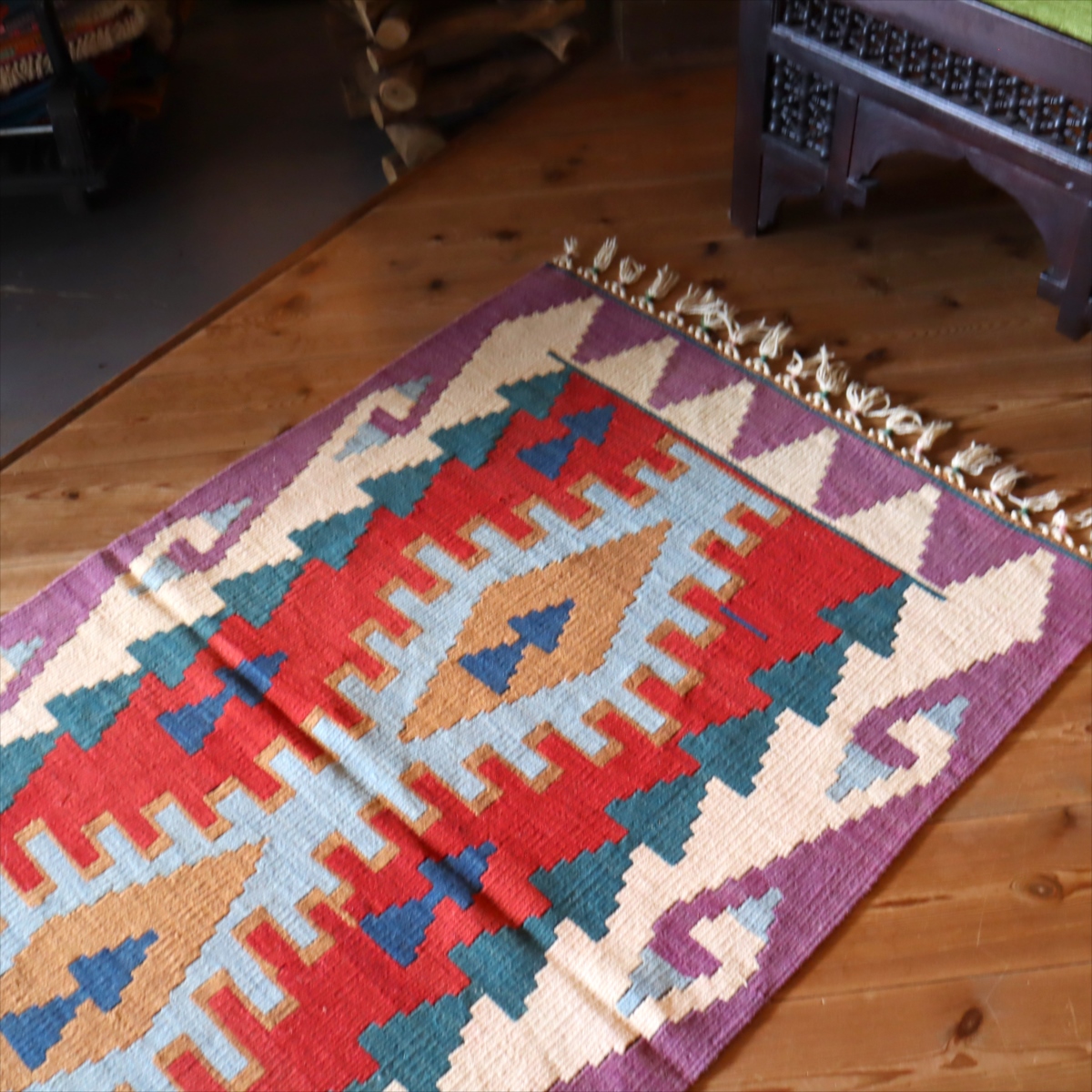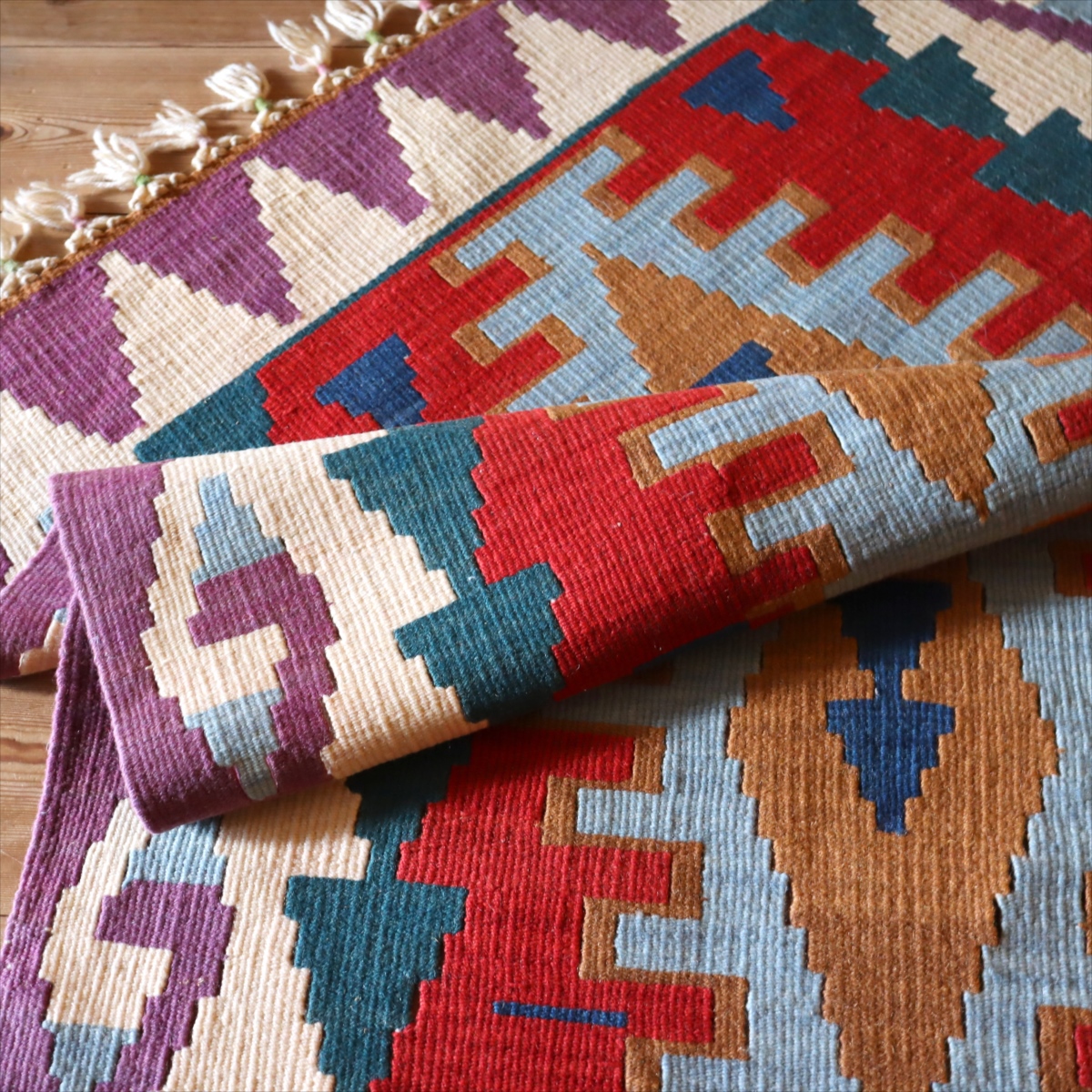 織り地がしなやかでやわらかいのがカイセリキリムの特徴です。やや厚みがあり、やさしい肌触り。色の切り替え部分には、キリムの織りの特徴で、縦に隙間が開いています(スリットと呼んでいます)。
