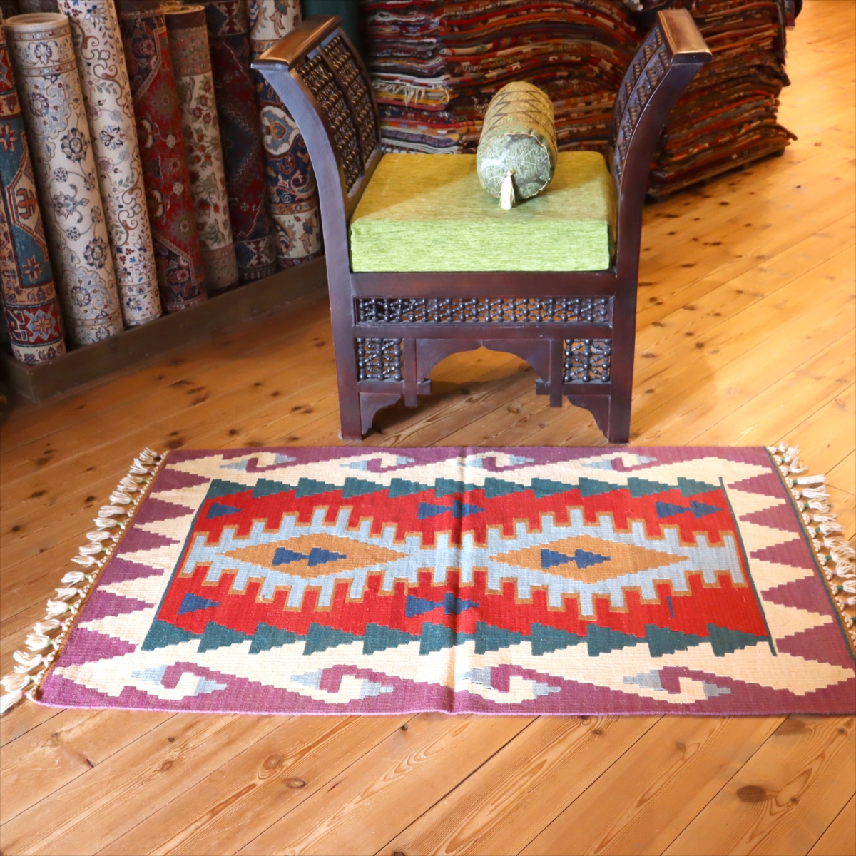 トルコキリムらしい伝統的なスタイルで織られているカイセリ産のキリムです。カイセリ地方は、トルコの中央部、カッパドキアに近く、古い時代から多くの諸品が集まり、現在でも絨毯やキリム産業の中心となっています。工業製品にはないあたたかさがあり、我が家のキリムとして愛着の持てる一枚になってくれます。