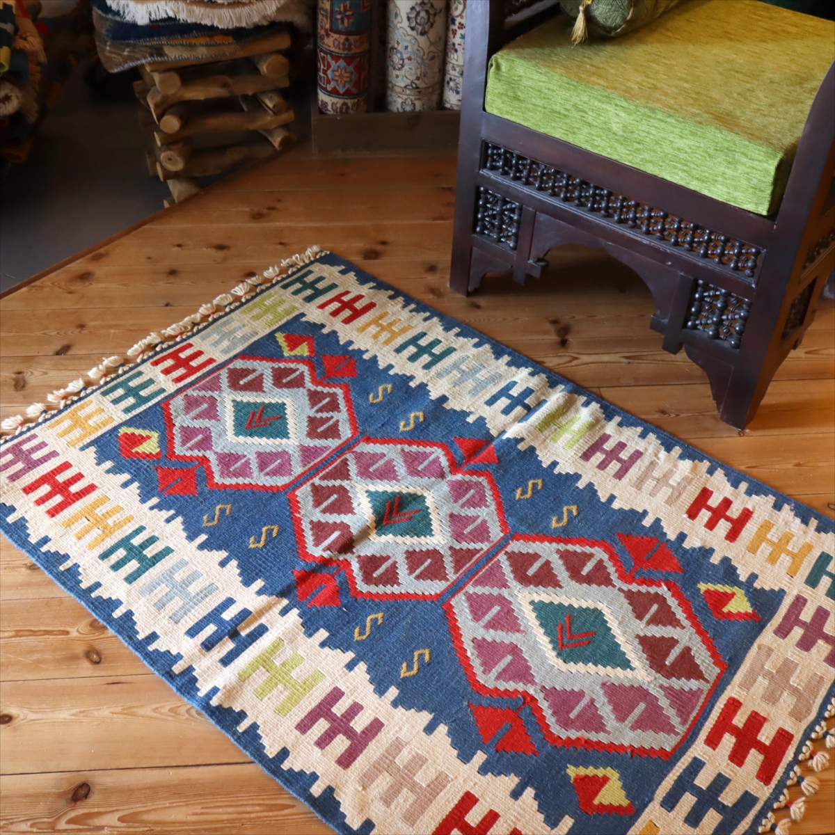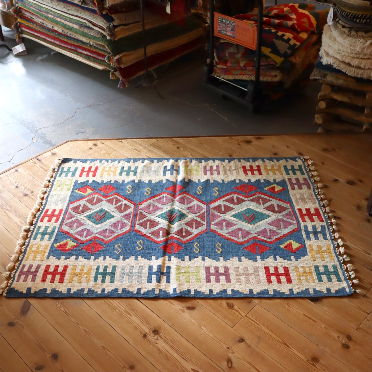 トルコキリムらしい伝統的なスタイルで織られているカイセリ産のキリムです。カイセリ地方は、トルコの中央部、カッパドキアに近く、古い時代から多くの諸品が集まり、現在でも絨毯やキリム産業の中心となっています。工業製品にはないあたたかさがあり、我が家のキリムとして愛着の持てる一枚になってくれます。