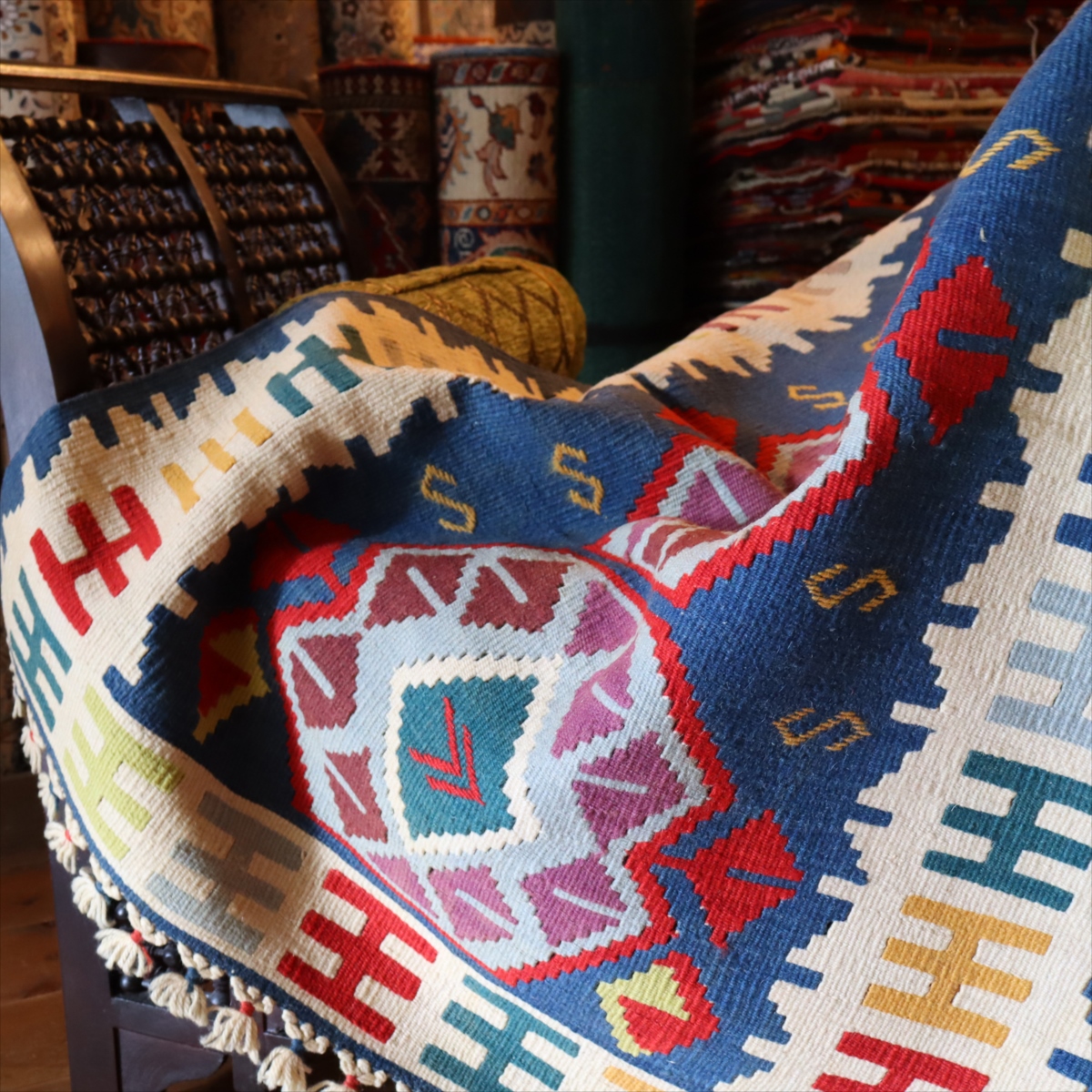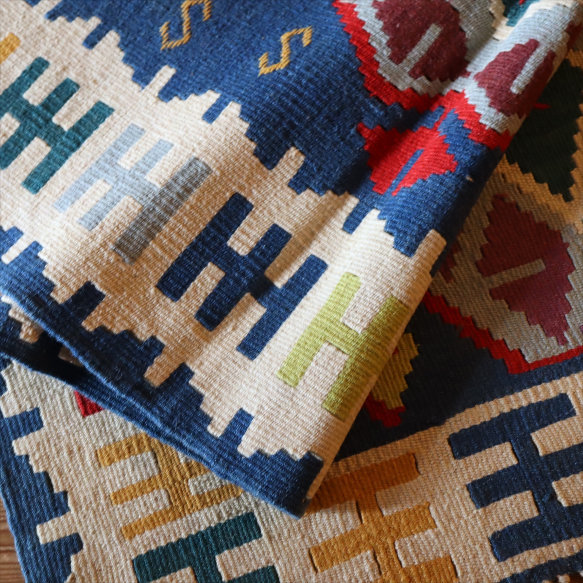 織り地がしなやかでやわらかいのがカイセリキリムの特徴です。やや厚みがあり、やさしい肌触り。色の切り替え部分には、キリムの織りの特徴で、縦に隙間が開いています(スリットと呼んでいます)。