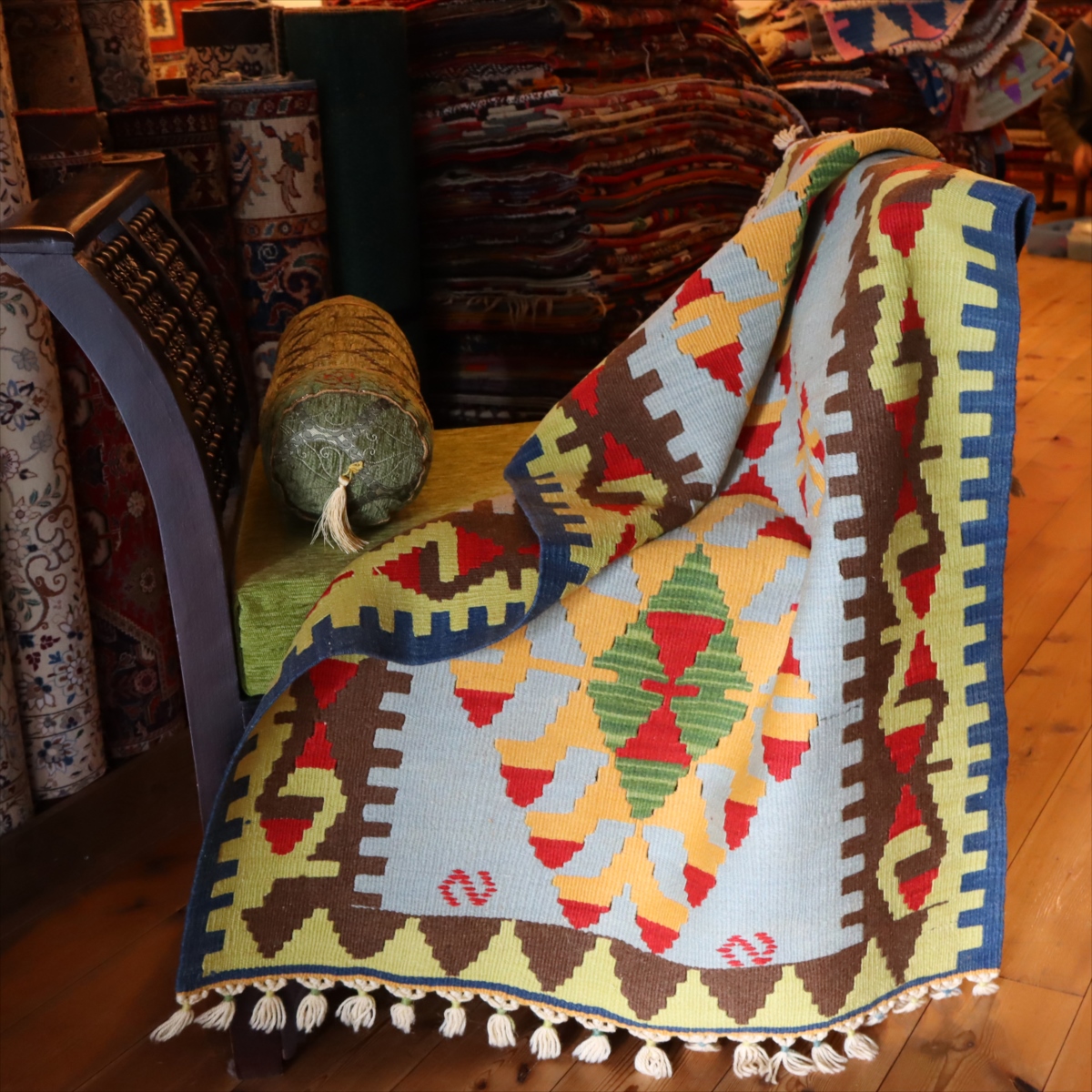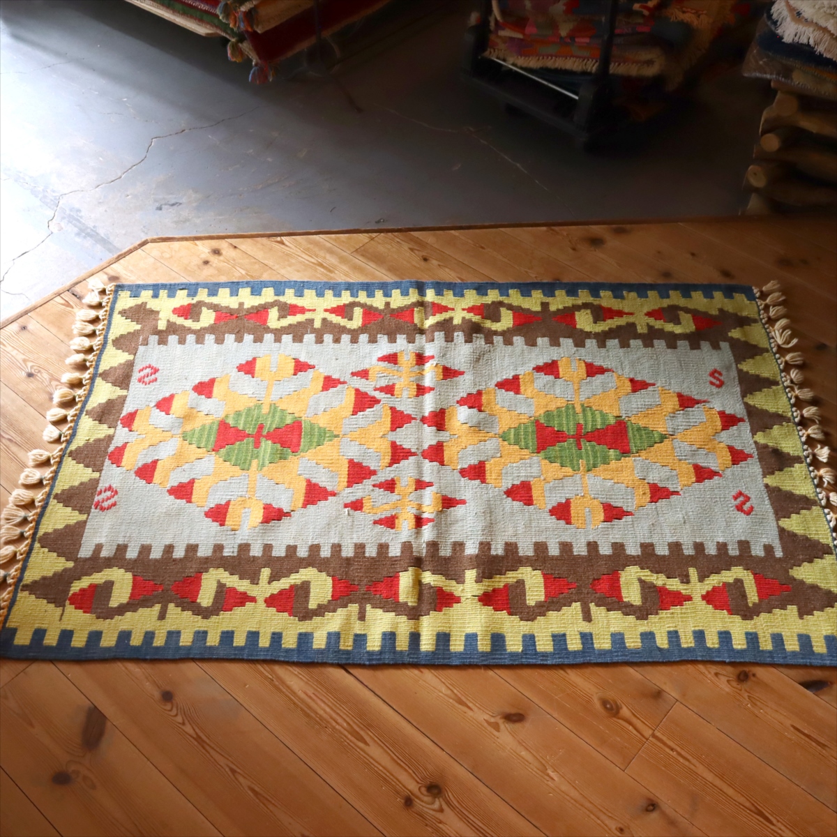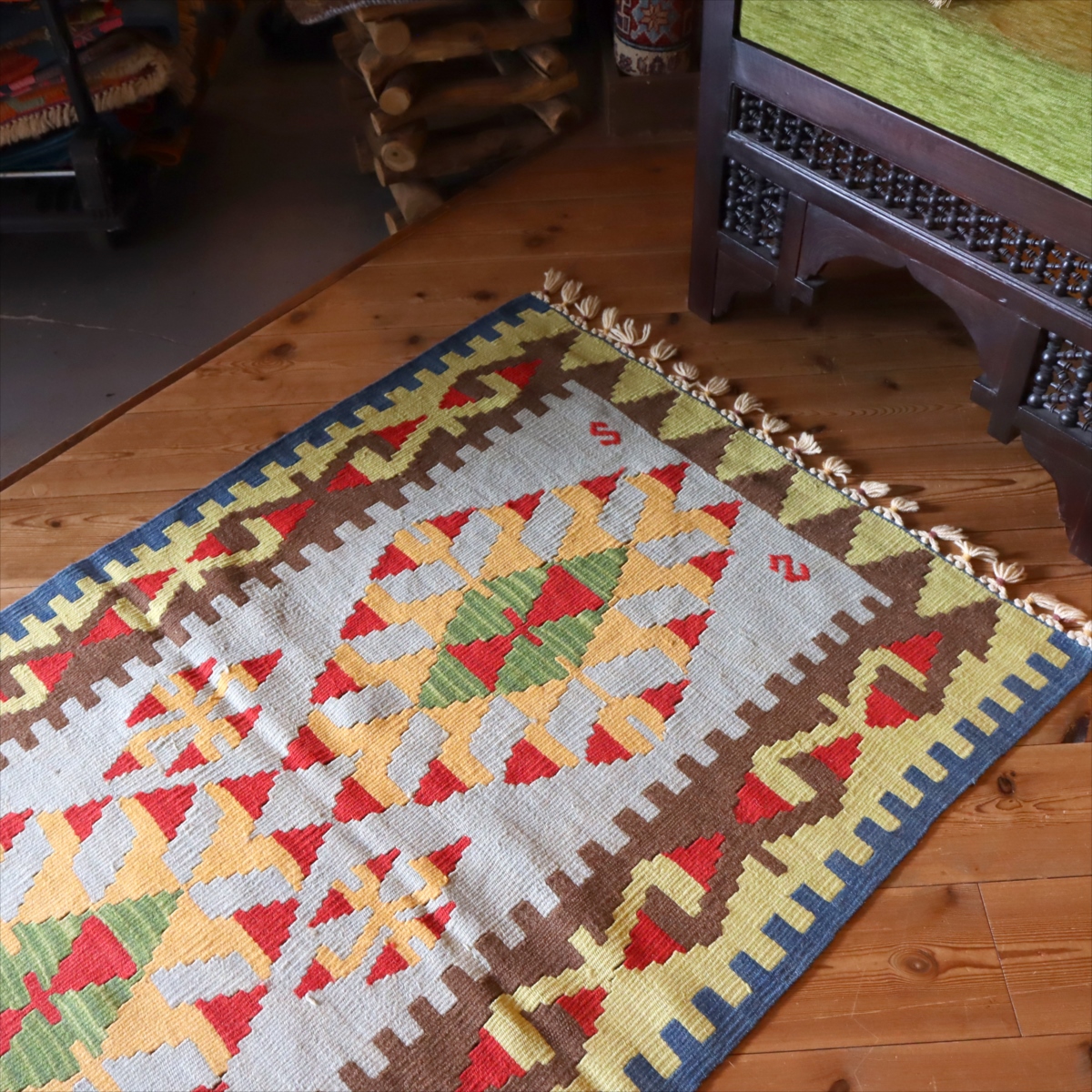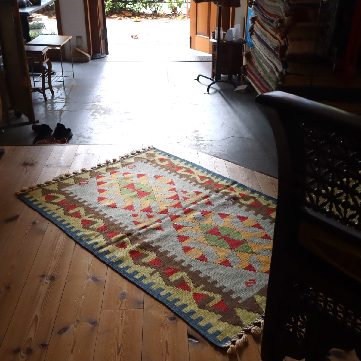 トルコキリムらしい伝統的なスタイルで織られているカイセリ産のキリムです。カイセリ地方は、トルコの中央部、カッパドキアに近く、古い時代から多くの諸品が集まり、現在でも絨毯やキリム産業の中心となっています。工業製品にはないあたたかさがあり、我が家のキリムとして愛着の持てる一枚になってくれます。