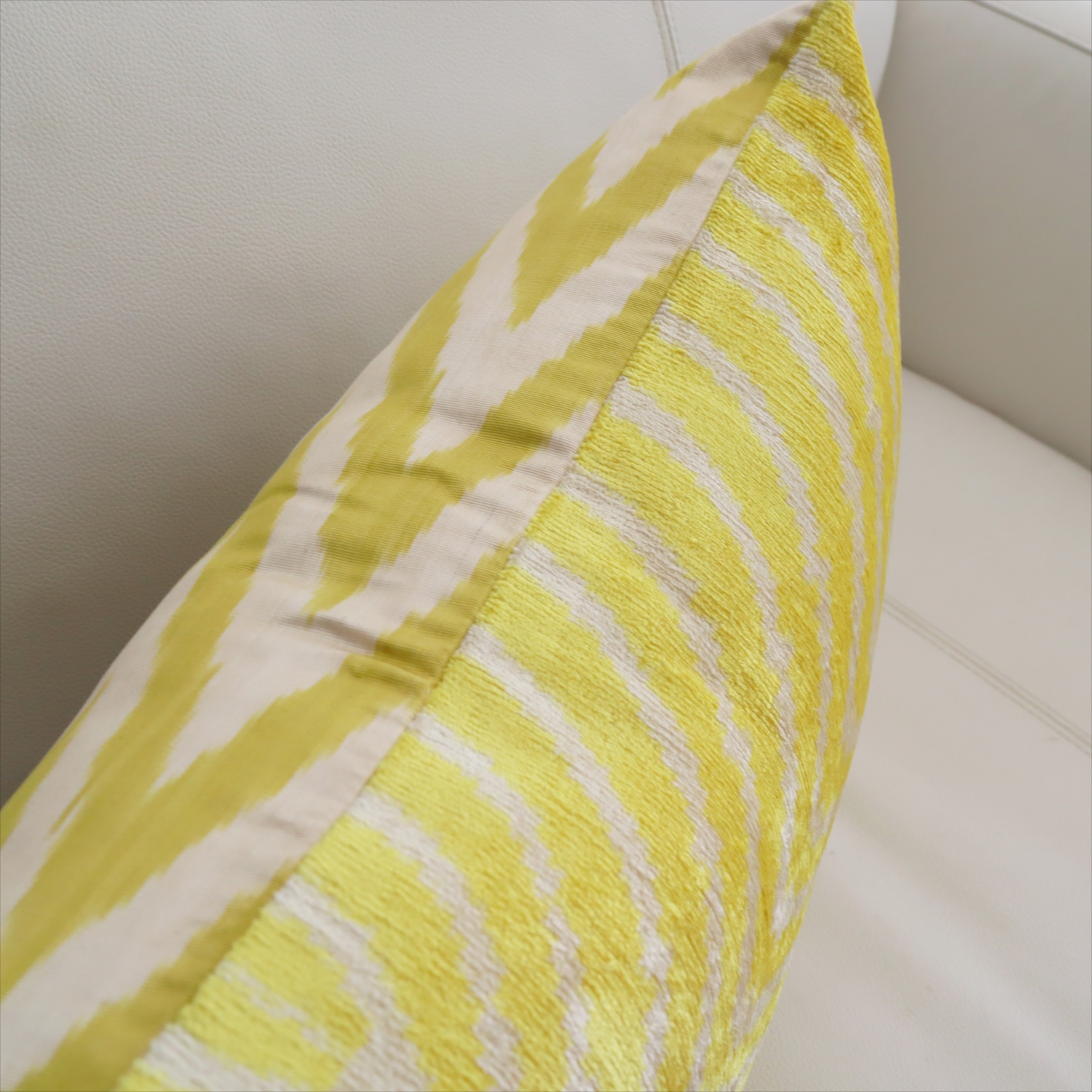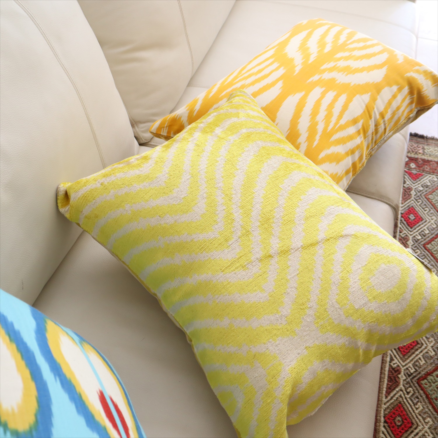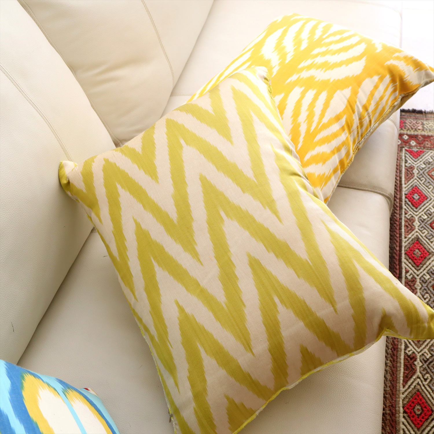 ウズベキスタンで「アトラス」と呼ばれる、中央アジアの女性たちの衣装用に織られた、手機織りの絣布(かすり・イカット)を使ったクッションカバー。
