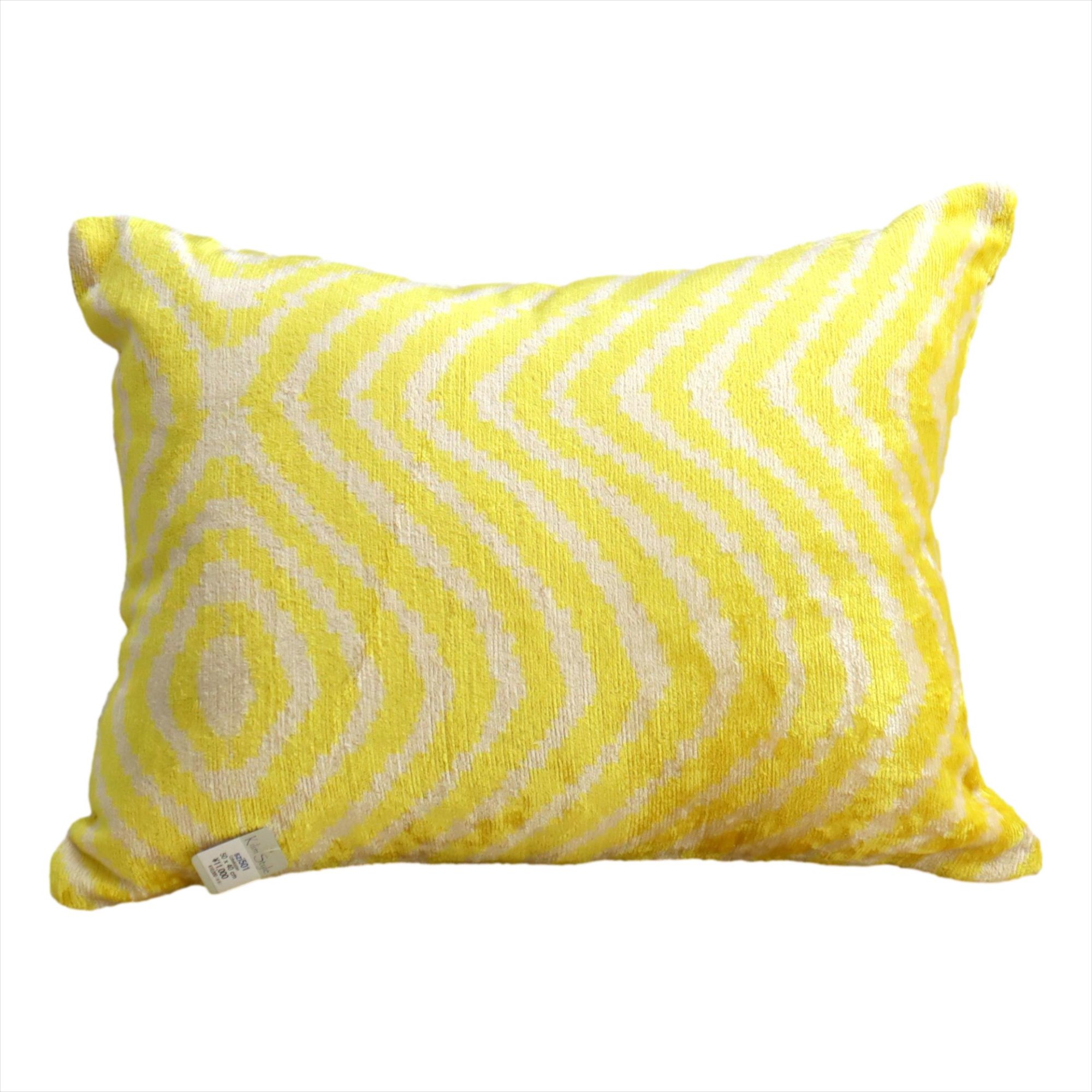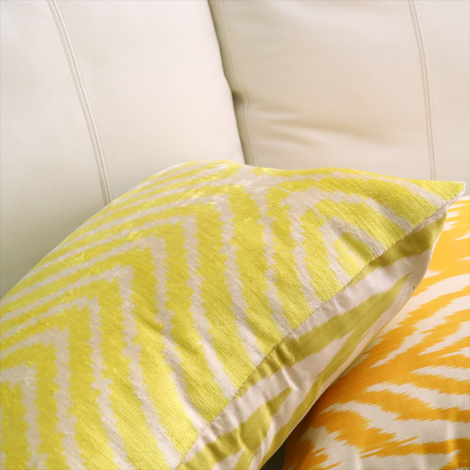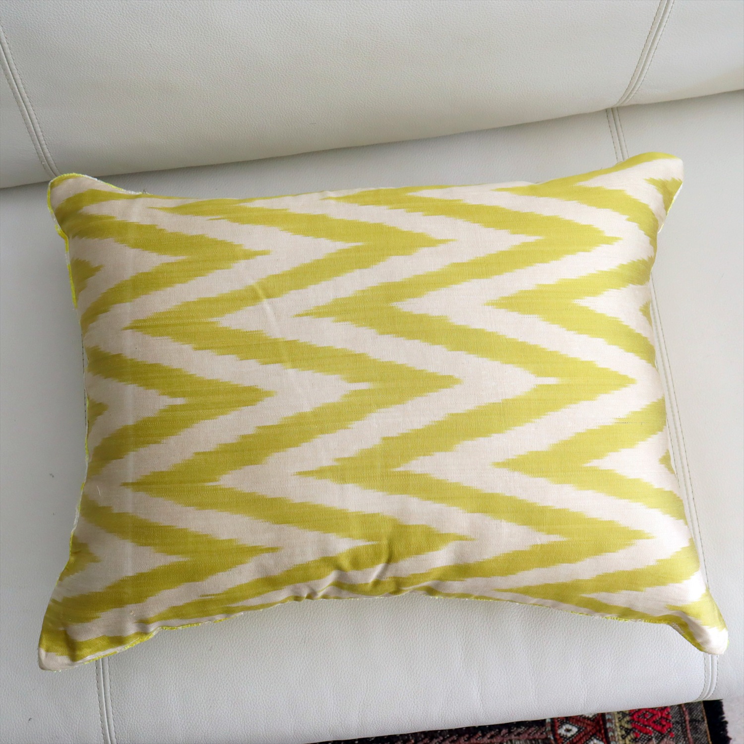 ウズベキスタンで「アトラス」と呼ばれる、中央アジアの女性たちの衣装用に織られた、手機織りの絣布(かすり・イカット)を使ったクッションカバー。