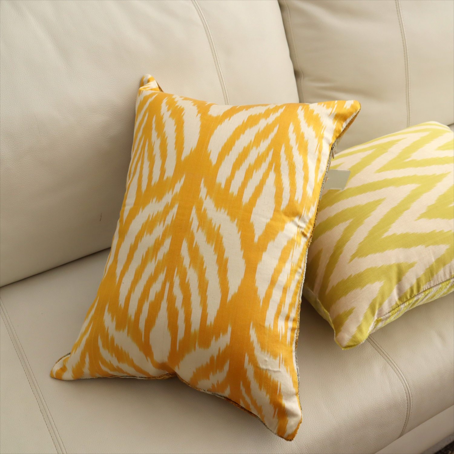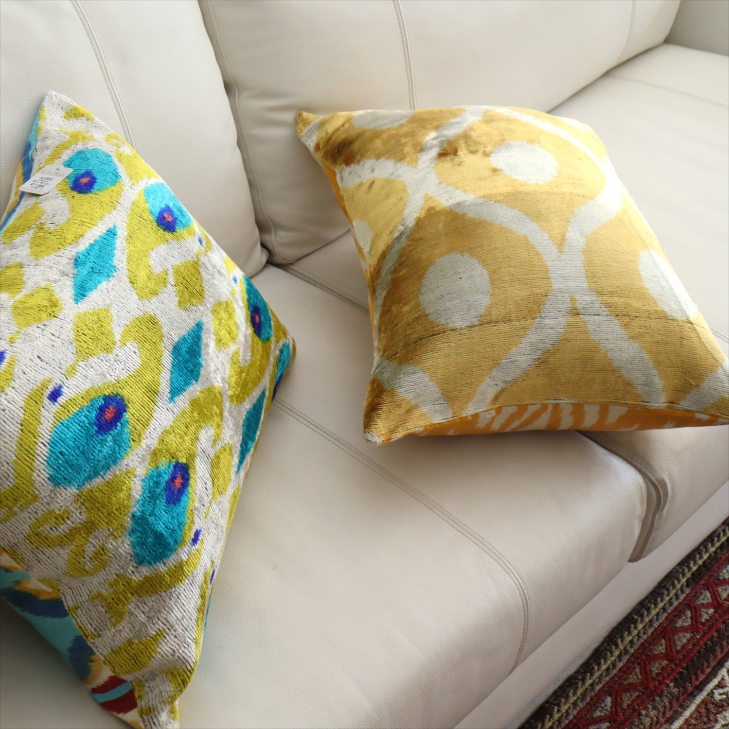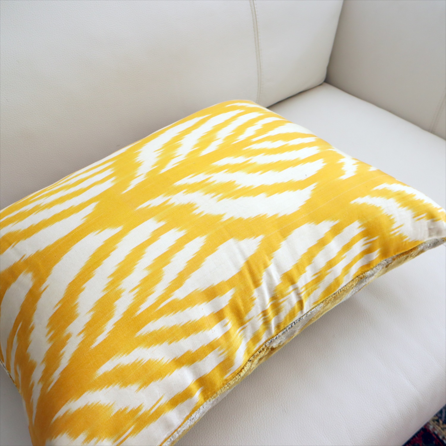 ウズベキスタンで「アトラス」と呼ばれる、中央アジアの女性たちの衣装用に織られた、手機織りの絣布(かすり・イカット)を使ったクッションカバー。