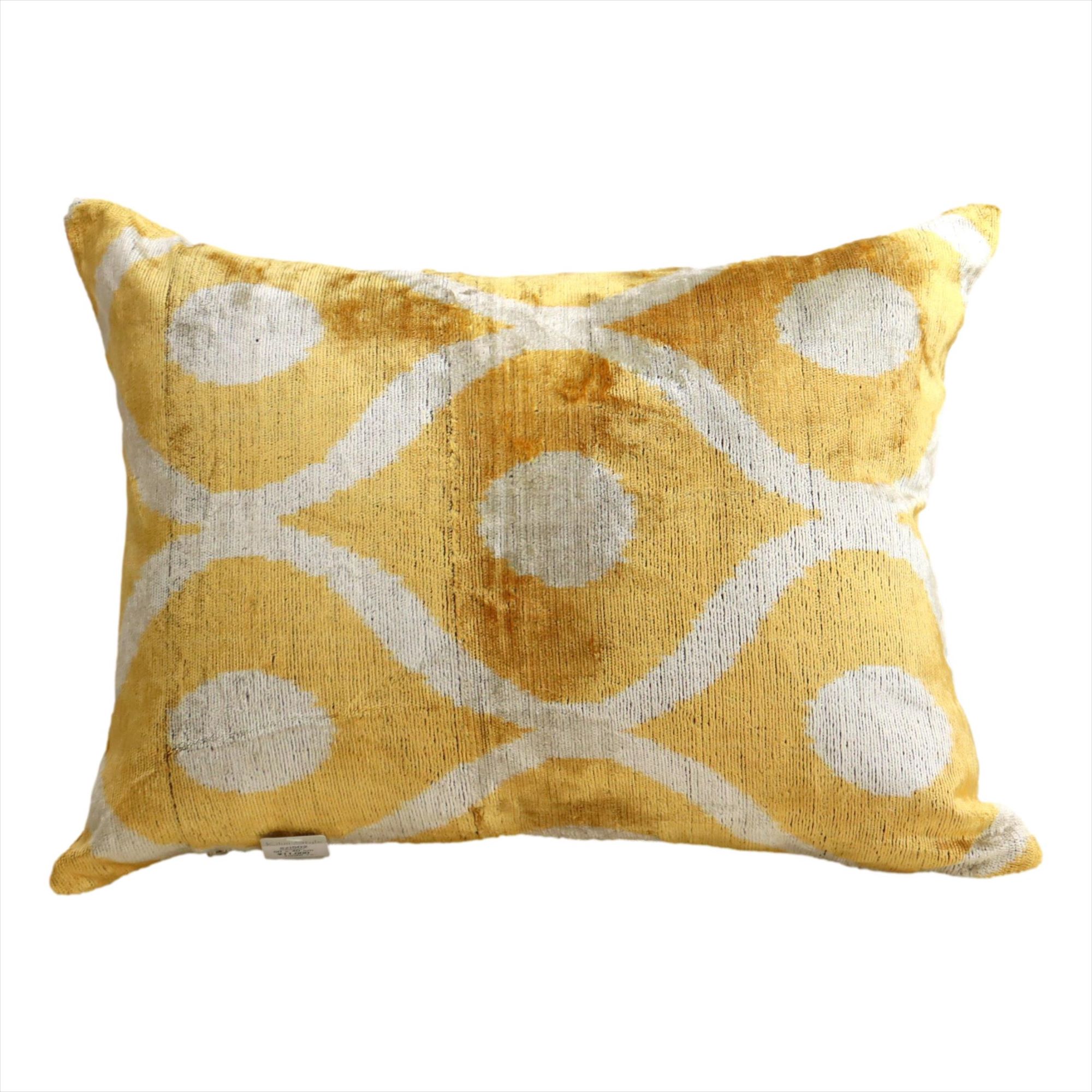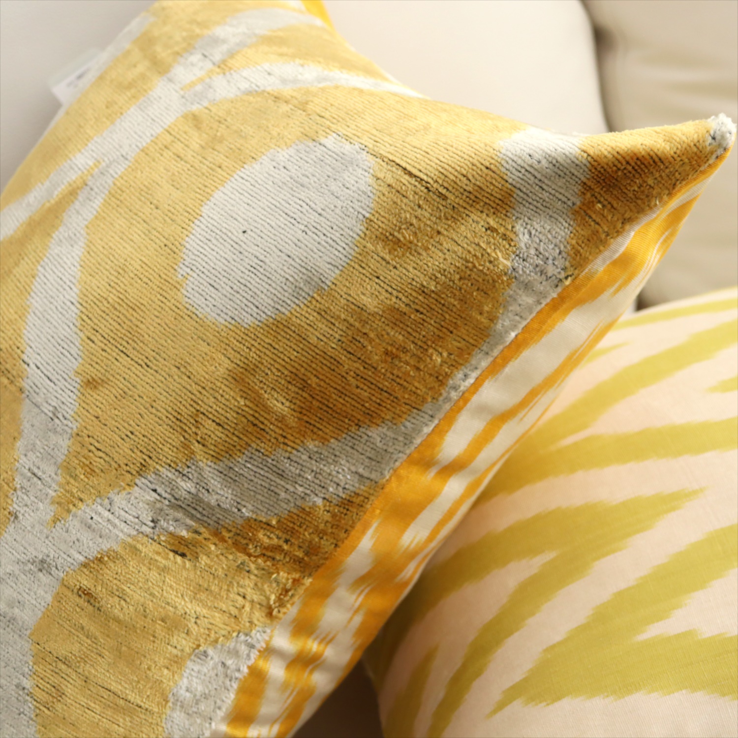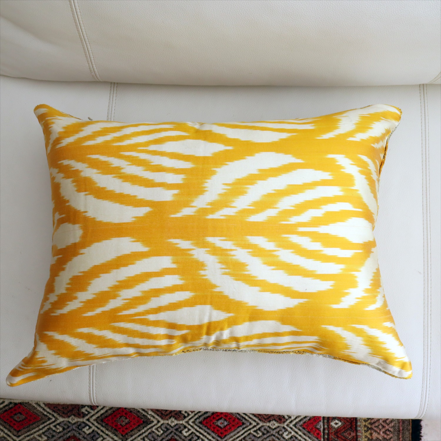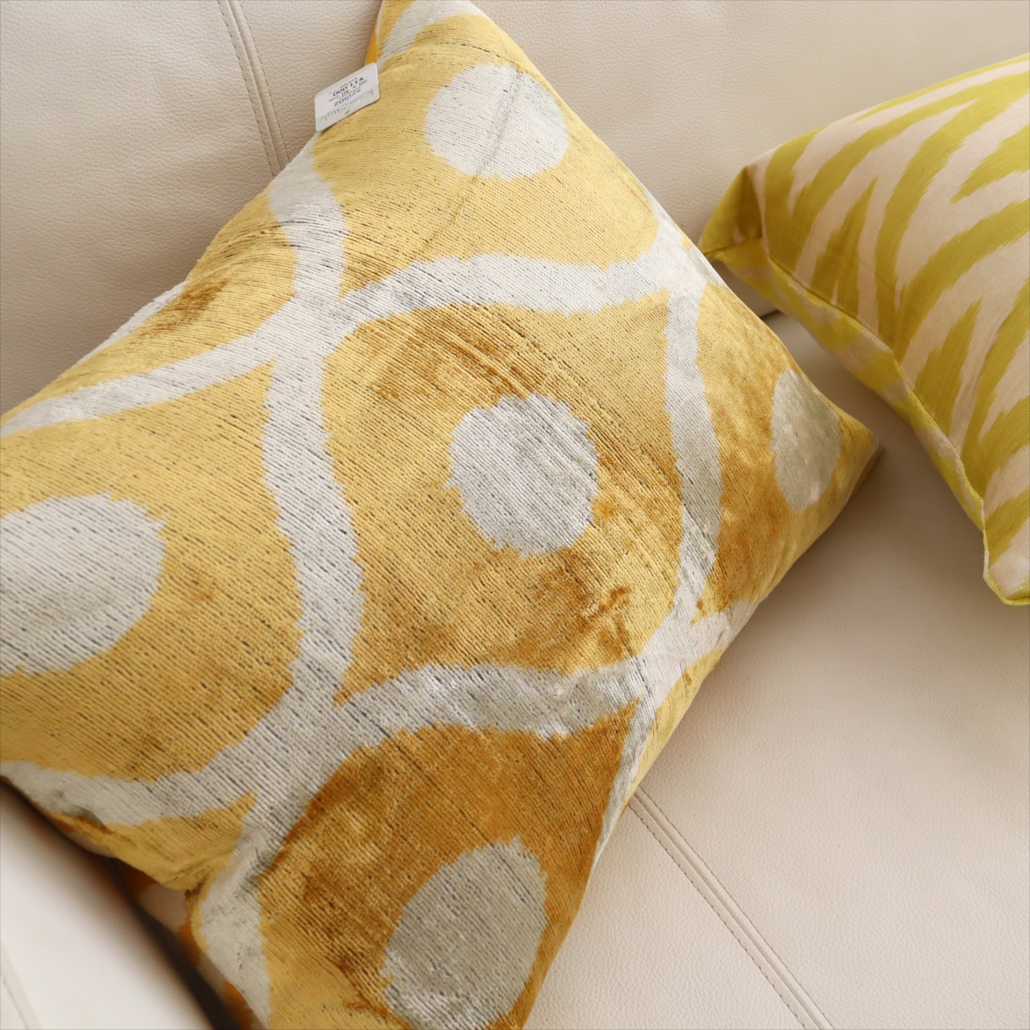 ウズベキスタンで「アトラス」と呼ばれる、中央アジアの女性たちの衣装用に織られた、手機織りの絣布(かすり・イカット)を使ったクッションカバー。