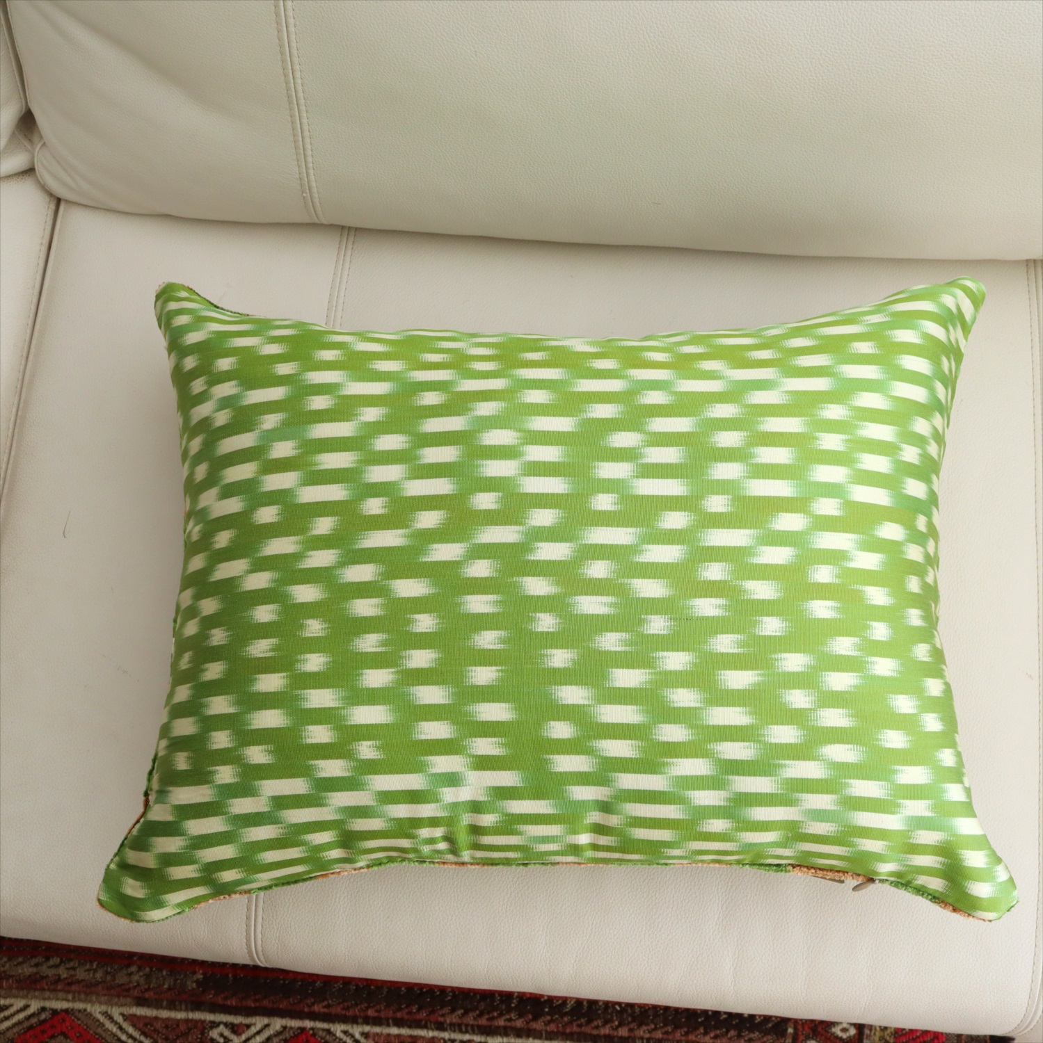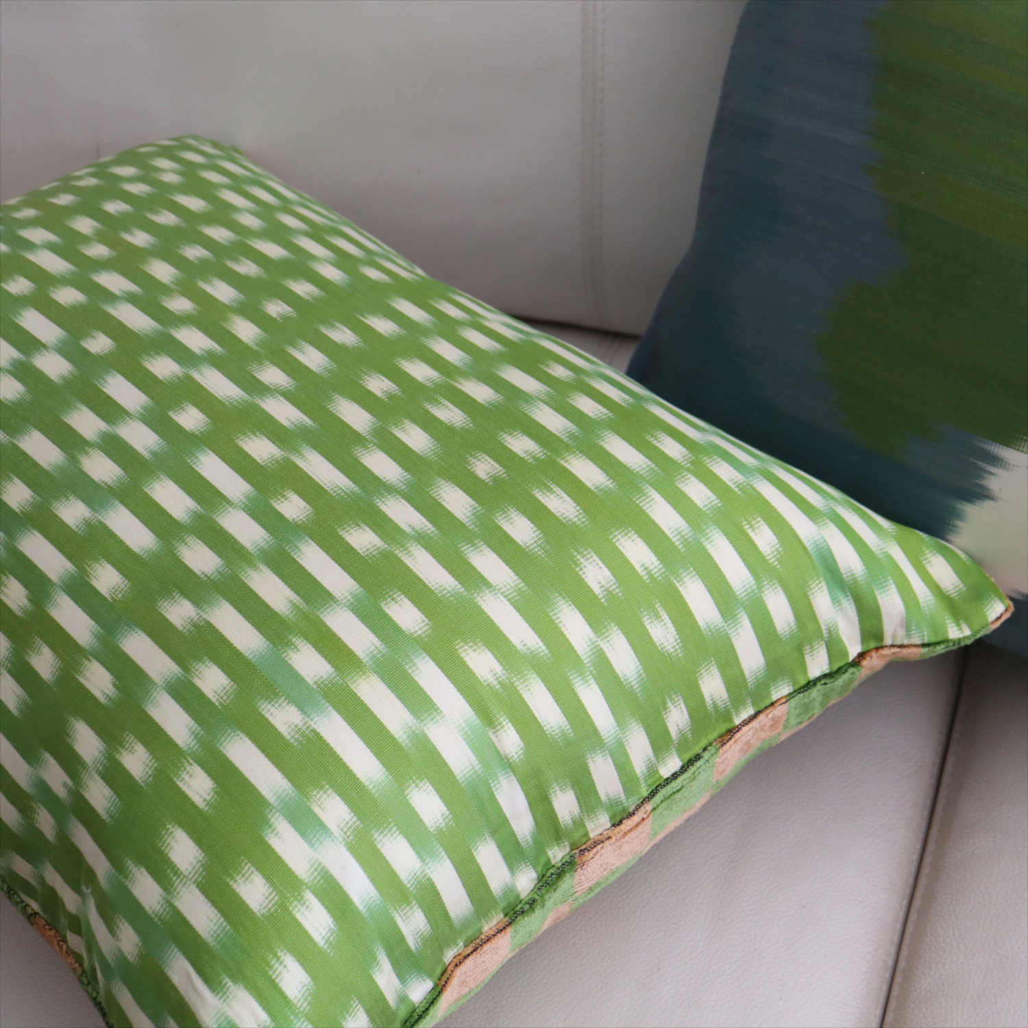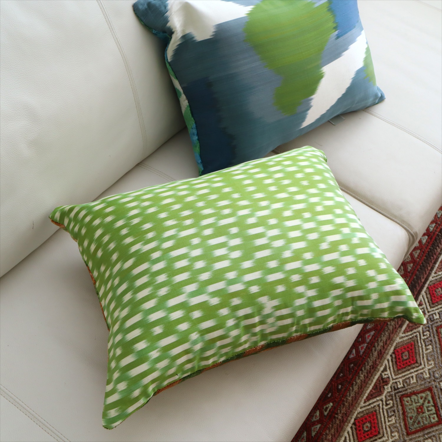 ウズベキスタンで「アトラス」と呼ばれる、中央アジアの女性たちの衣装用に織られた、手機織りの絣布(かすり・イカット)を使ったクッションカバー。