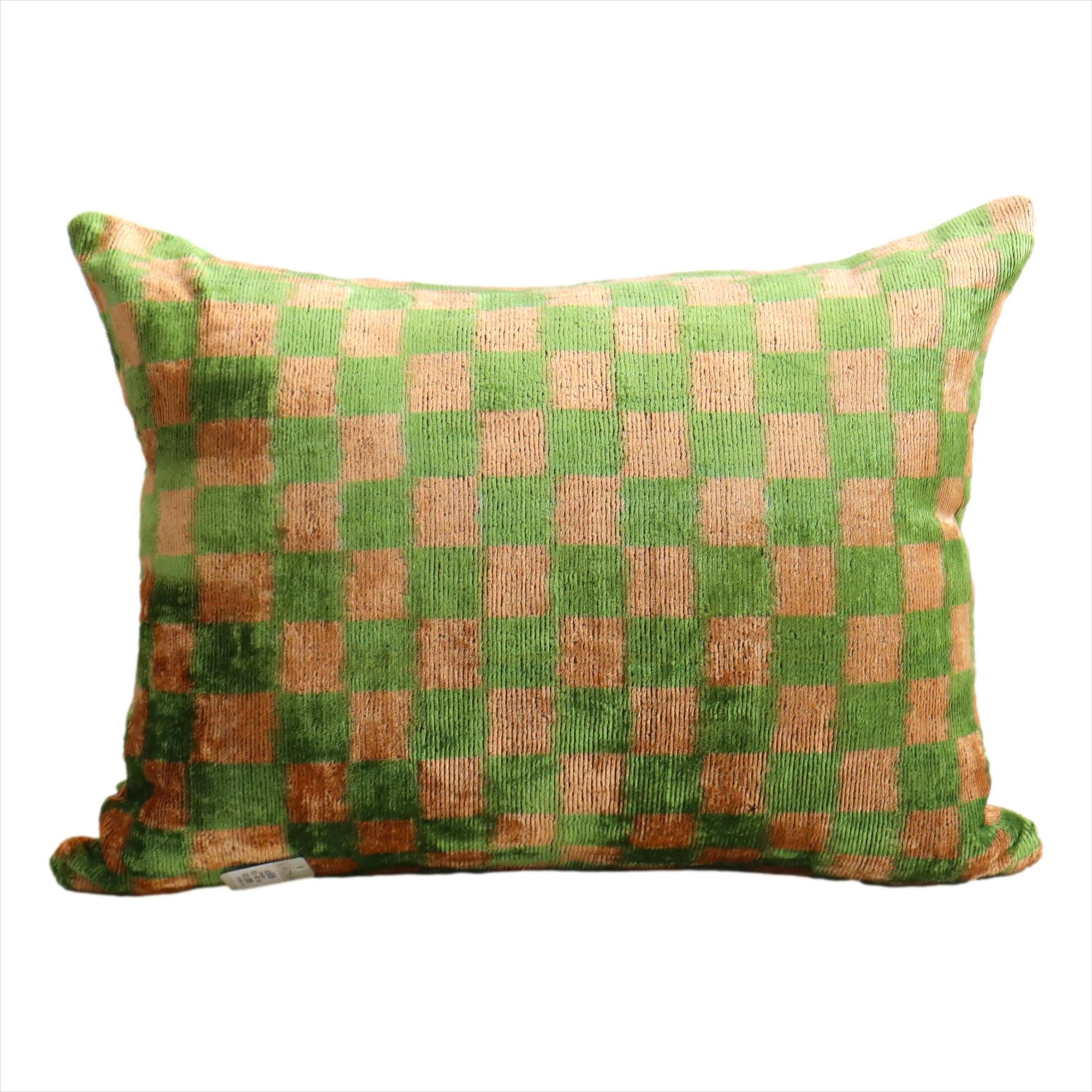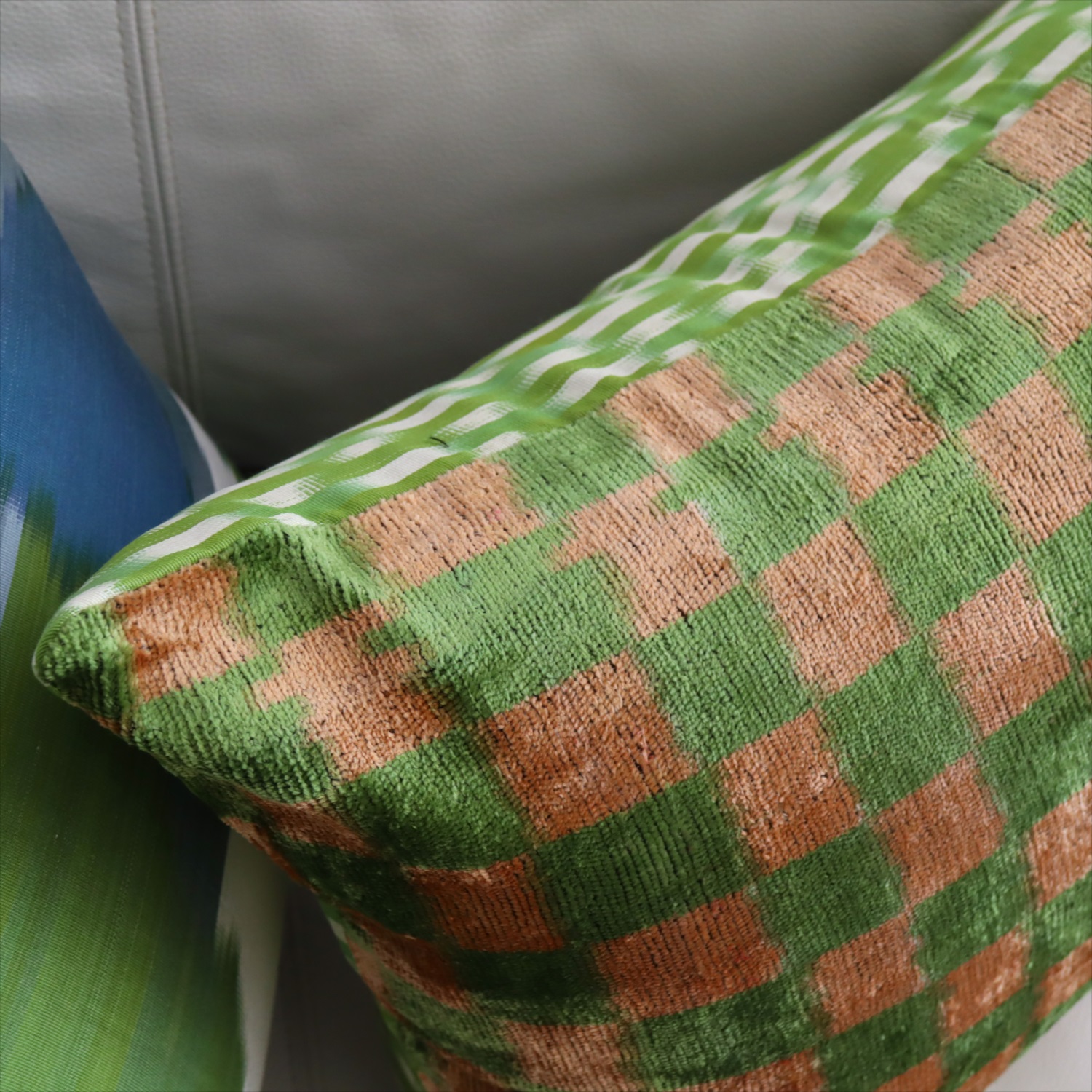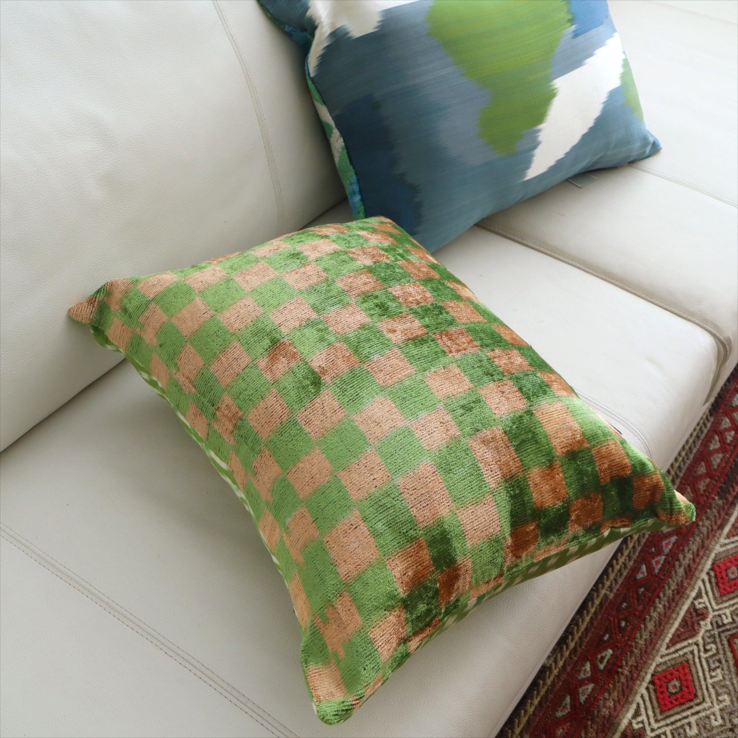 ウズベキスタンで「アトラス」と呼ばれる、中央アジアの女性たちの衣装用に織られた、手機織りの絣布(かすり・イカット)を使ったクッションカバー。