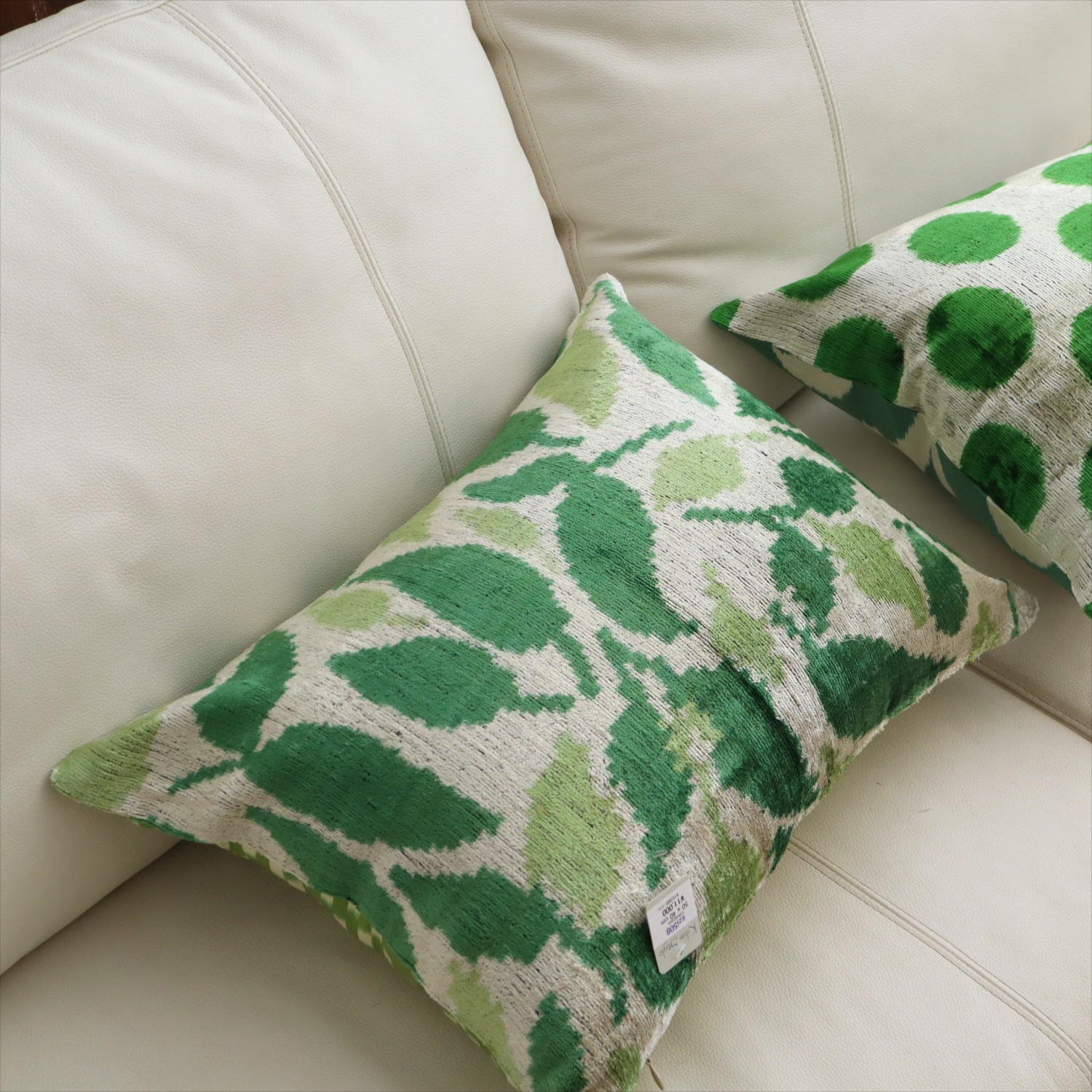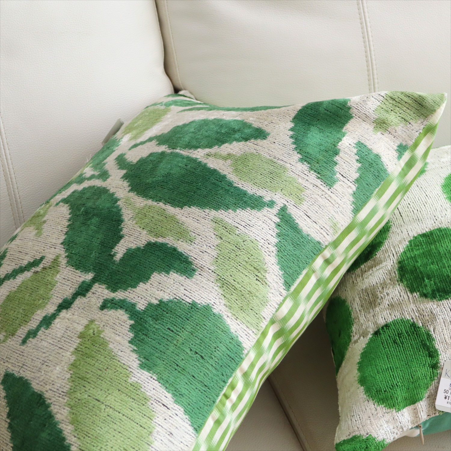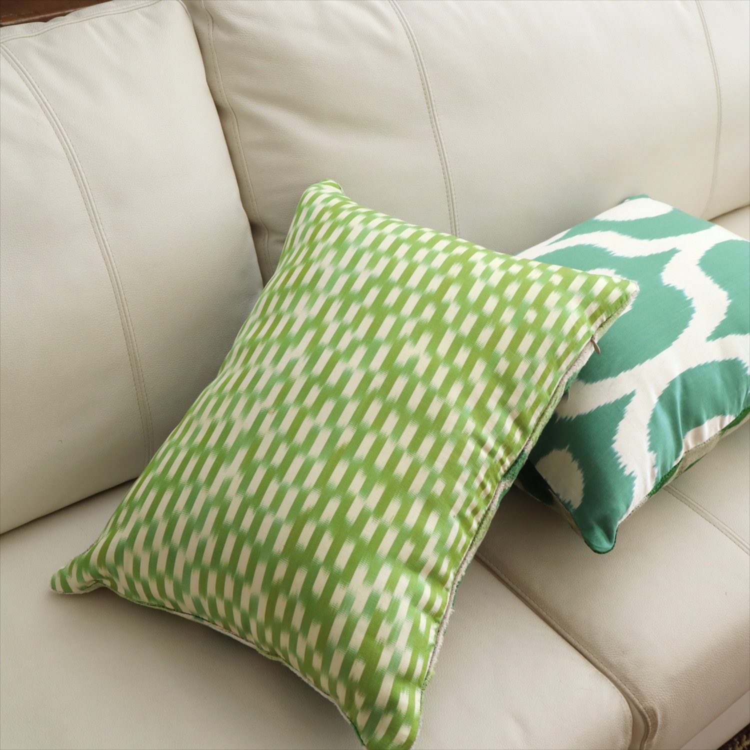 ウズベキスタンで「アトラス」と呼ばれる、中央アジアの女性たちの衣装用に織られた、手機織りの絣布(かすり・イカット)を使ったクッションカバー。