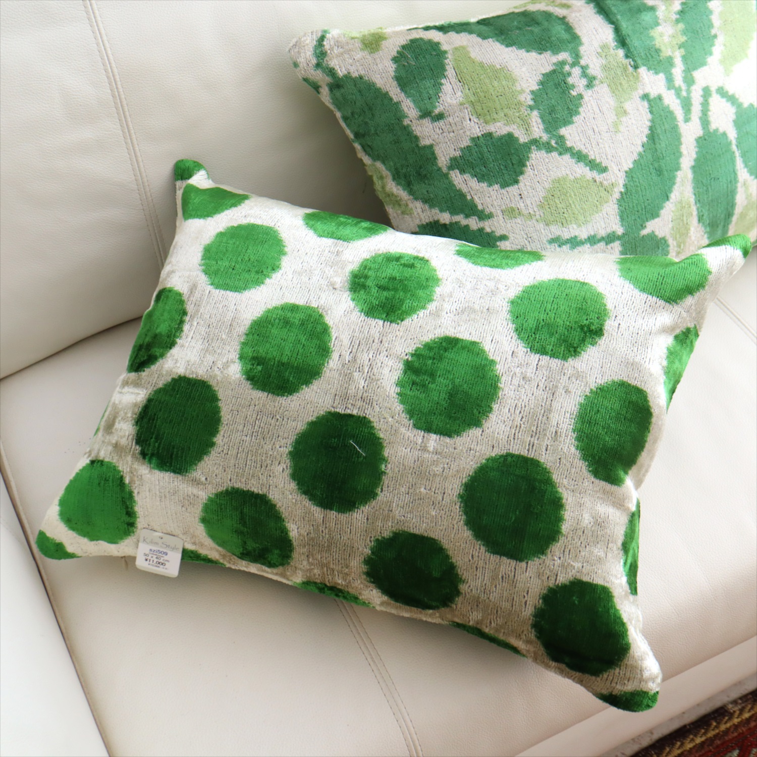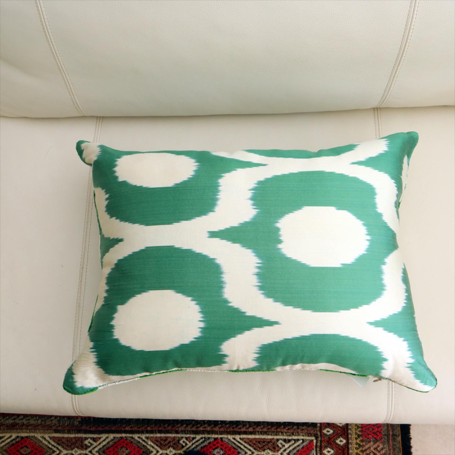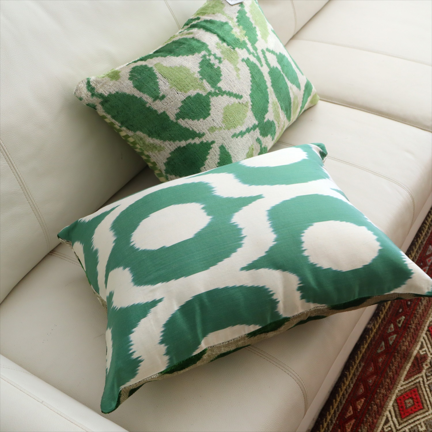 ウズベキスタンで「アトラス」と呼ばれる、中央アジアの女性たちの衣装用に織られた、手機織りの絣布(かすり・イカット)を使ったクッションカバー。