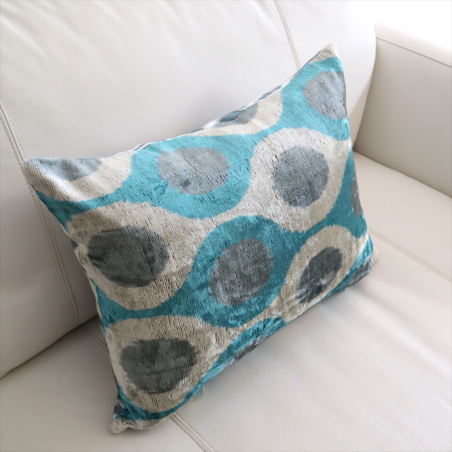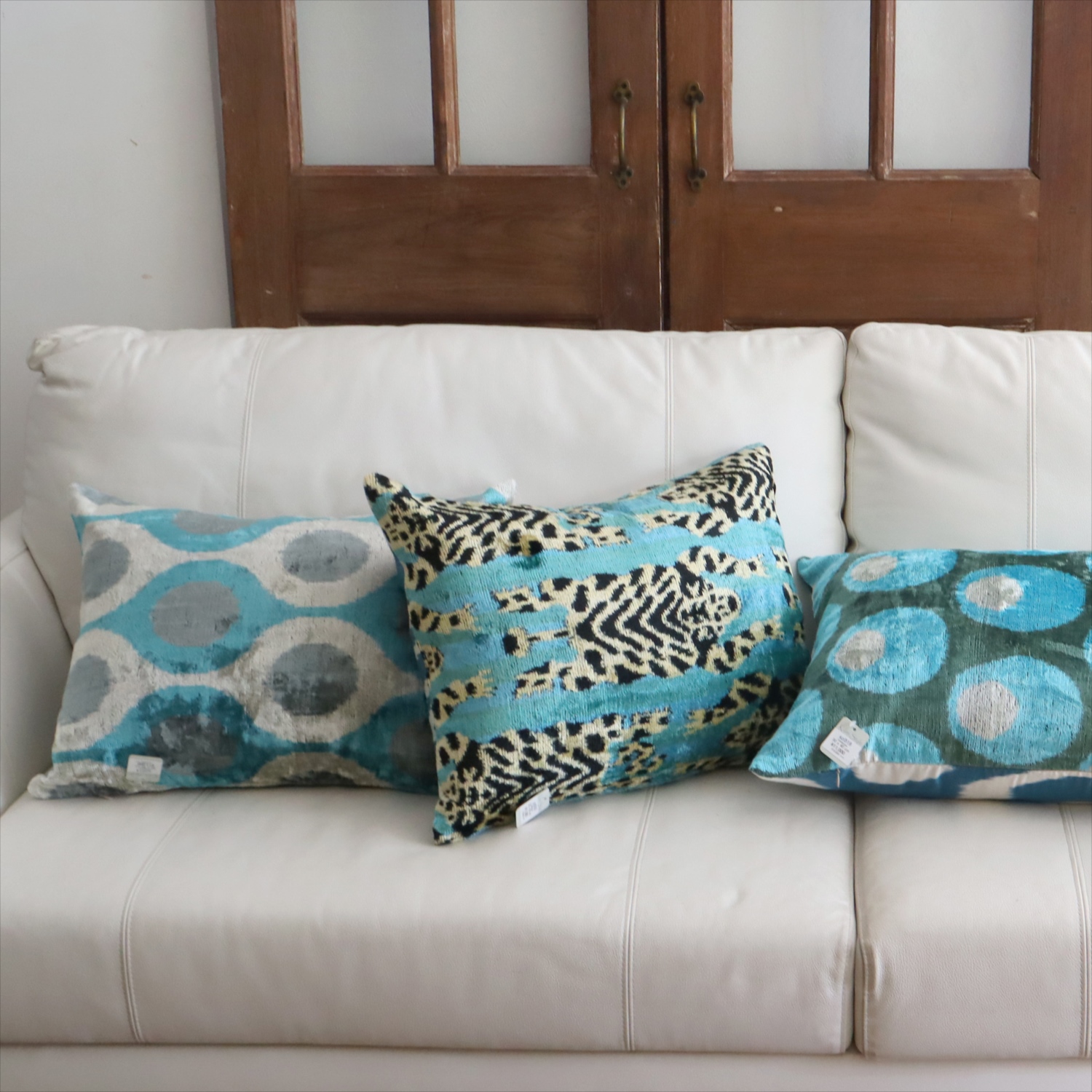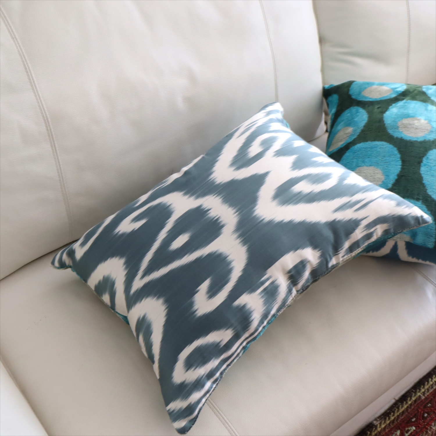 ウズベキスタンで「アトラス」と呼ばれる、中央アジアの女性たちの衣装用に織られた、手機織りの絣布(かすり・イカット)を使ったクッションカバー。