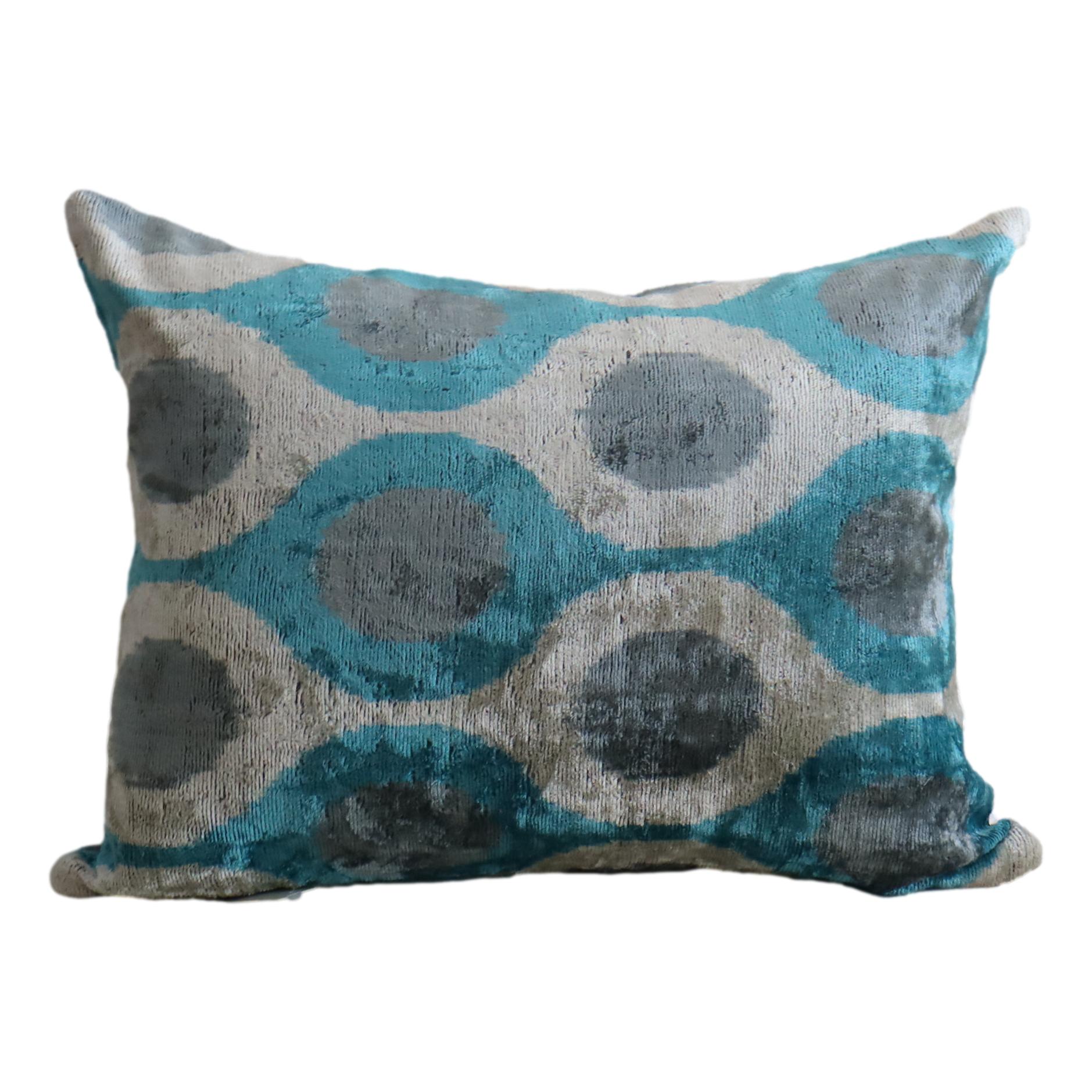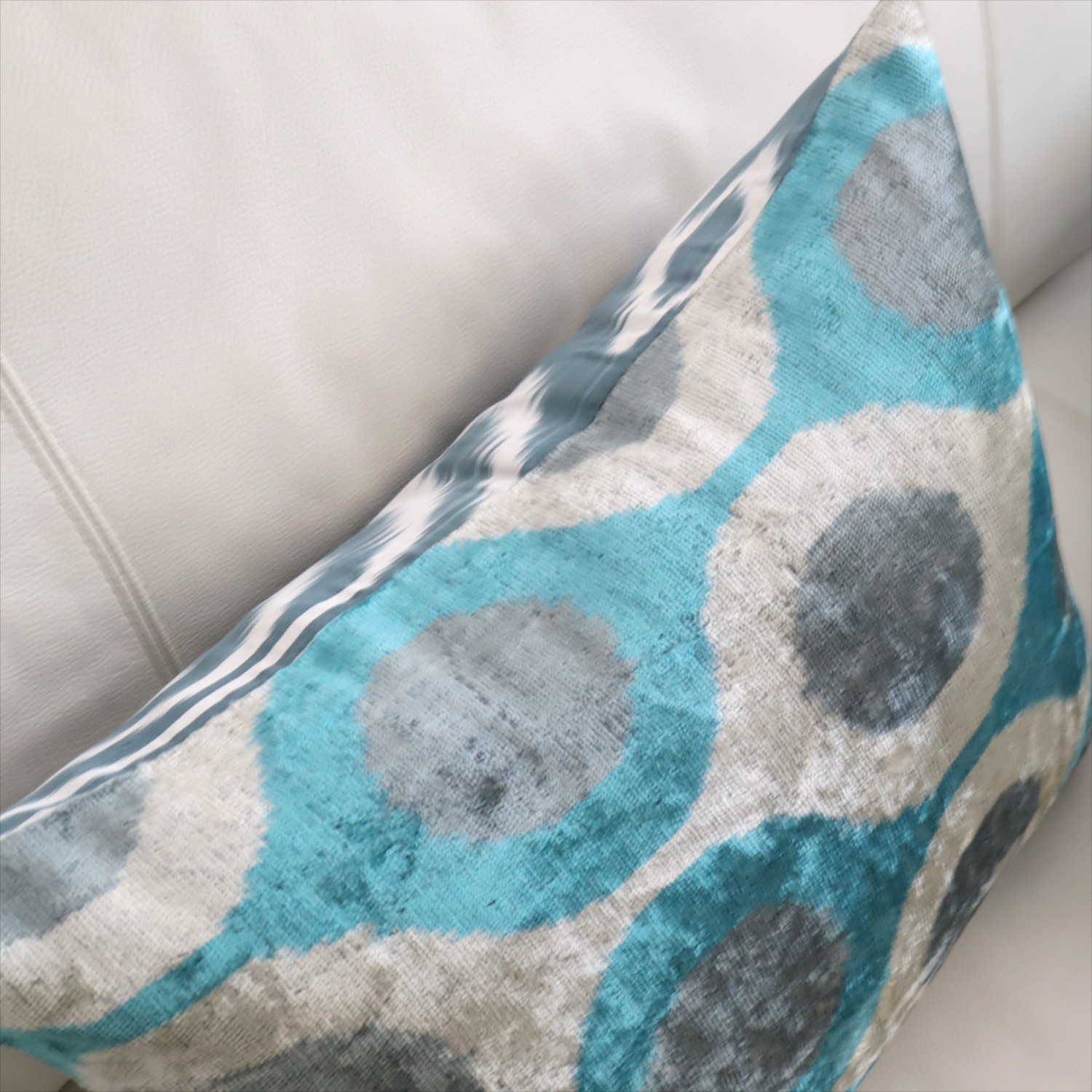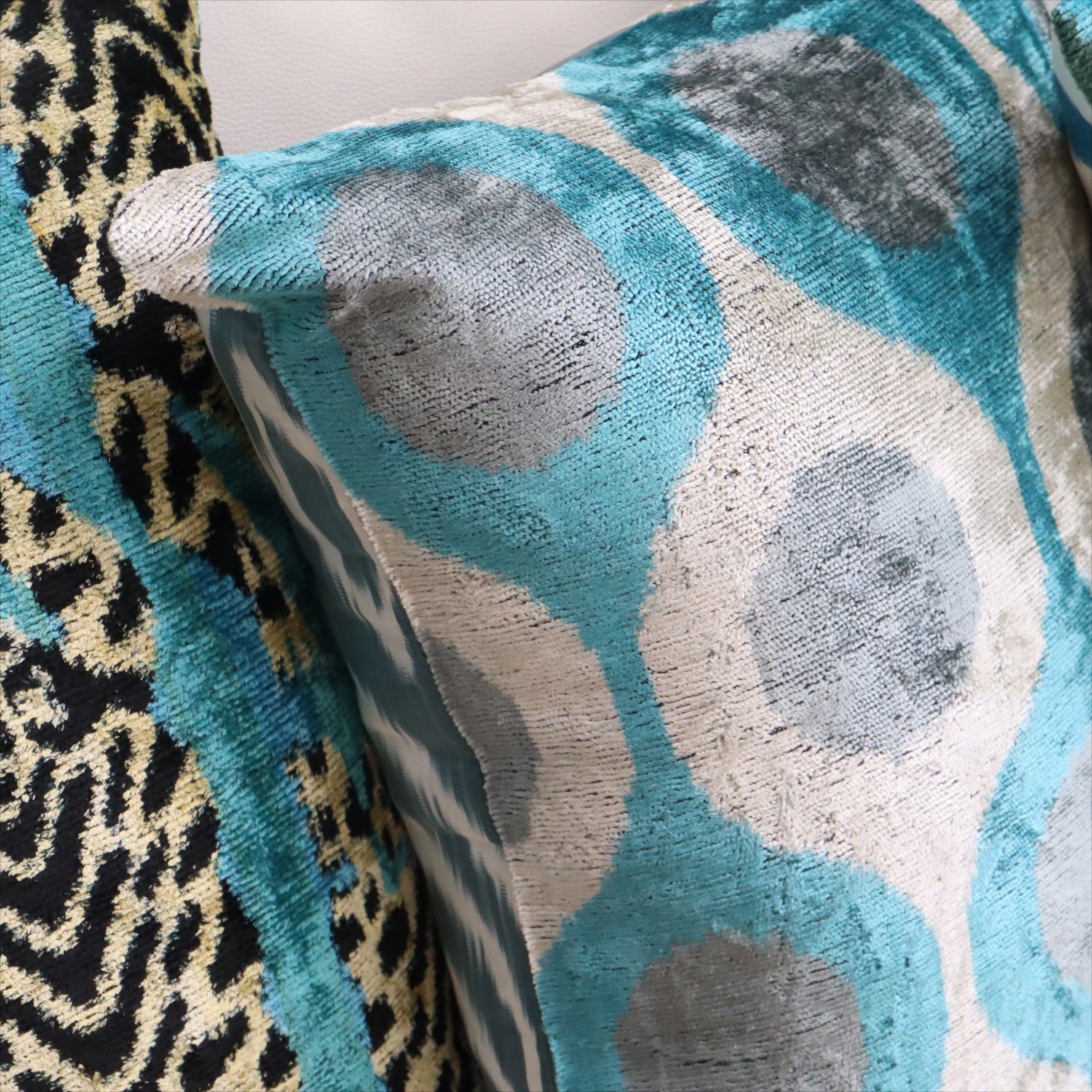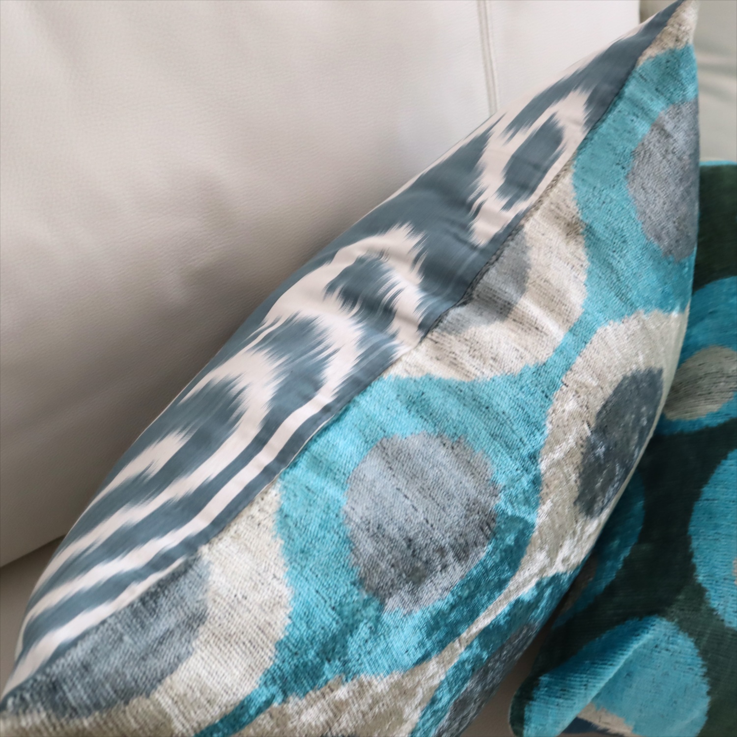 ウズベキスタンで「アトラス」と呼ばれる、中央アジアの女性たちの衣装用に織られた、手機織りの絣布(かすり・イカット)を使ったクッションカバー。