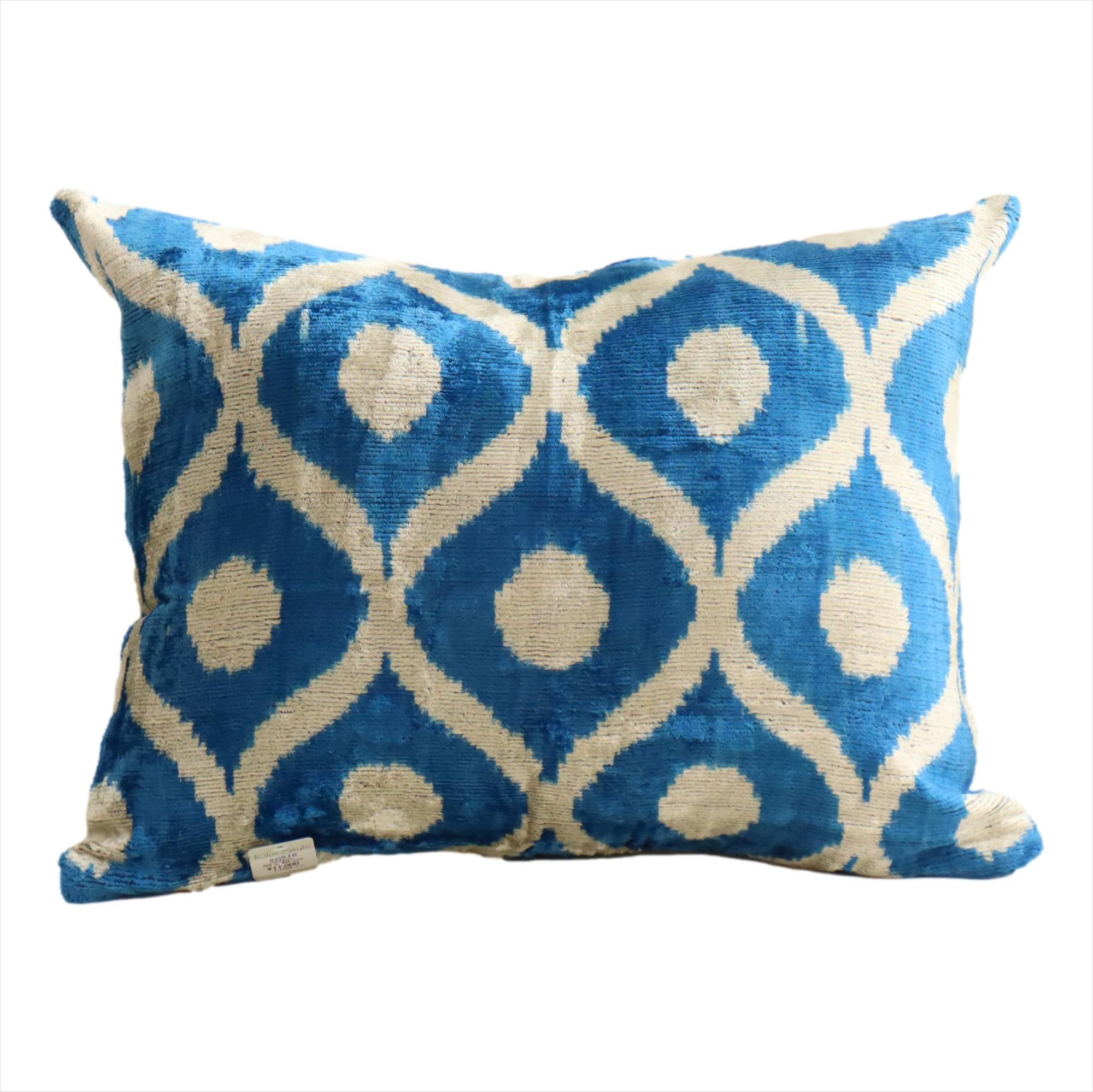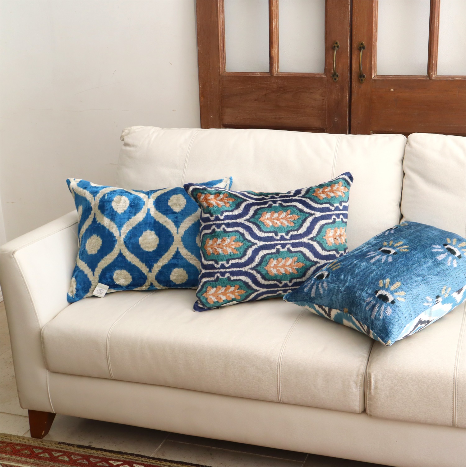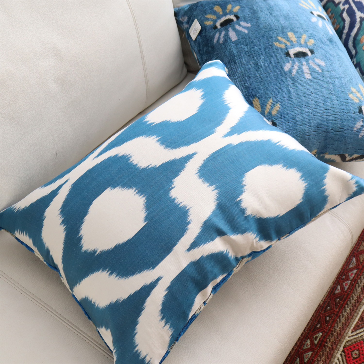ウズベキスタンで「アトラス」と呼ばれる、中央アジアの女性たちの衣装用に織られた、手機織りの絣布(かすり・イカット)を使ったクッションカバー。