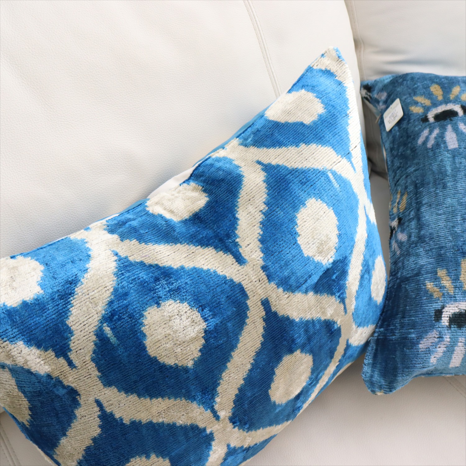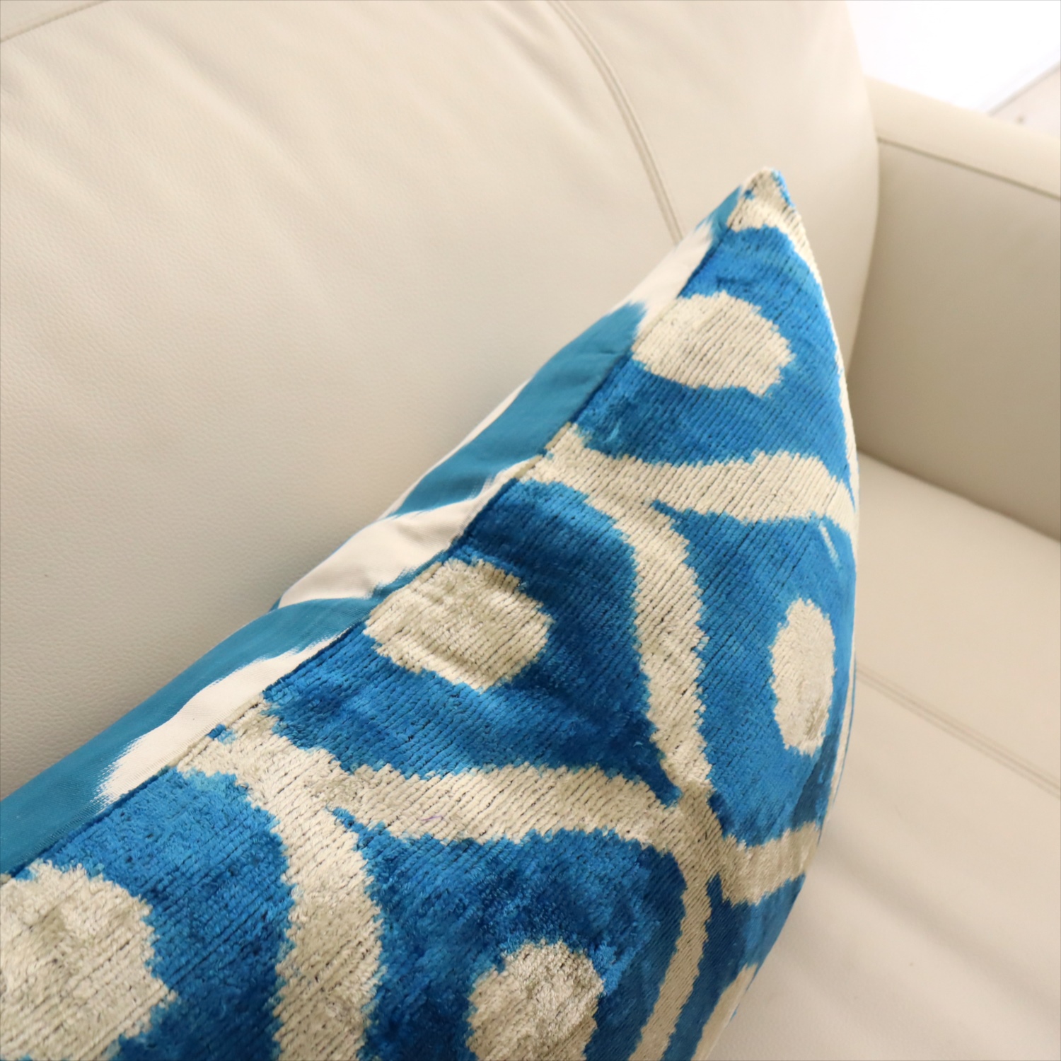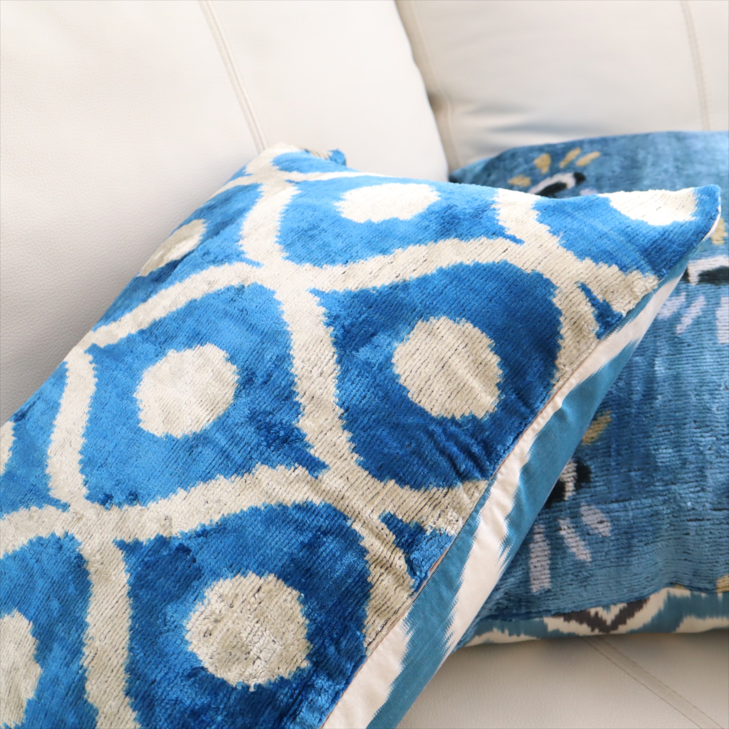 ウズベキスタンで「アトラス」と呼ばれる、中央アジアの女性たちの衣装用に織られた、手機織りの絣布(かすり・イカット)を使ったクッションカバー。