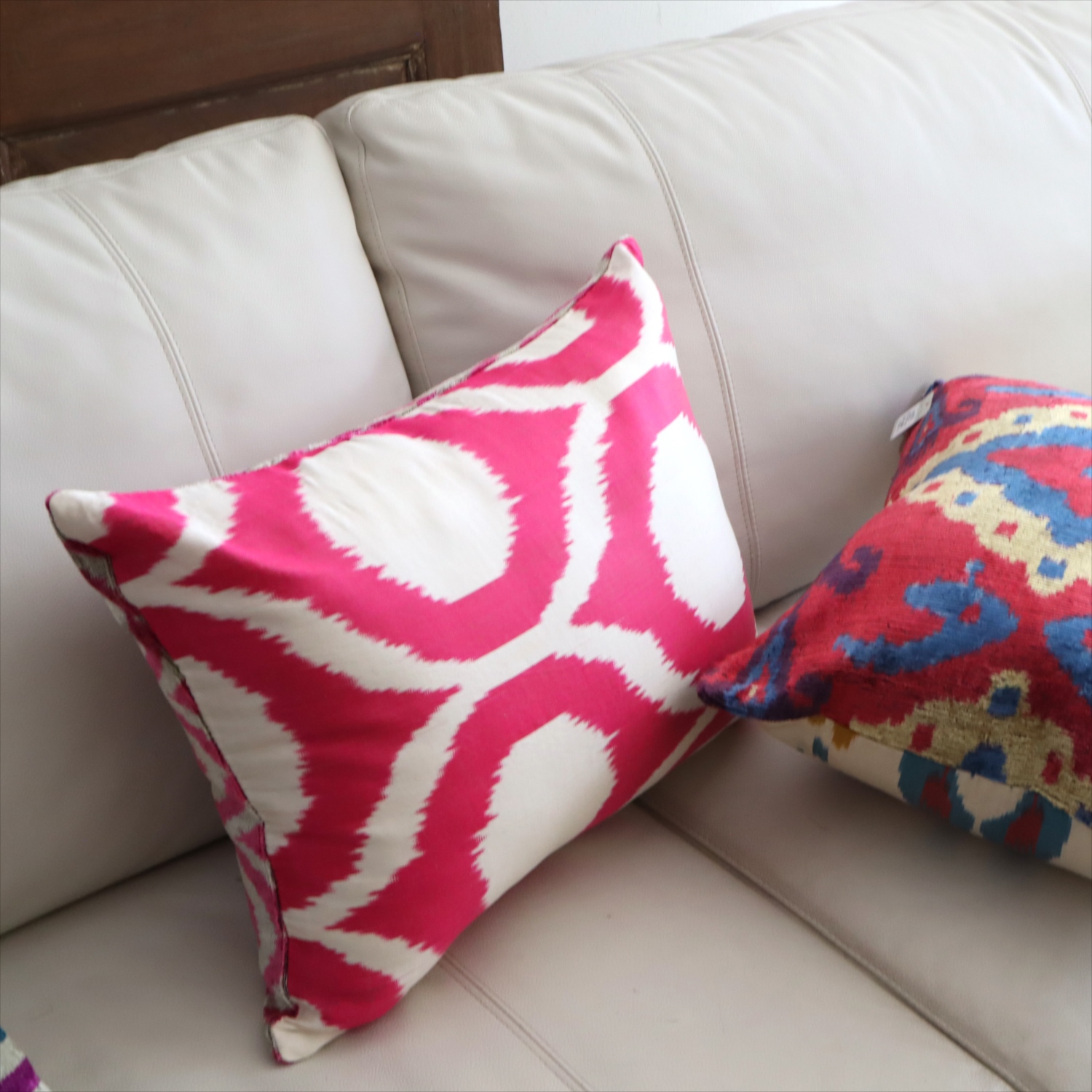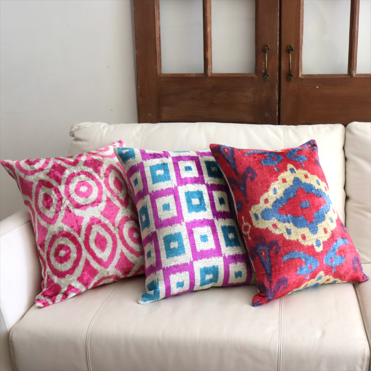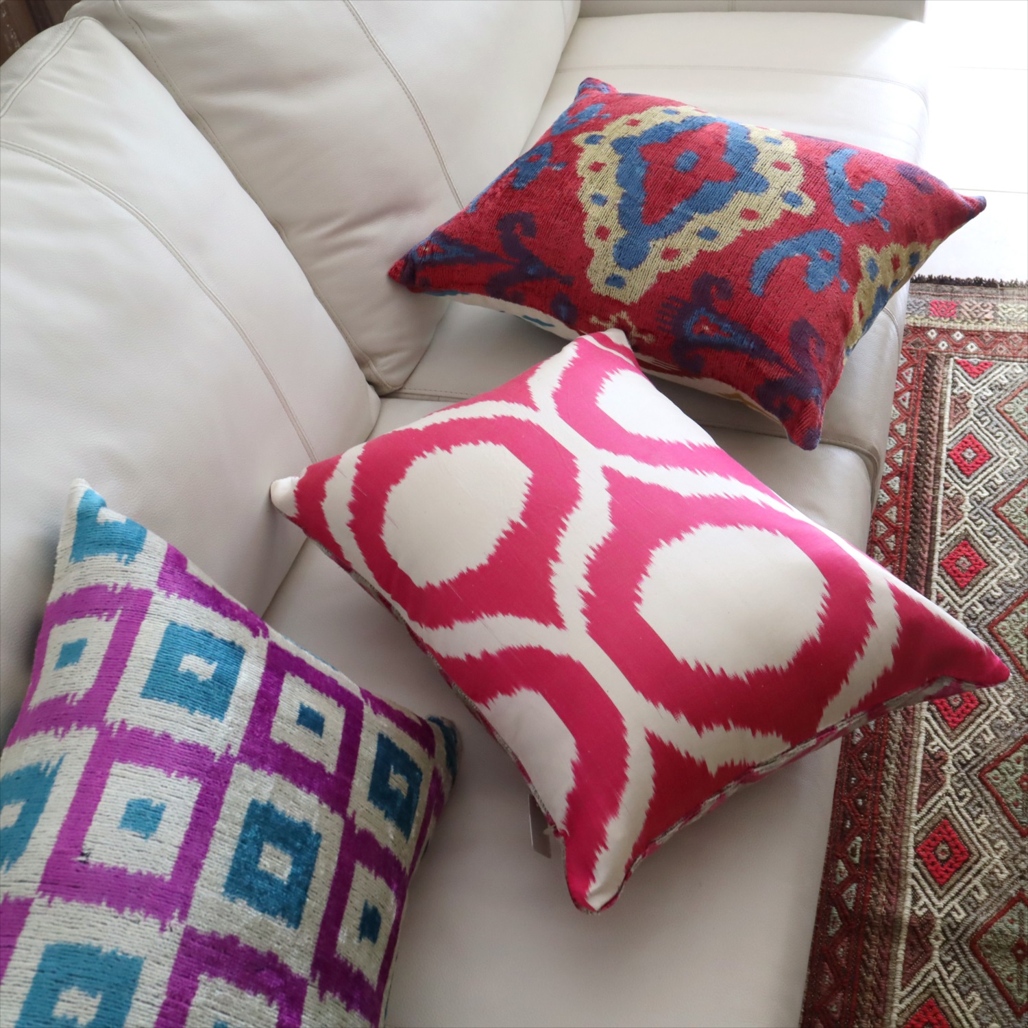 ウズベキスタンで「アトラス」と呼ばれる、中央アジアの女性たちの衣装用に織られた、手機織りの絣布(かすり・イカット)を使ったクッションカバー。