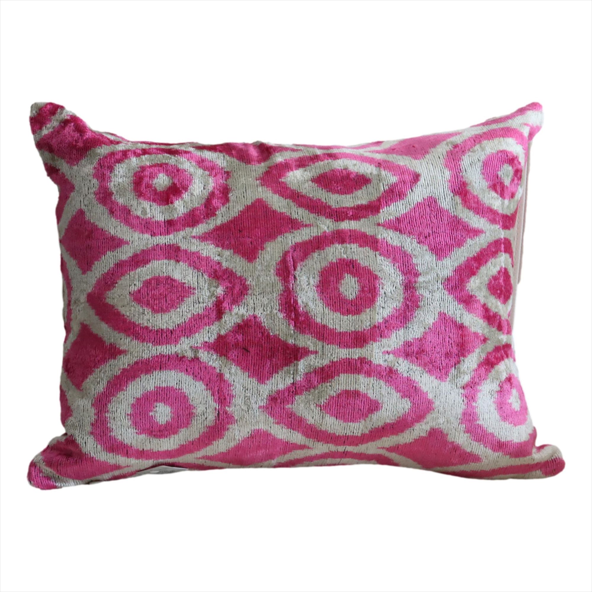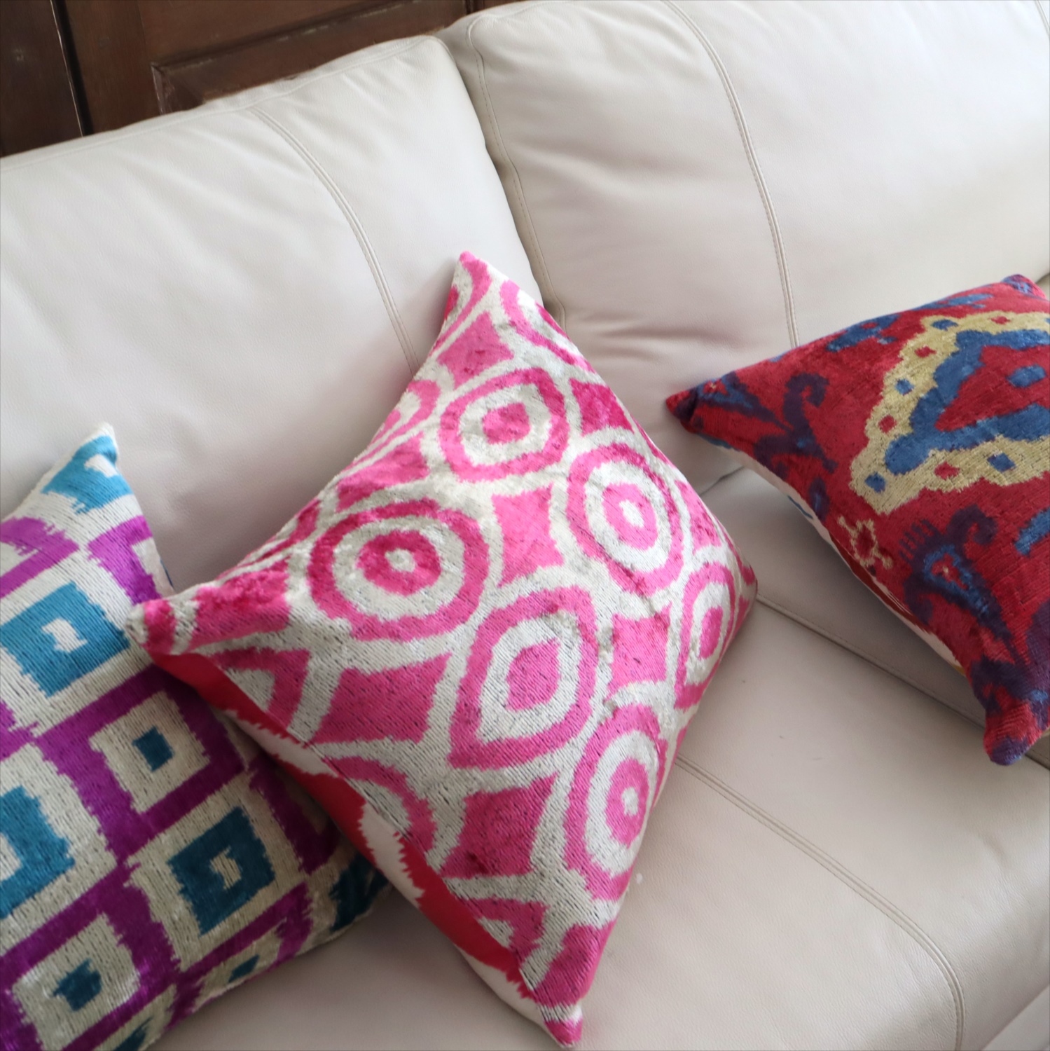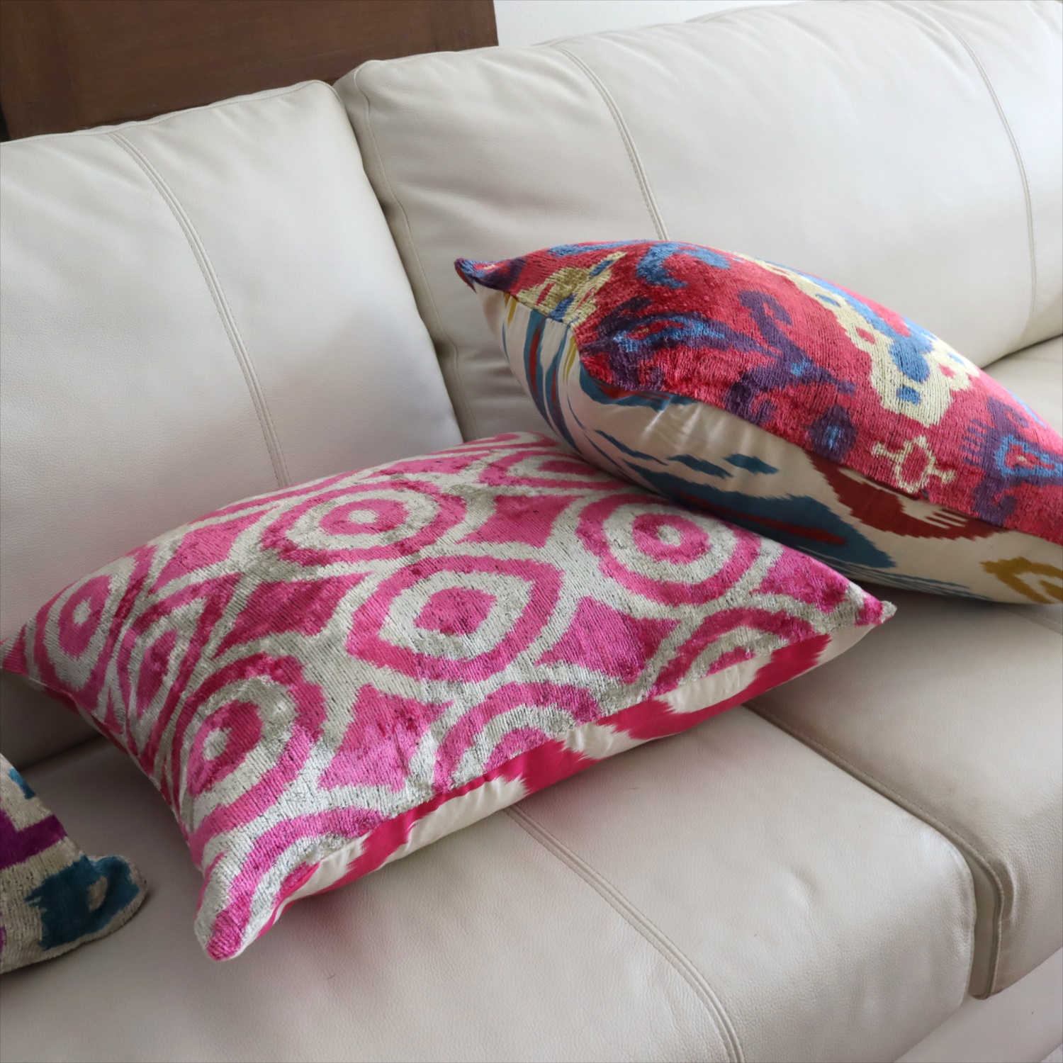 ウズベキスタンで「アトラス」と呼ばれる、中央アジアの女性たちの衣装用に織られた、手機織りの絣布(かすり・イカット)を使ったクッションカバー。